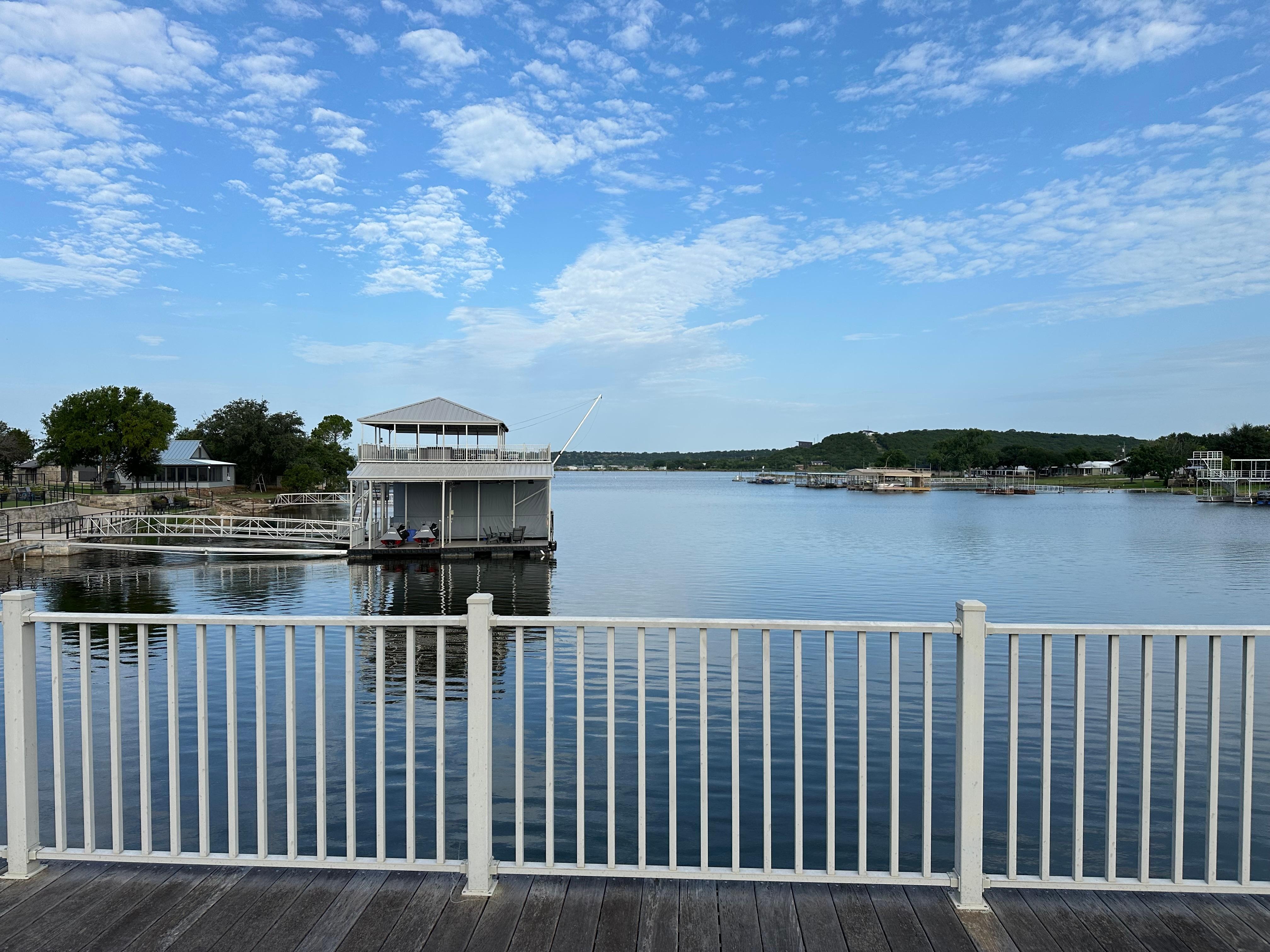 DEEP WATER/NO WAKE ZONE! Lakefront home, beautifully situated on .66 acres privately gated, double deck dock with dive platform, porch swing and chairs/chaise loungers on double dock, single slip boat dock (not available unless staying for extended period of time and cleared with home owner), no wake zone, open floor plan, stone indoor and outdoor fireplaces, gas fire pit coffee table, outdoor gas grill, outdoor gas griddle, screened in porch with dining area, newly remodeled kitchen and furnishings, newly remodeled bathroom, original artwork, gorgeous furniture and decor, beautiful old trees, tetherball, & Deer frequent the front yard. The sunset from the top of the Dock is absolutely breathtaking!