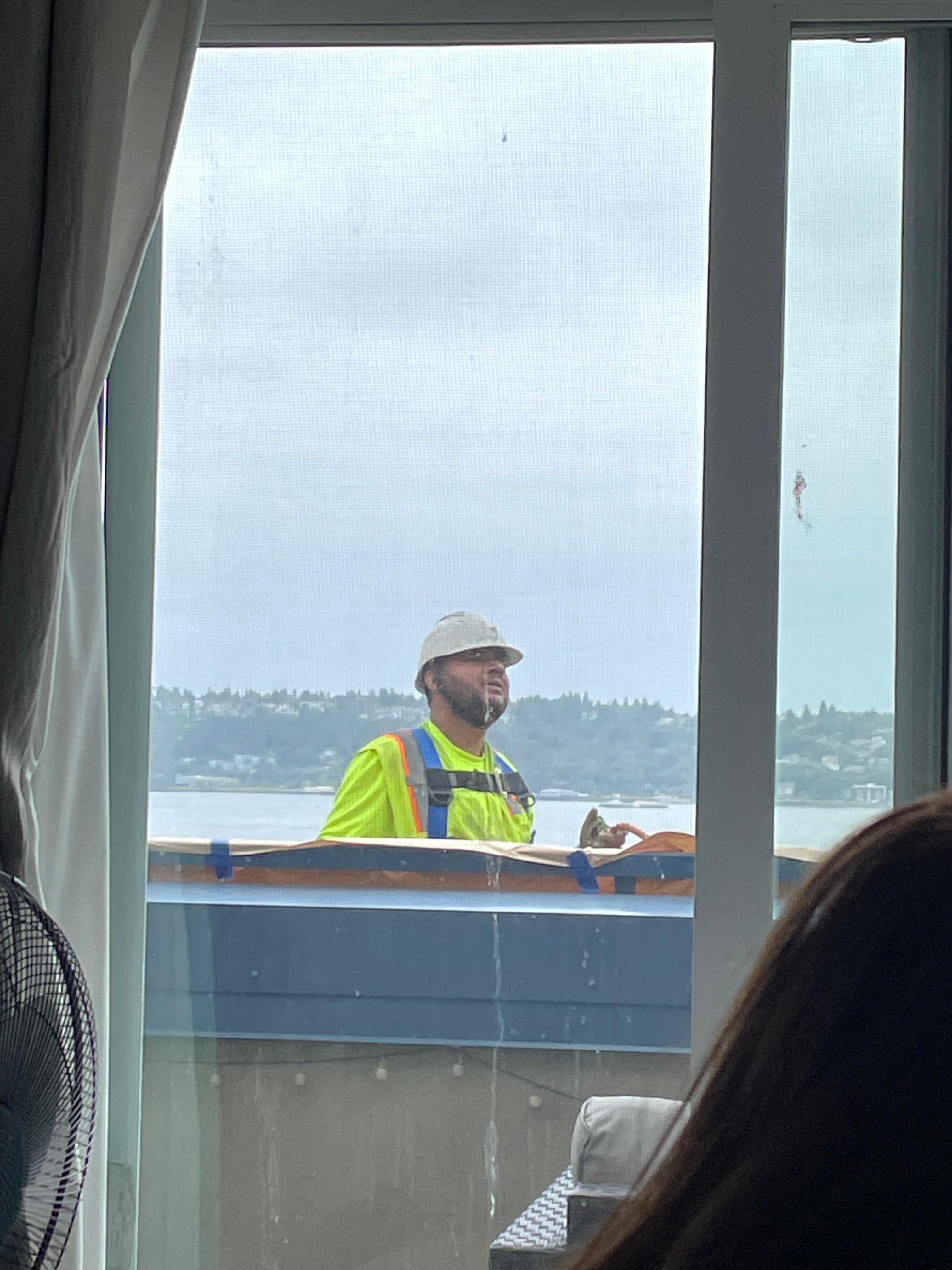 The condominium building performs window washing, exterior cleaning, painting and other projects from time to time. Workers may rappel down from the roof of the building with ropes or swing stages as they perform work on or around exterior windows. Guests can draw the window shades or close curtains if they have privacy concerns while work is being performed outside their unit's windows.