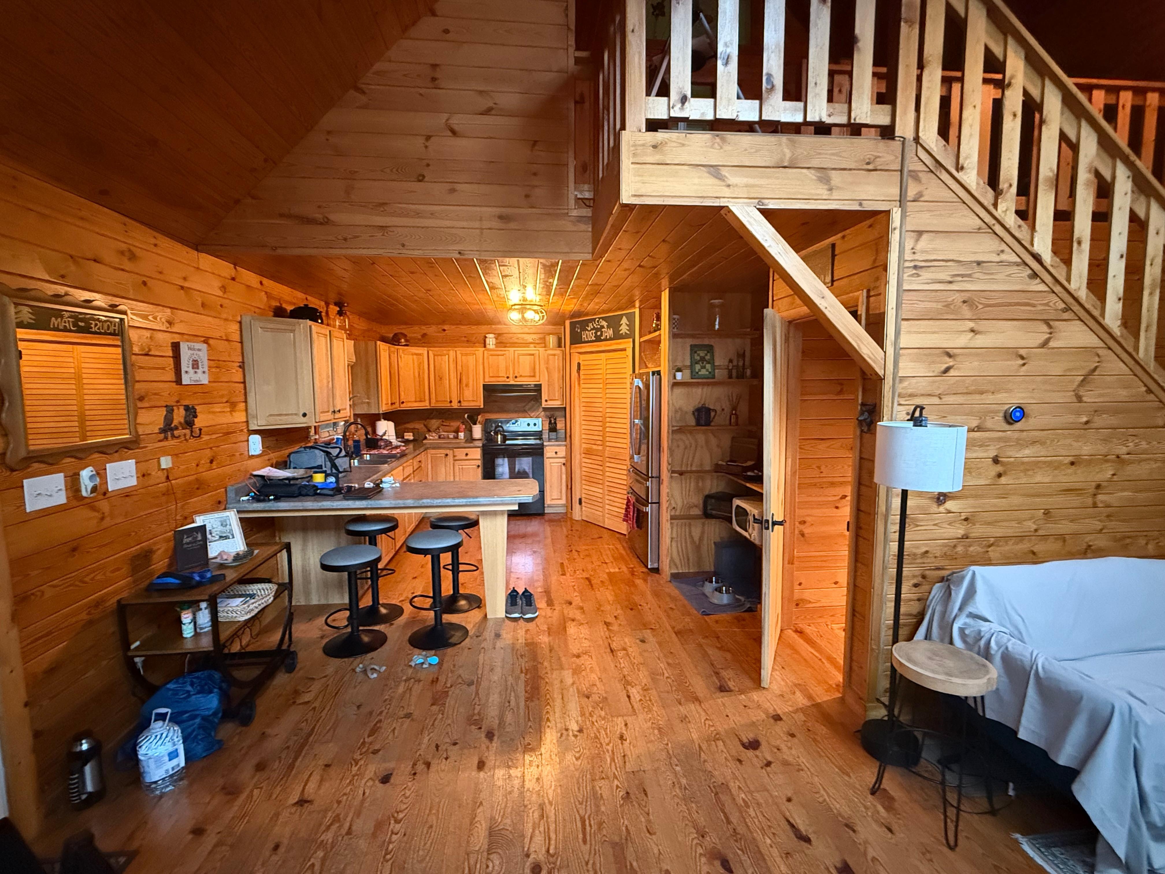 The cabin's main floor holds the kitchen, dining space, and living room with glass doors out to the deck. Our kitchen is fully stocked with dishes, utensils, pots and pans, appliances, coffee, tea, spices, oils, and more. The main floor also has a bedroom with queen bed. Upstairs is a loft area perfect for reading or games and taking in the beautiful view, and a bathroom with shower.
