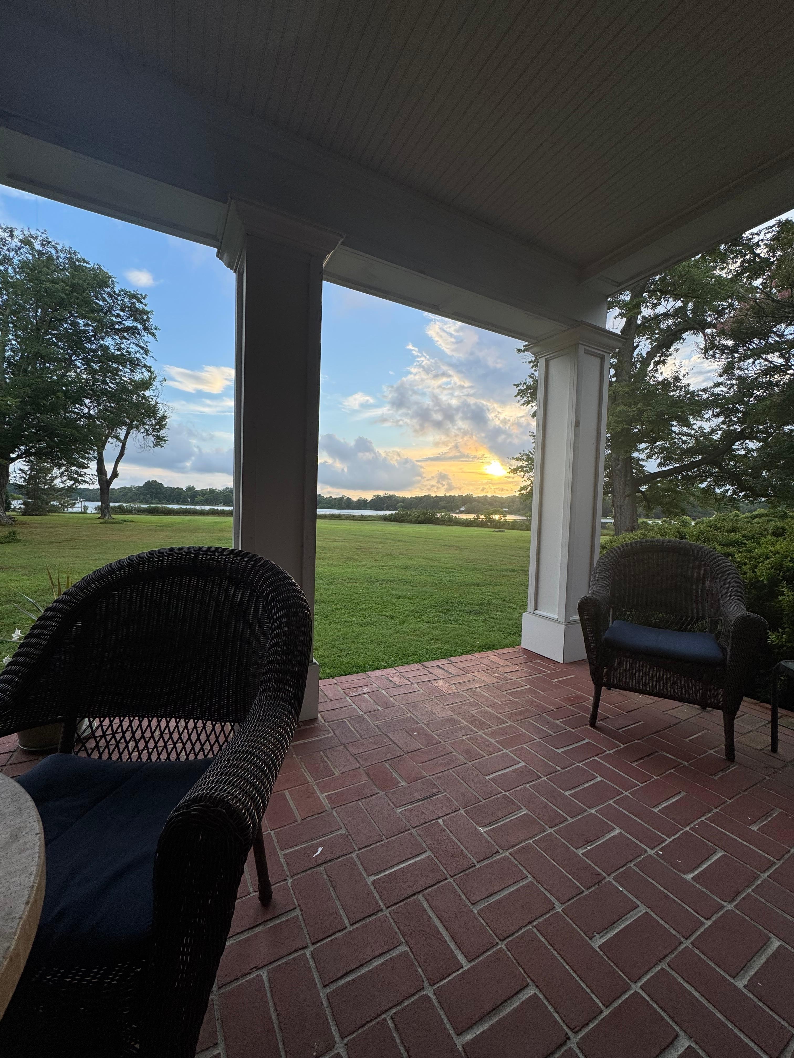 Great sunset views from the west-facing, brick floored, river front porch with porch swing and wicker chairs.