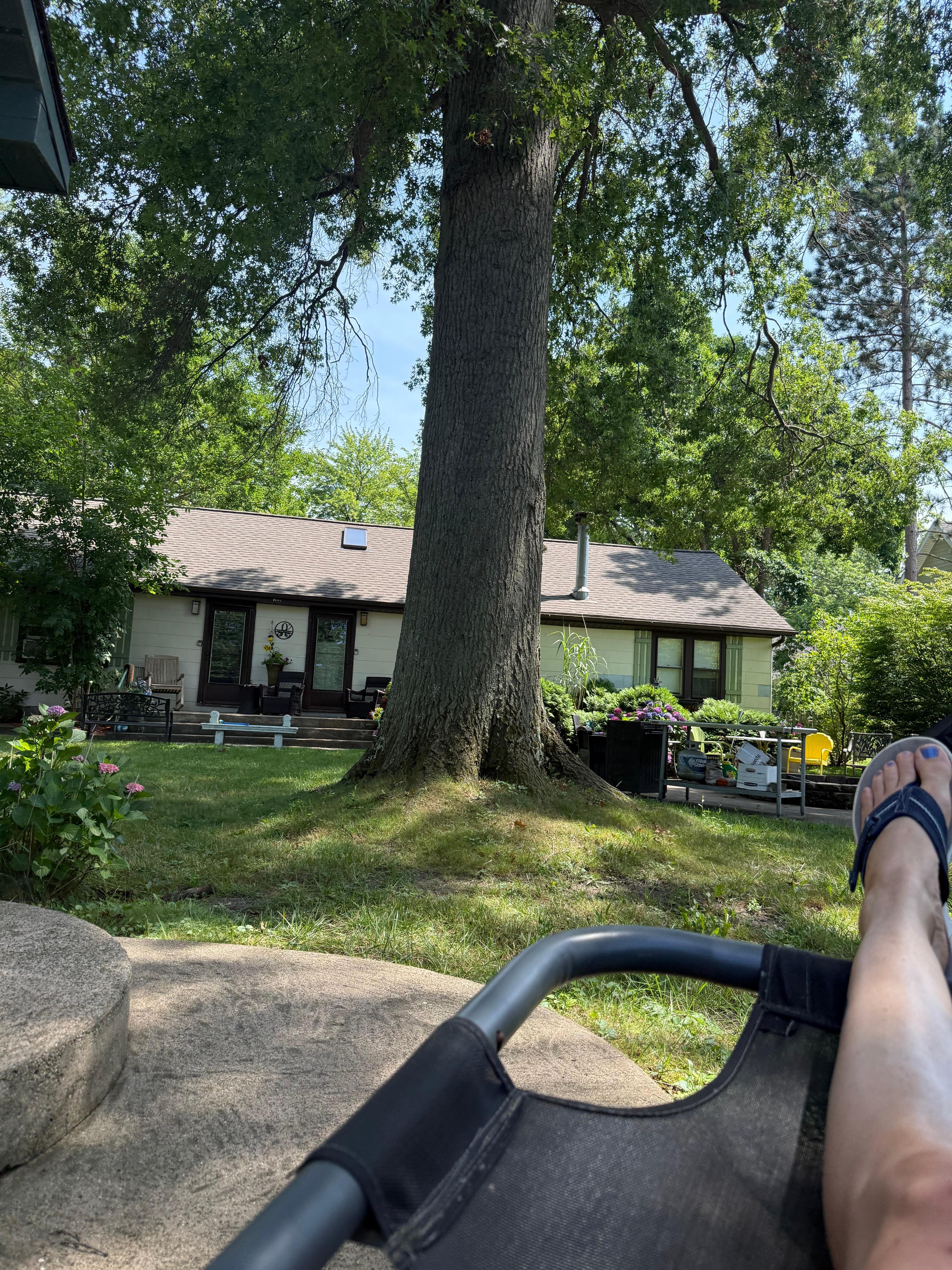 Yard with jungle gym swing set /slide for the kids, fire pit circle, picnic table seating, and gas grill.