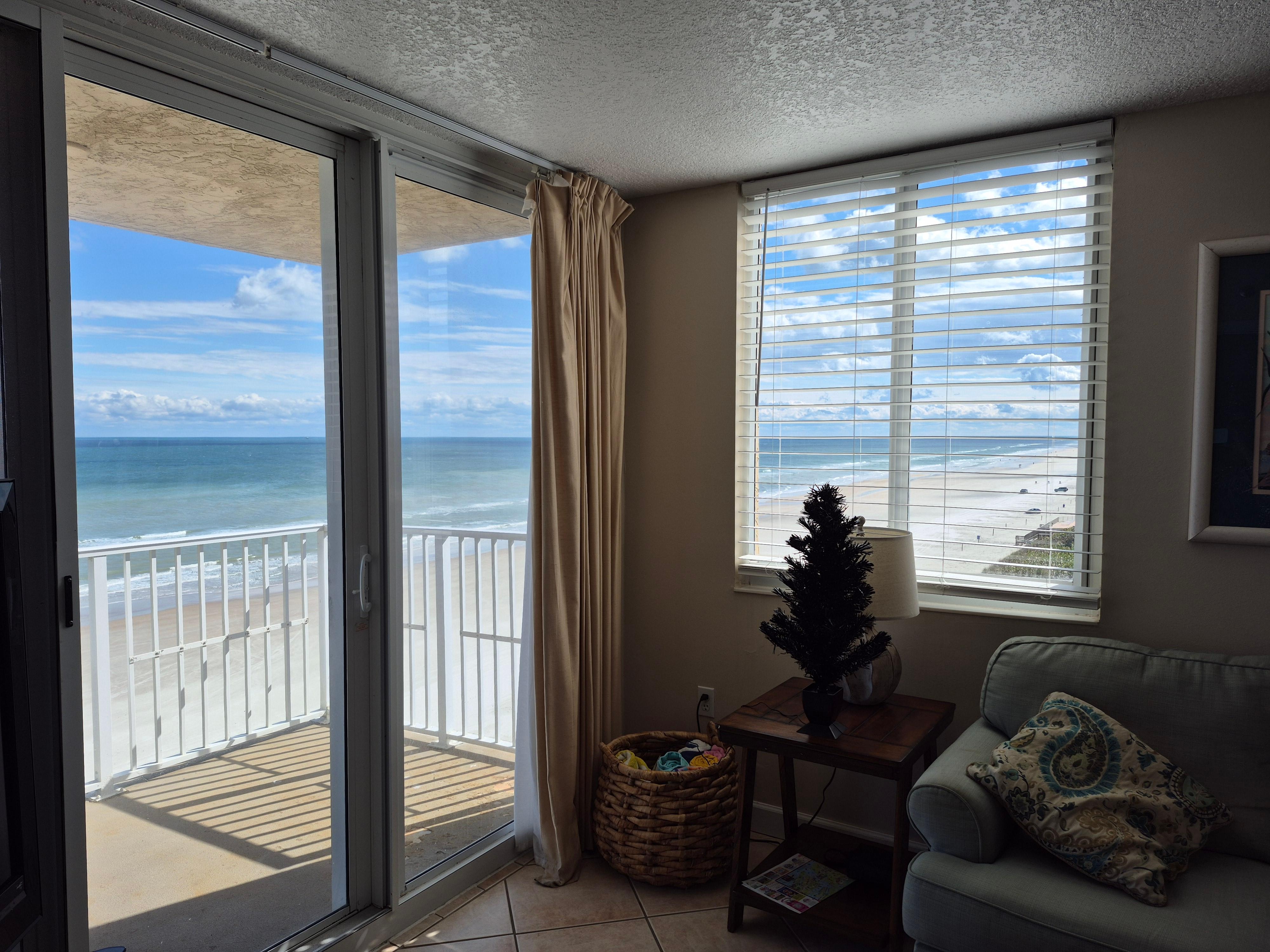 The oceanfront condo is on the 8th floor of a 8-story building and has a panoramic view with WIFI. Image yourself watching the space shuttle launch from the balcony. It is a 2 bedroom and 2 baths that fits a maximum of 6 people. Also, it’s like coming into your own home with linens and towels and more. You just need your tooth brush, sunscreen and swimsuit. The kitchen has a full size refrigerator, oven with stove, dishwasher, microwave and is fully equipped to whip up a meal or make a frozen cocktail. Even on vacation, it is nice to have a washer and dryer in the complex. The condo is tastefully decorated and you feel like you are at the beach.