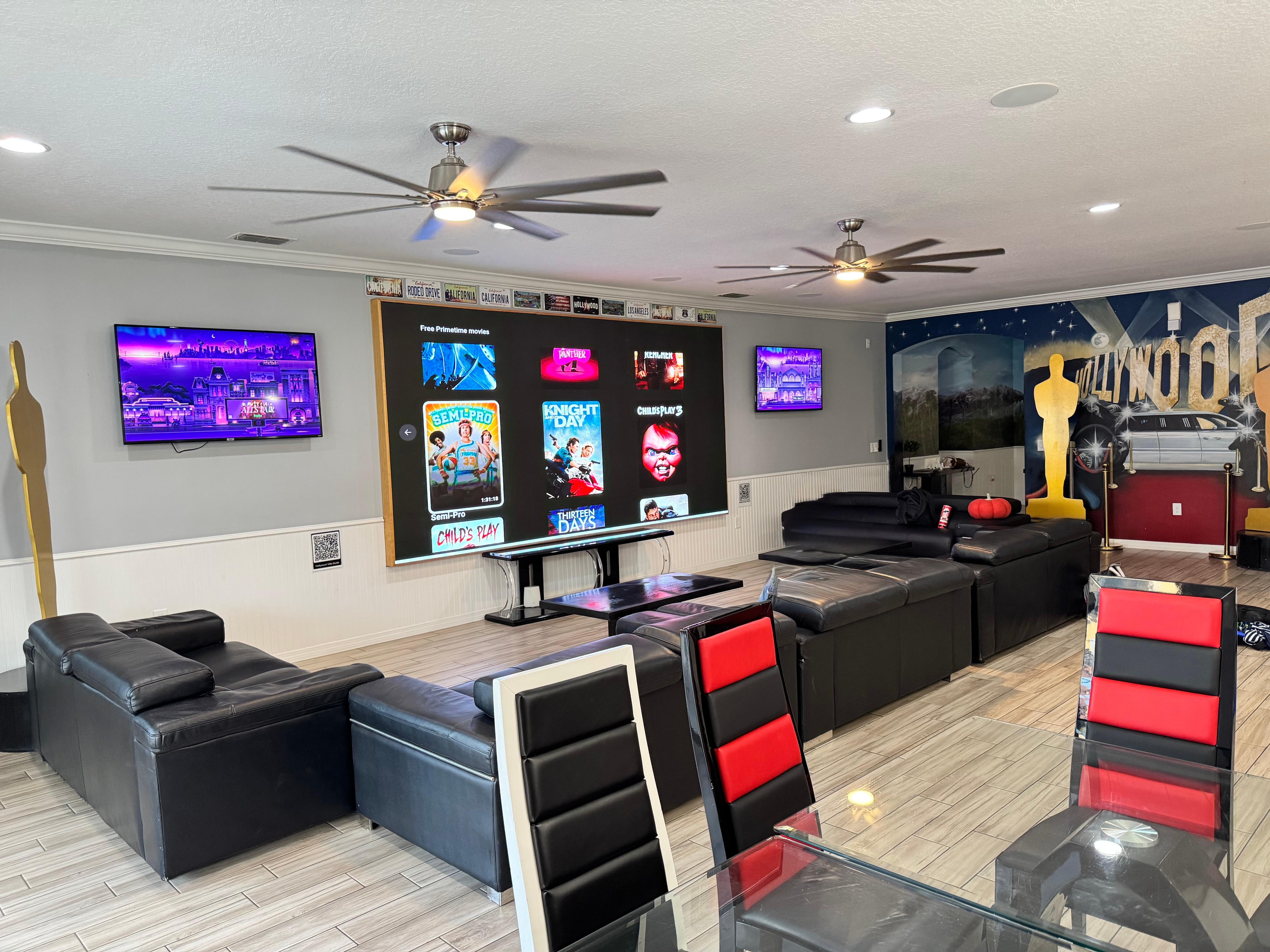 x3 120-inch projector screens, with an additional 120-inch projector in the main family living room area