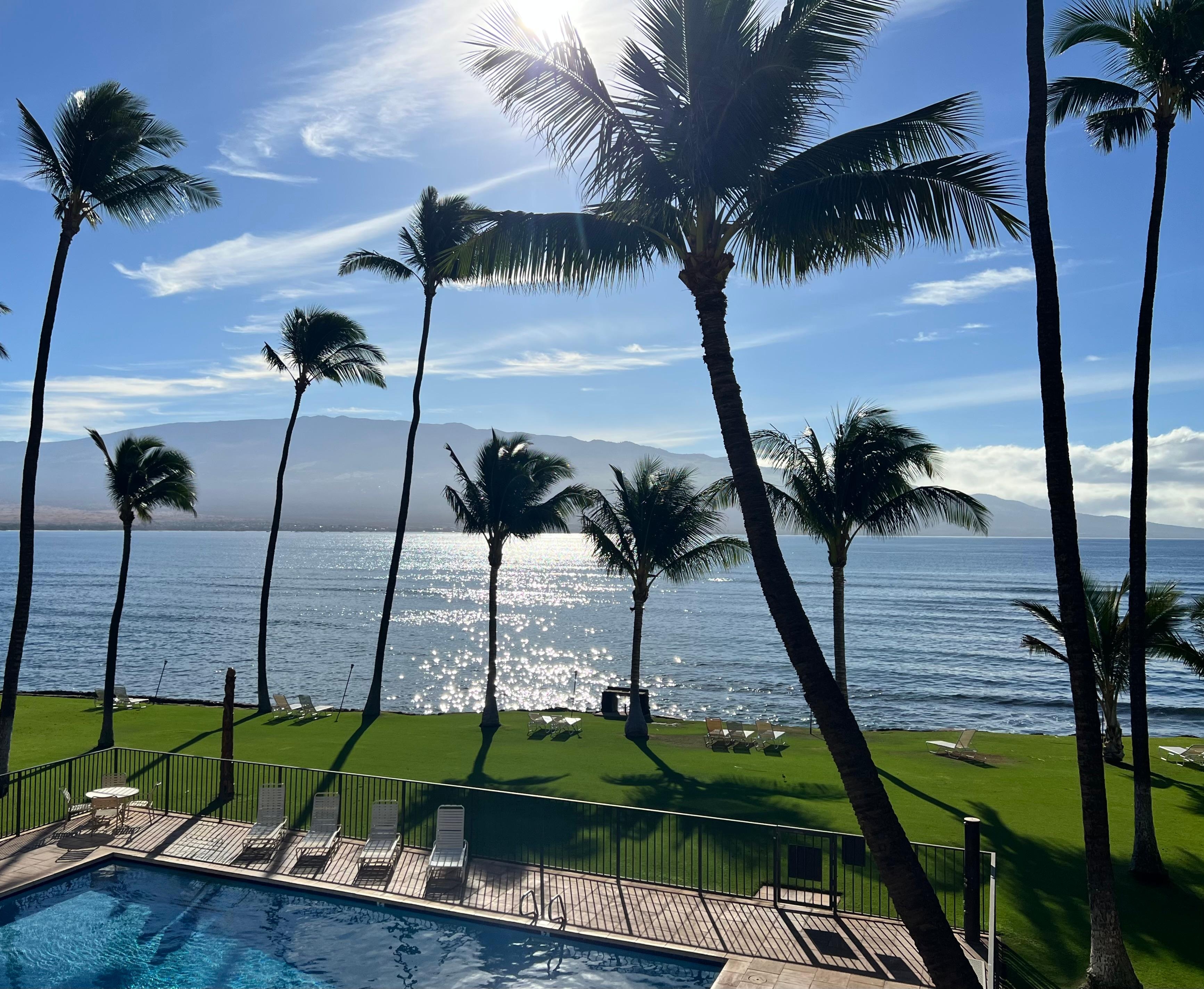 Maalaea Kai stands ocean front, with designated parking lining the front of the complex with ample space and shaded by palm trees. Grounds are well kept with all sorts of greenery; palms, pink and red ginger flowers, red and green ti leaf plants, plumeria and vibrant shrubs adding to the Hawaiian feel. The complex is outfitted with two elevators: one front and center to the complex, the other one at the west end of parking lot. Stairwells are located next to each elevator. Trash is located on the west end of the complex, with each floor having a trash shoot next to the westward elevator. A common seating area in the middle of the complex leads out to a sprawling green lawn that runs right up to the ocean where you can watch for feeding turtles, the occasional surfer, and whales depending on the season (the whales visit our island between the months of December- mid-April). Grounds include a spacious, gated pool and community gas grill area for Maalaea Kai guests and residents to use and enjoy. At night, this complex is lit with tropical tiki torches to take you back to the old Hawaiian days.