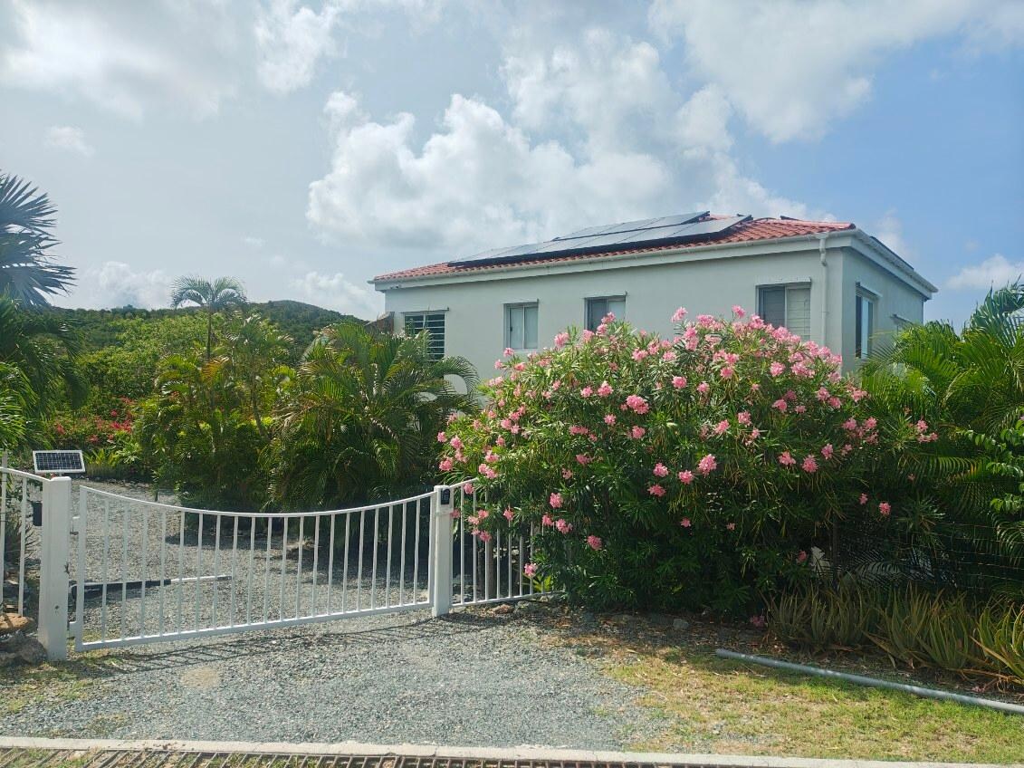 The main house of the villa boasts a large fully-equipped kitchen with bar seating at the island, a large dining table, and a living room with a sectional sofa for everyone to gather together to watch television or just take in the stunning views. A half bathroom (with two sets of washers and dryers) completes the first level of the main house. The main house bedroom, accessible via a spiral staircase, offers a large bedroom with a King-sized bed, a large dressing double closet area, attached full bathroom with double vanity, and a private balcony with views from Coral Bay to St Croix.