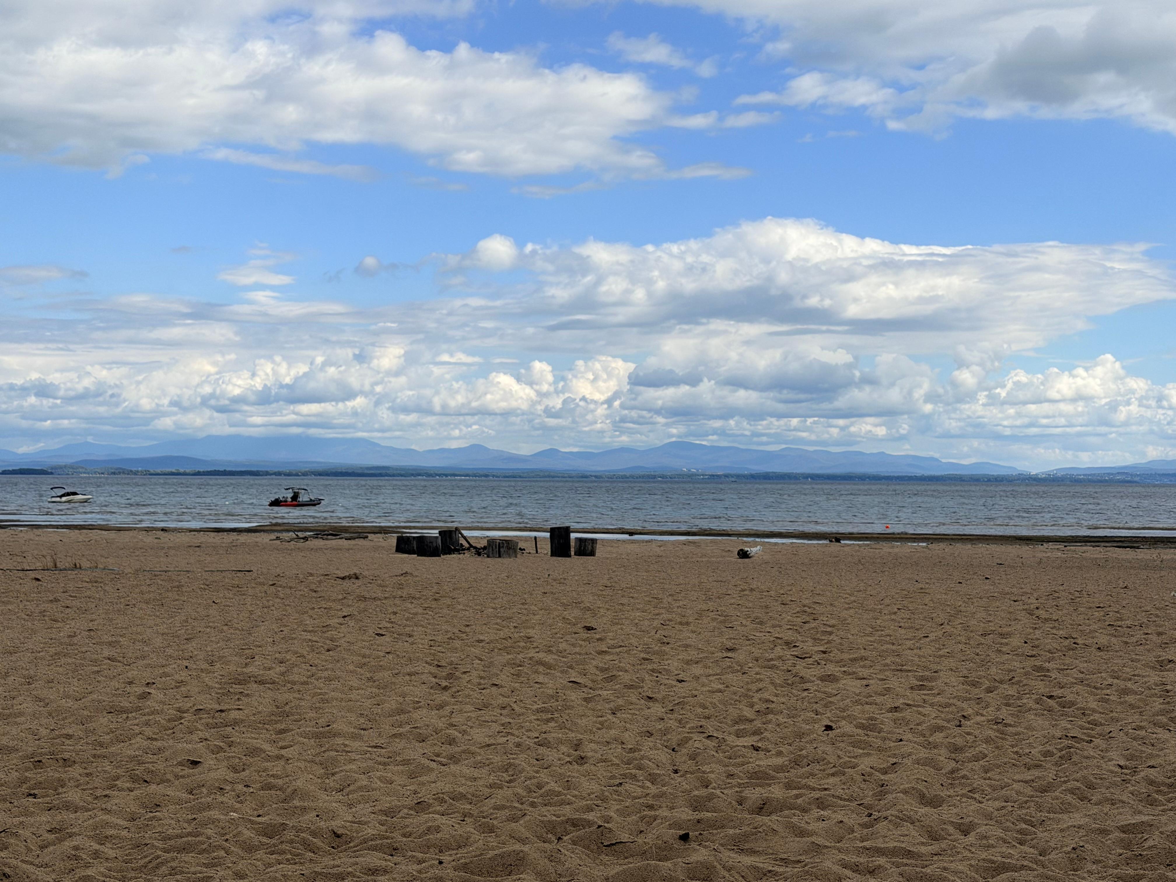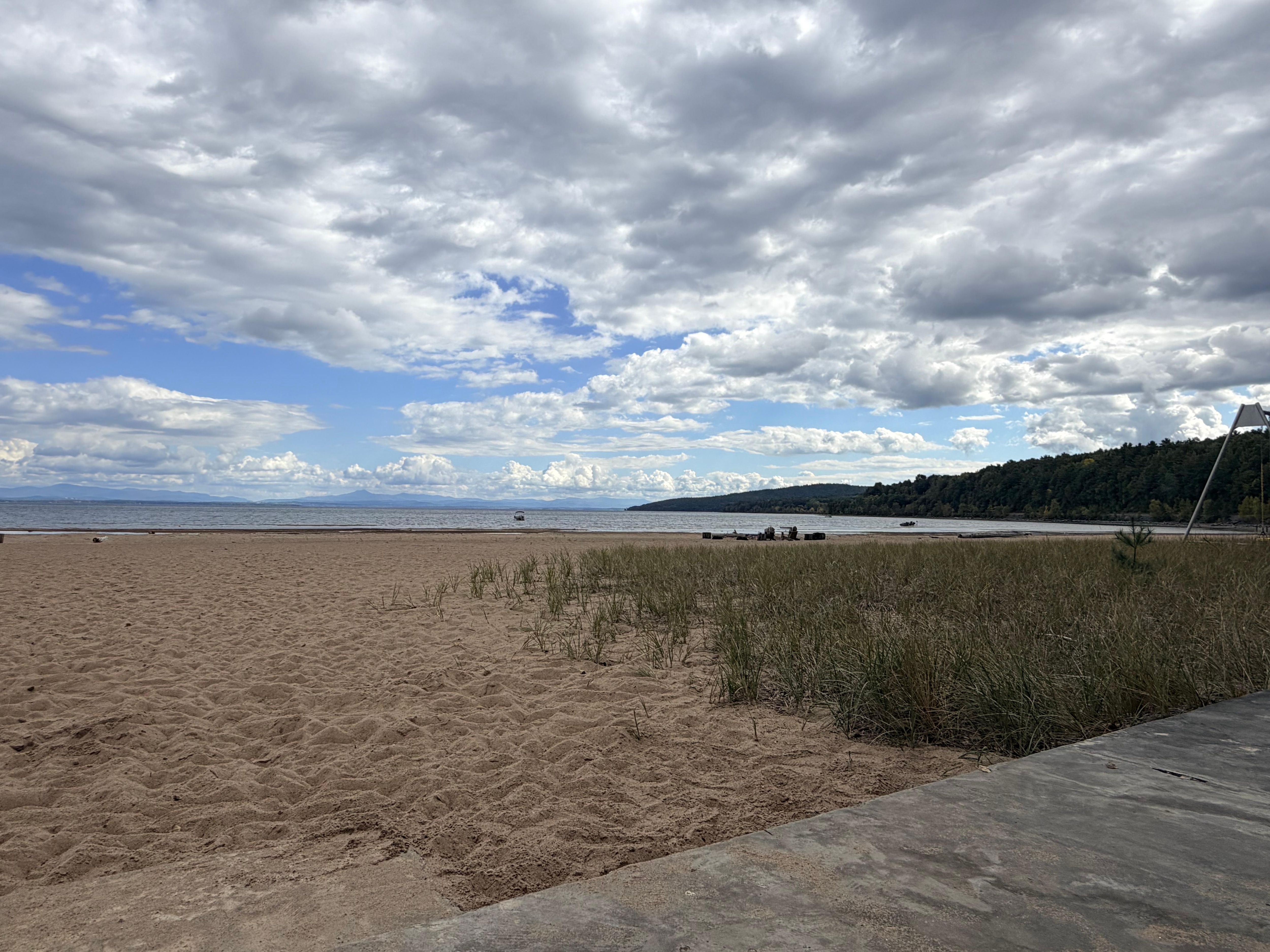 Pine Beach Camp in the Adirondack Park of New York sits on one of the most exclusive sand beaches in the Champlain Valley. The quarter mile beach is bounded by the mouth of the Ausable River to the North and a cliff to the South and is only accessible by a private gravel road. The lake bottom is sandy and most residents walk around and enter the water with bare feet. Boats can be moored offshore within walking distance or pulled up on the beach. There is plenty to see and do from this location. Float a kayak, paddle board or row boat out on the lake or up the lazy Ausable River, go swimming, fishing or just relax on the patio or beach. At night, sit around a campfire on the beach and roast marshmallows. The location is also a perfect base from which to explore the ruggedly beautiful Adirondack Mountains. Lake Placid, site of the 1980 Olympic Games and in the heart of the Adirondacks is 39 miles away. Downtown Burlington, VT is a 1.5 hour drive via the Cumberland Head NY ferry. From Burlington, the most scenic vistas Vermont has to offer are only a short drive away. The Amtrak Train station in Port Kent, NY also provides access to and from Penn Station in NY as well as Montreal, Quebec. You can see the trains pass along the lake from the beach carrying passengers and freight You can hear its whistle from the RR crossing about a quarter mile away. Three public golf courses are located with in 8 miles, with the nearest course within 3 miles. Ausable Chasm, a popular tourist attraction is only 3 miles from our camp.