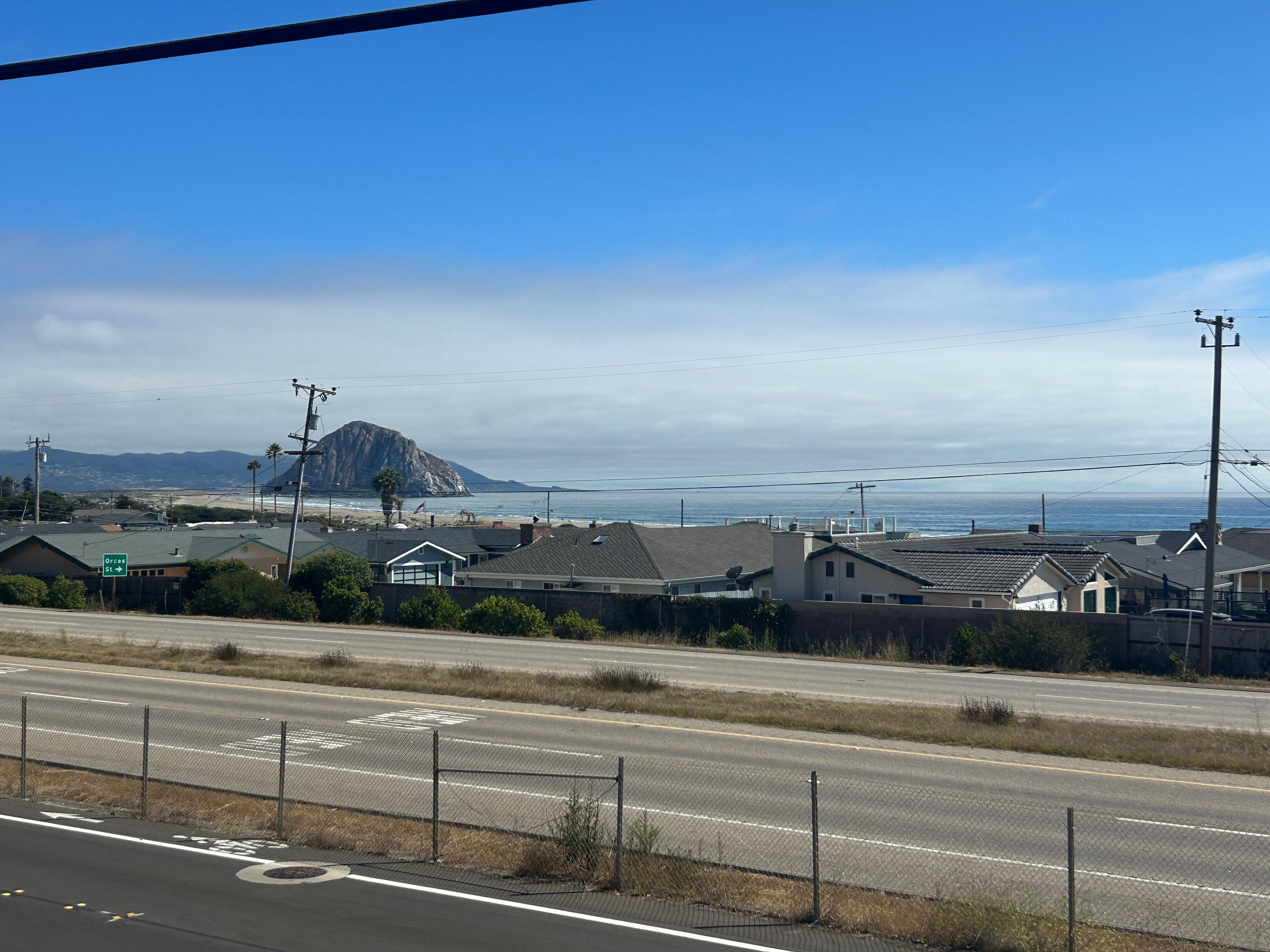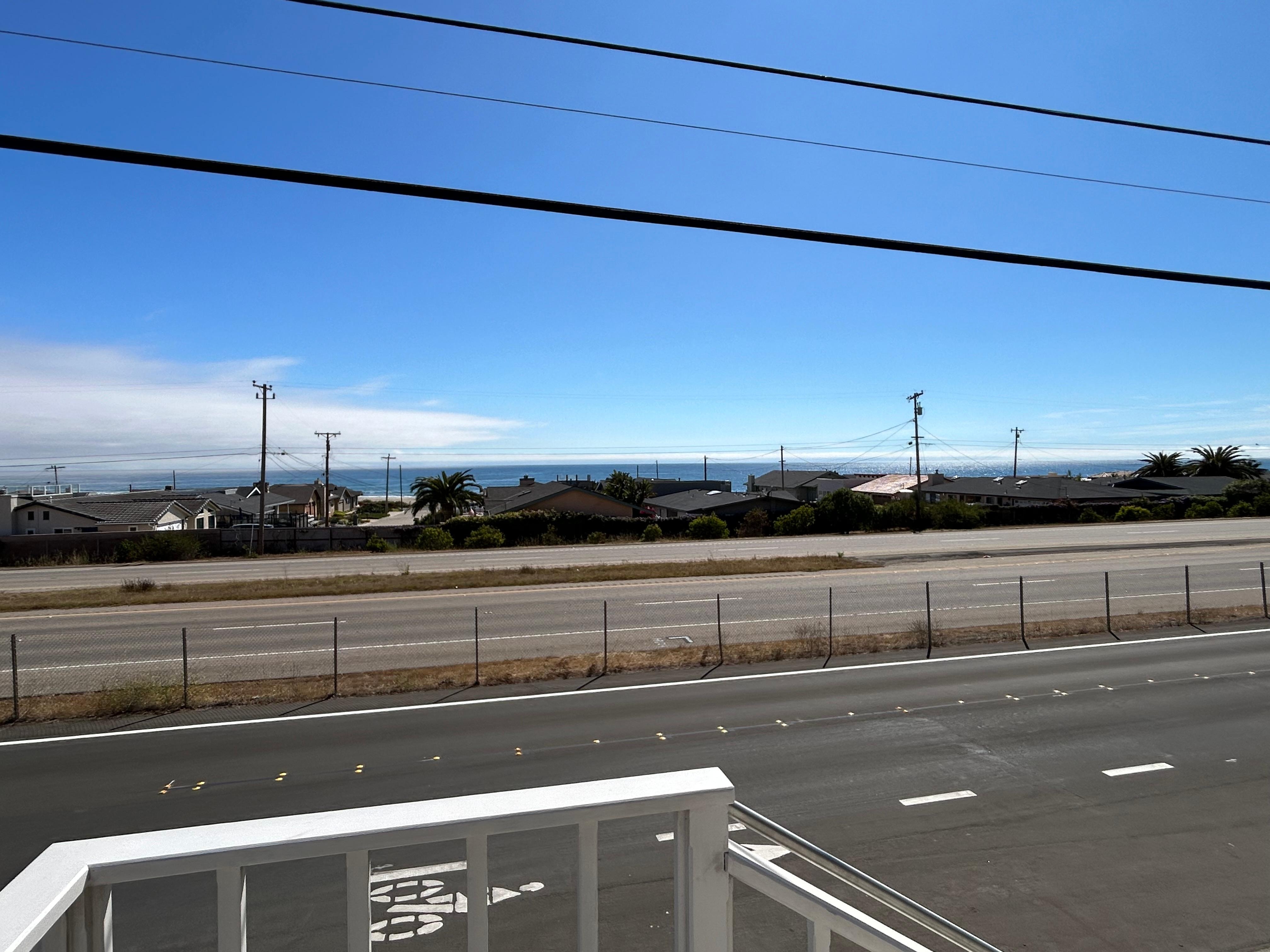 3 Bedroom, 2 Bath spacious Home with sweeping views from Estero Point to Morro Rock! Glass entry way, Open Living & Views from the Kitchen! An Outdoor Patio off the back. This 2nd story light and bright Morro Bay home has incredible ocean and rock views and is only a short 2 block walk to the beach. It is situated at the very end of north Morro Bay and next to Cayucos, near the Yerba Buena crosswalk which makes for easy beach access. The living quarters are situated upstairs to take advantage of the view, accessed by exterior stairs. It has a spacious living room, dining room and kitchen, along with 3 bedrooms, two of which open up to the roof top deck for outdoor dining and relaxation. The living room features a large sofa, flat screen TV, and a conversation area perfect to play games or just relax . The master bedroom has a queen bed with an additional twin bed, a tv, and an ensuite bathroom with a tub. The other two bedrooms have 2 twin beds, and a double bed, and share a tiled bathroom with tub/shower. The sun-filled foyer is a great place to catch a nap, or park your boogie boards, ready to hit the surf.