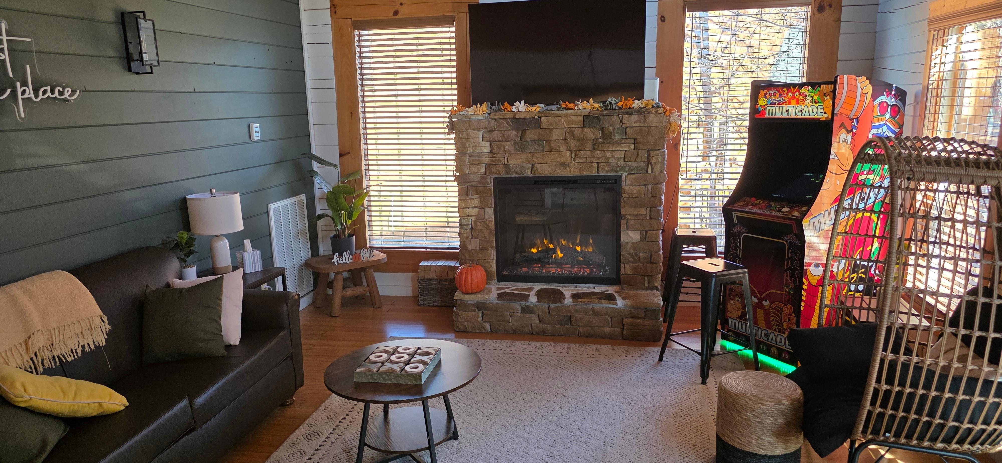 Unwind in the soothing hot tub, challenge each other on the nostalgic multicade game system, or snuggle by the fireplace after a day of adventures in the Smokies. The spacious King Bedroom offers a peaceful sanctuary, complete with an en-suite bathroom and spa-like touches for your ultimate comfort.