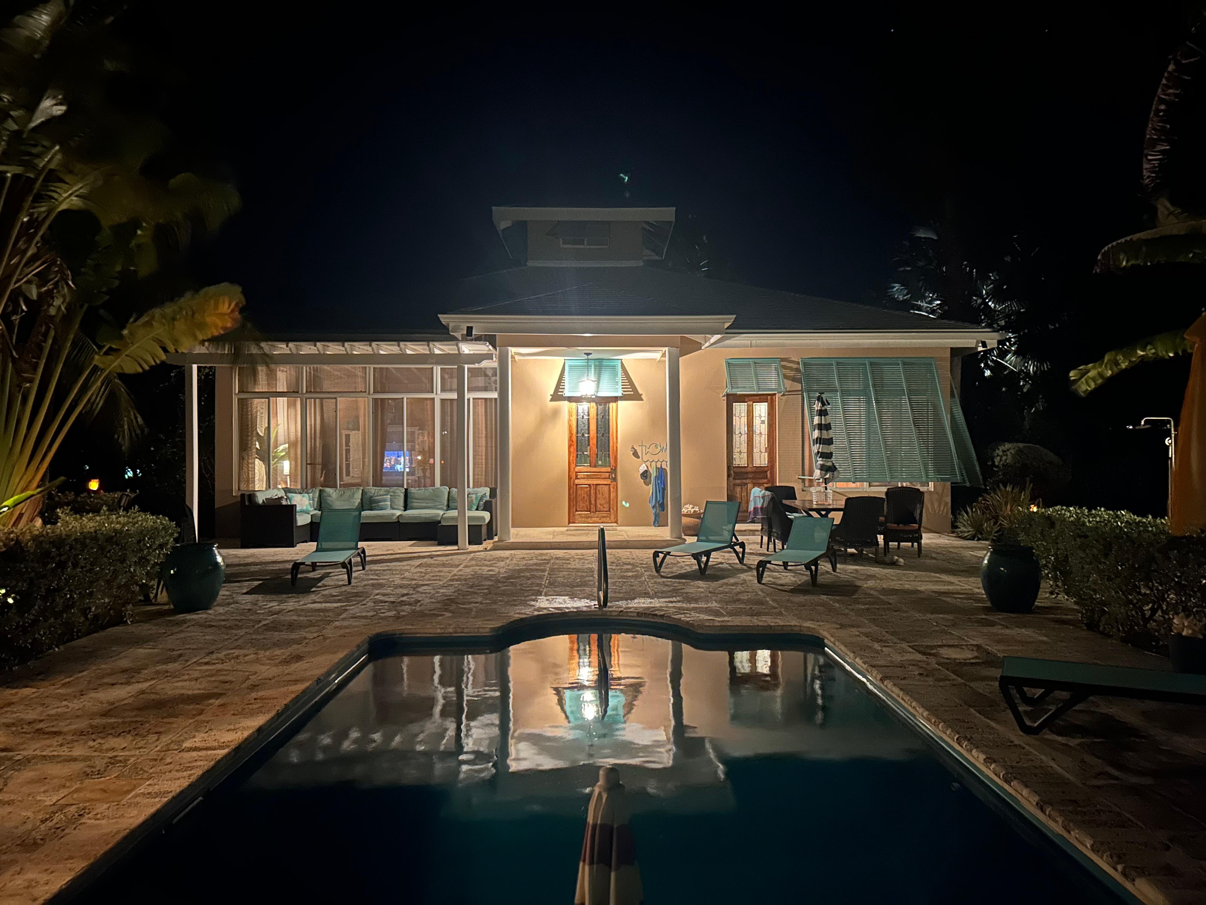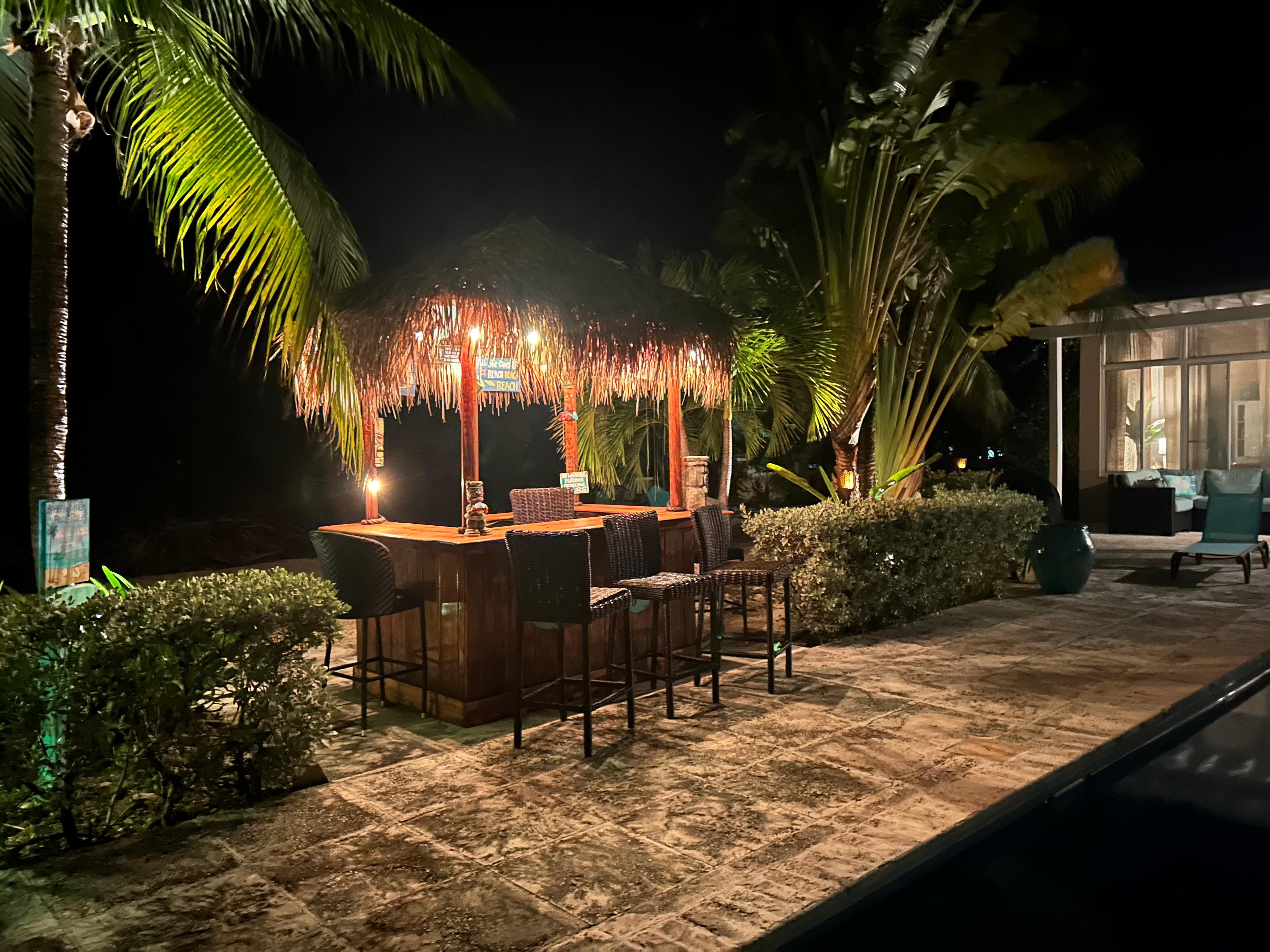 Private pool, with tropical Tiki bar, landscape lights and Tiki torches