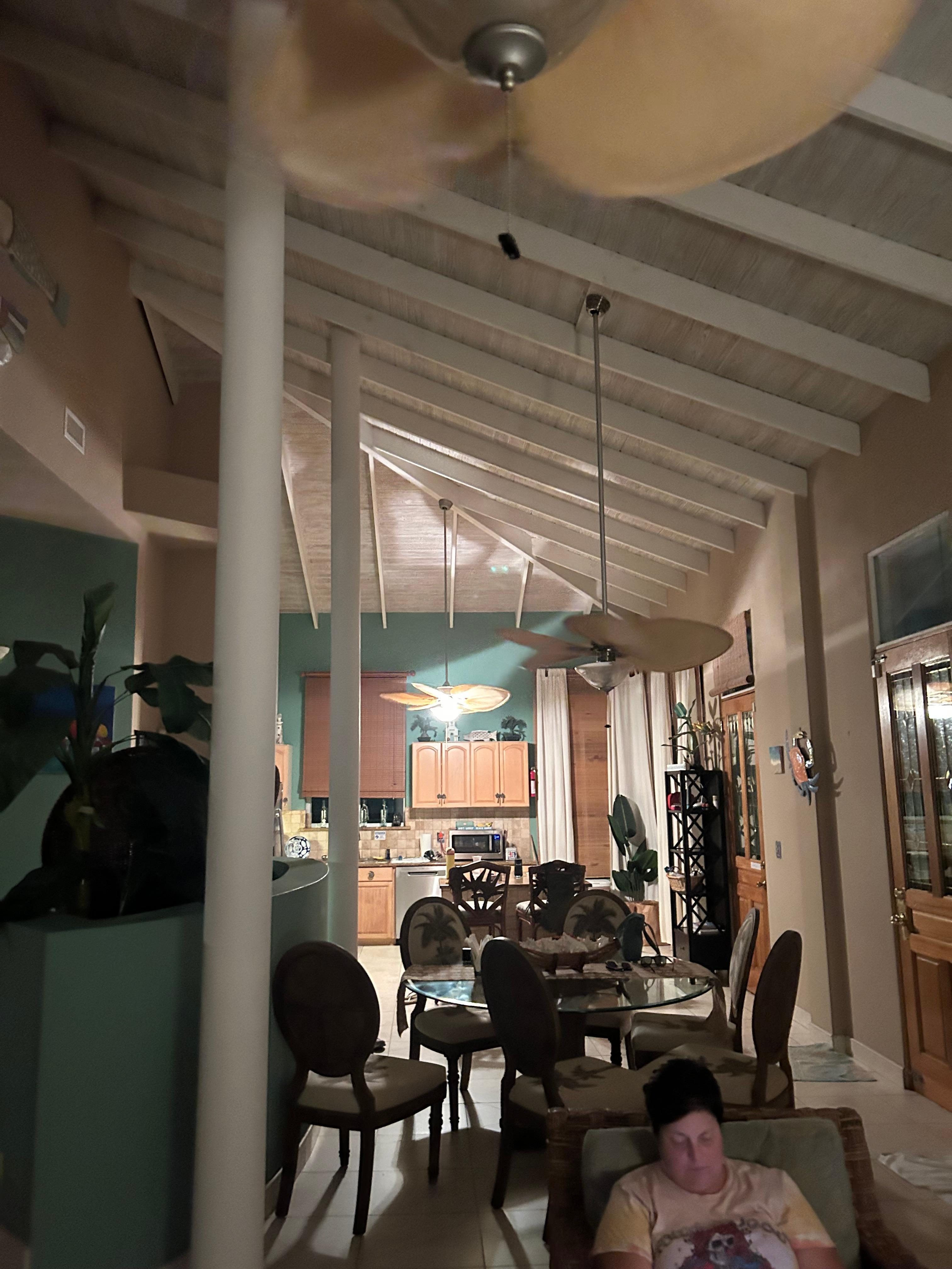 Every room has soaring high cathedral ceilings and open living space. The huge master bedroom has a king size bed , walk in closet and writing desk area. 2nd bedroom has king, 3rd bedroom has queen; great for families or 3 couples. Each bedroom has its own TV, Cable and DVD players. There's access to Netflix and YouTube. Individual A/C units in each bedroom and the rest of the house has central air.