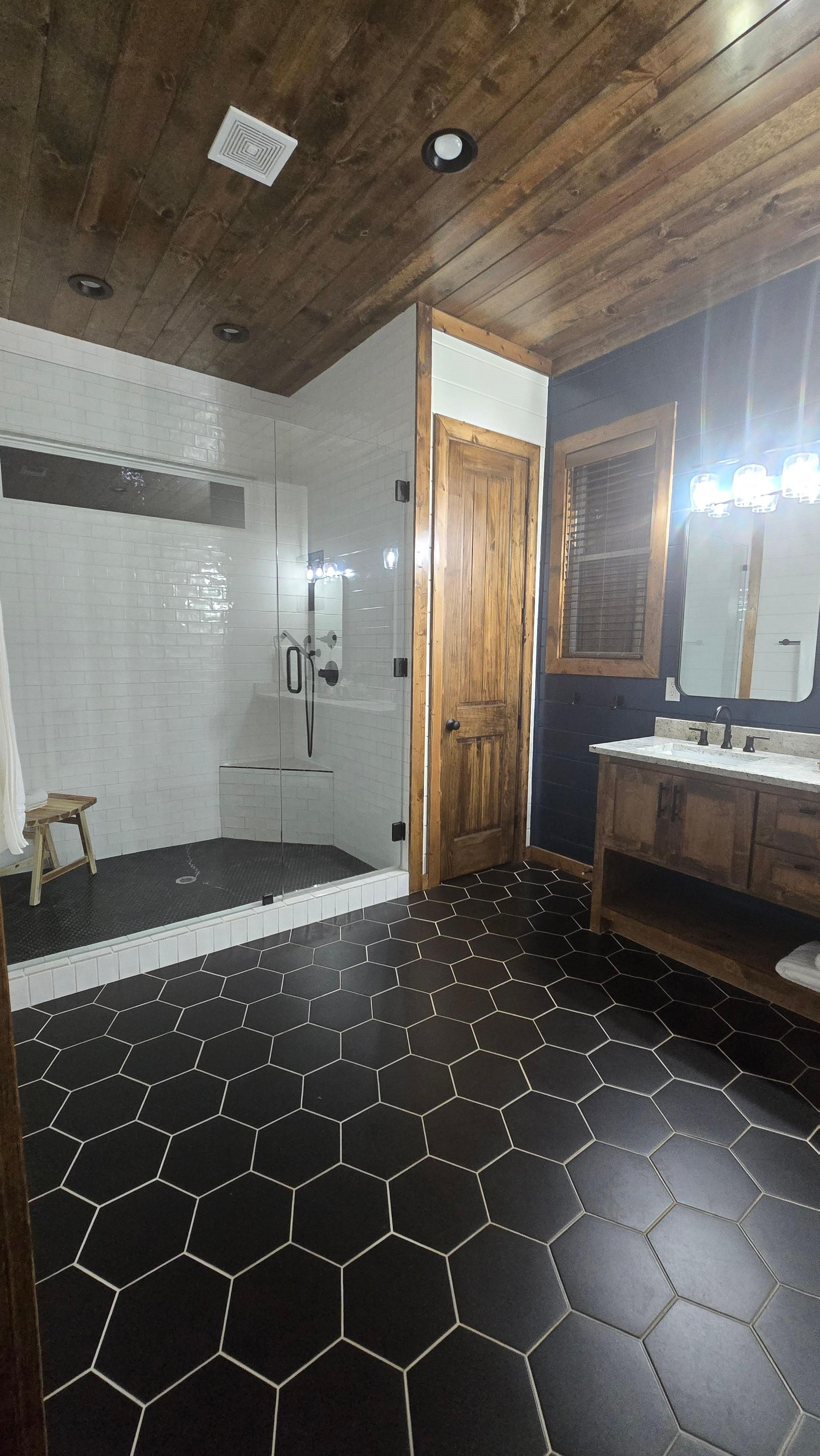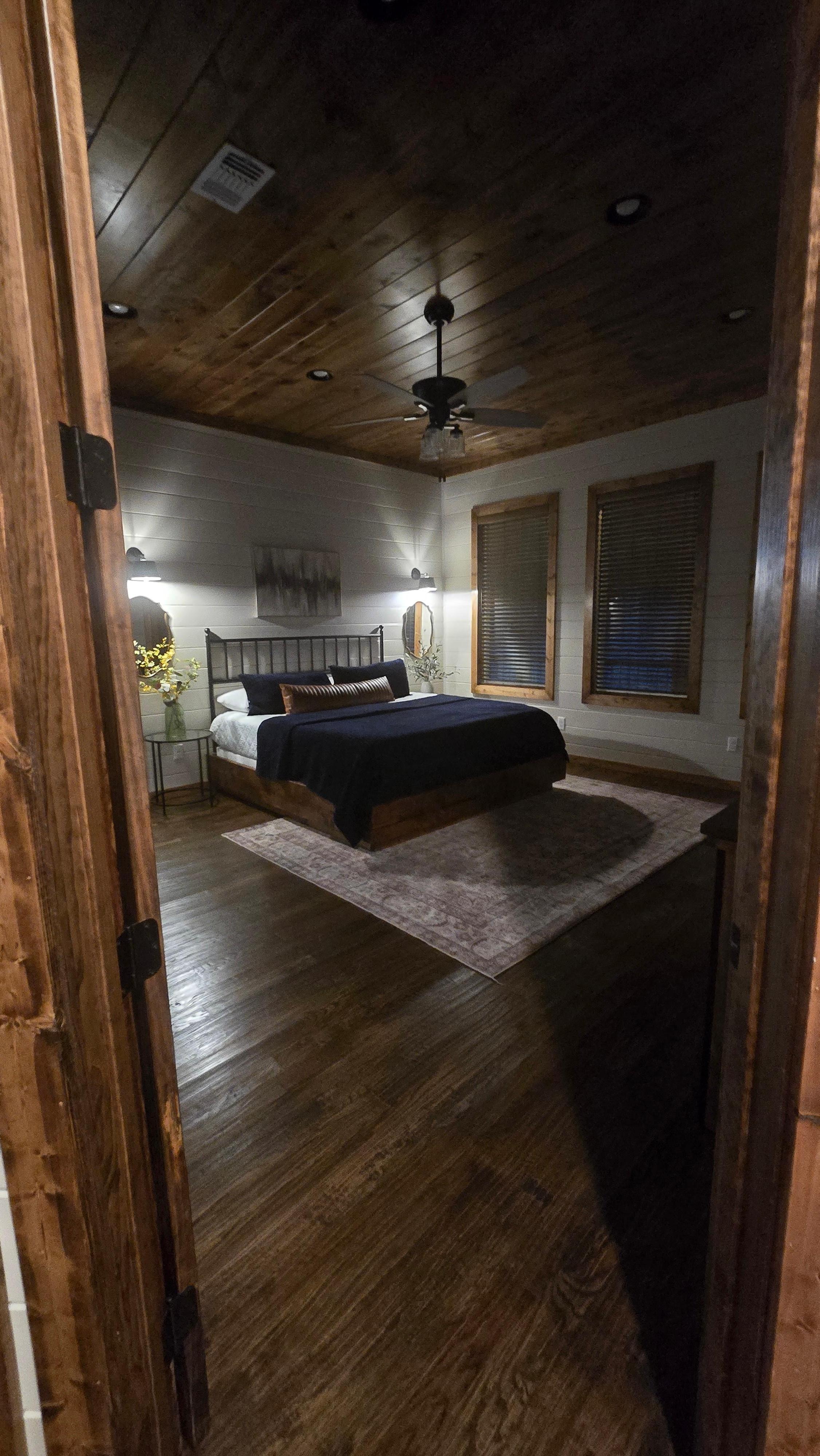 Step into luxurious relaxation in this fully equipped cabin, featuring a serene bedroom just off the kitchen. With a spacious king size bed, TV, dresser, and a luxurious attached bathroom complete with a oversized walk-in stone shower, you'll feel pampered and rejuvenated.