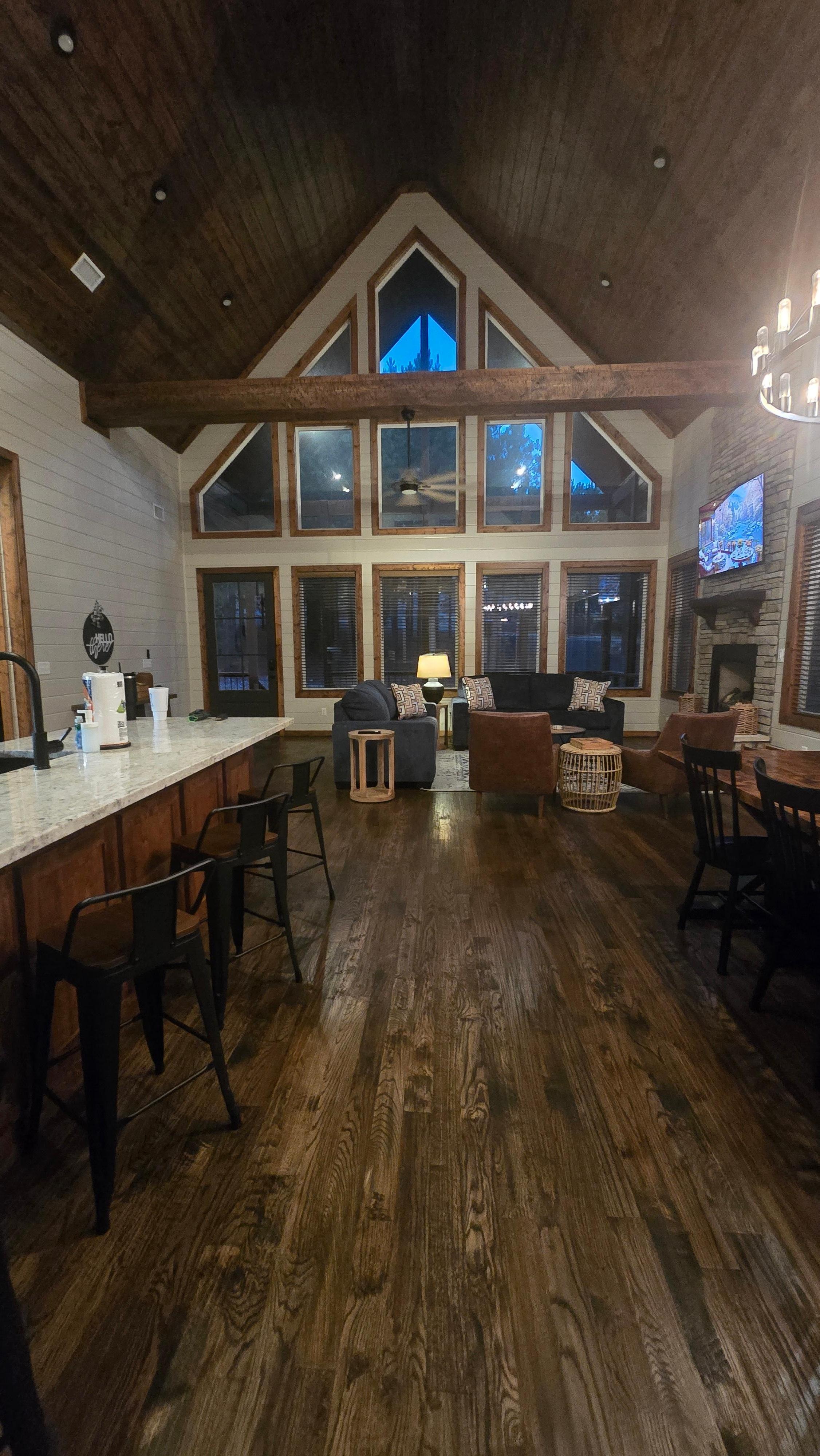 Prepare to be captivated as you step inside and behold the floor-to-ceiling fireplace With 20-FOOT high, VAULTED CEILINGS, this space projects grandeur, which sets the tone for your ultimate cozy getaway. Adorned with modern rustic décor, the spacious lodge room boasts an abundance of comfortable seating options including two sofas and two lounging chairs, all designed to ensure you can fully unwind. To top it all off, a Smart TV completes the entertainment experience, making this the perfect spot to kick back and relax. For added sleeping there is a queen sofa sleeper located in the living room.