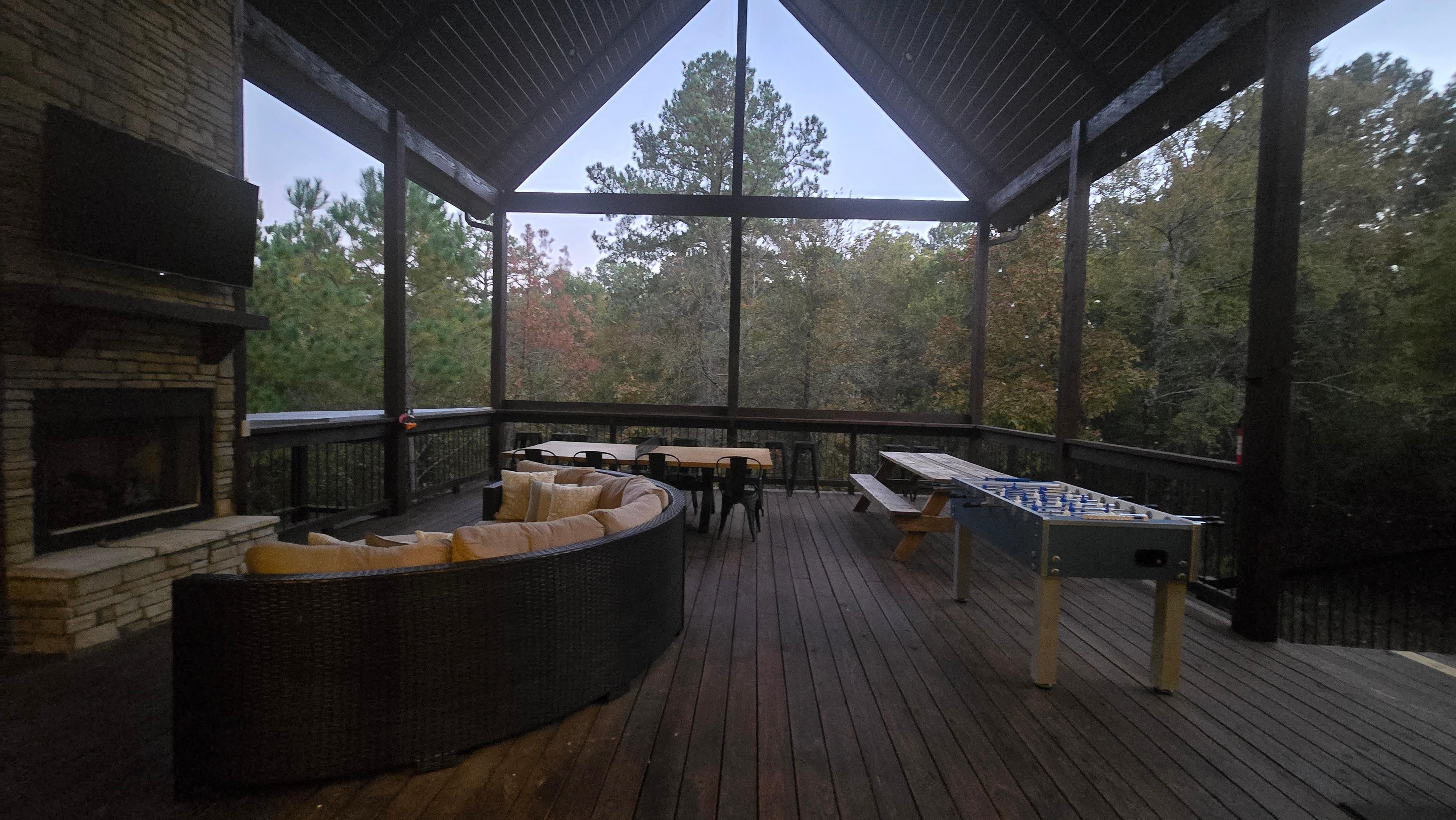 Step into the enchanting realm of outdoor living, where an unrivaled experience awaits. This outdoor haven is thoughtfully designed with a stately gas fireplace, inviting you to cozy up while enjoying a TV, numerous seating enclaves, a ping pong table, foosball table, and a convenient propane grill for delightful cookouts. As you descend the stairs, a secluded covered area unfolds, revealing the strategically placed hot tub.