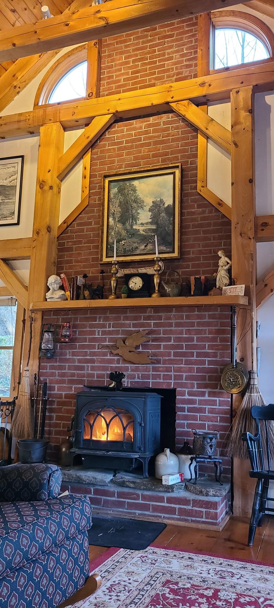 A wood burning stove, within a large floor to ceiling brick fireplace, offers warmth and cheer by a glowing fire. Unlimited split and stacked wood and kindling is provided free for your use in the wood stove and outdoor fire pit.