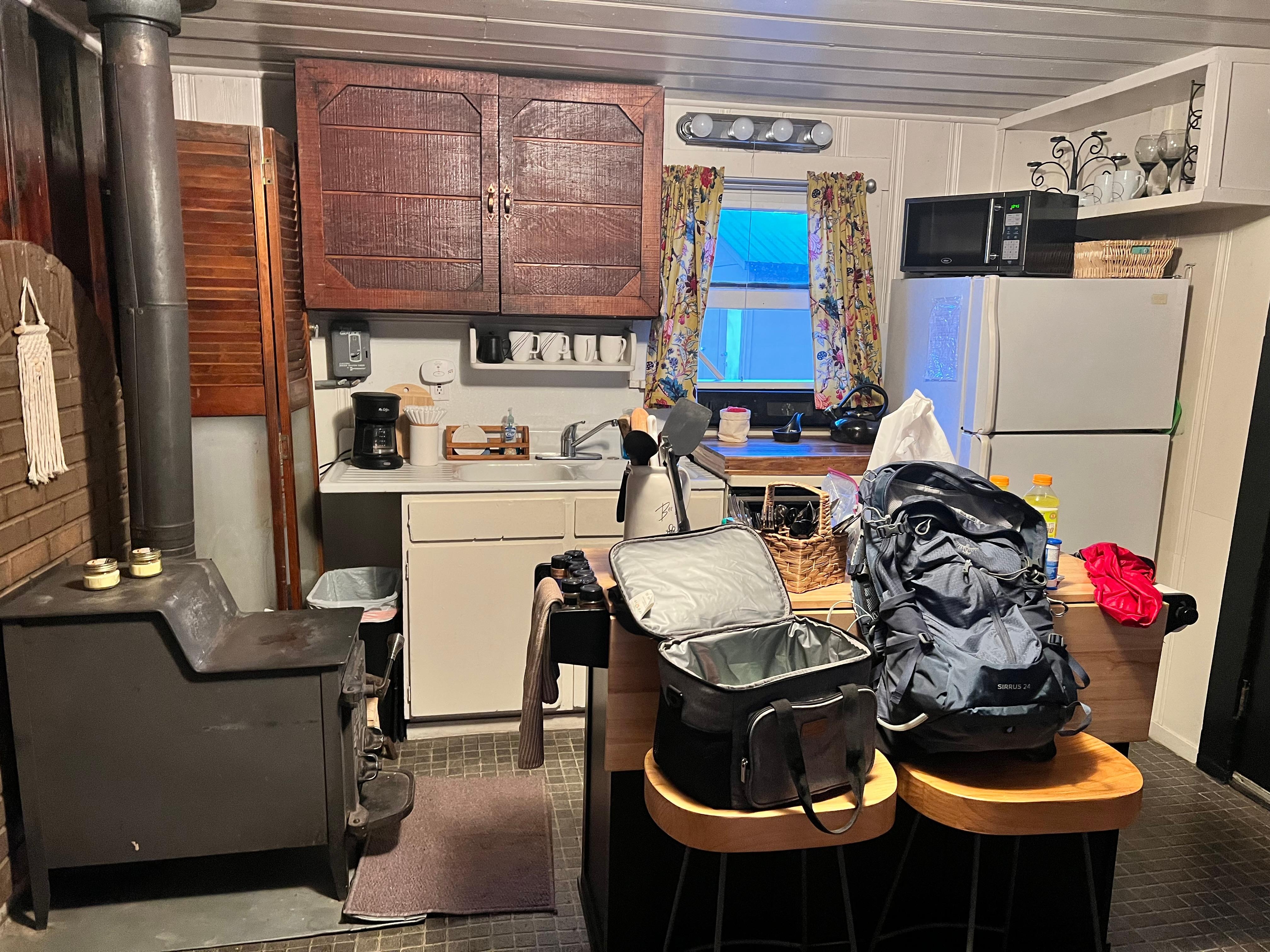The main source of heat is a wood stove. We supply the wood. There’s 2 portable heaters for your use.