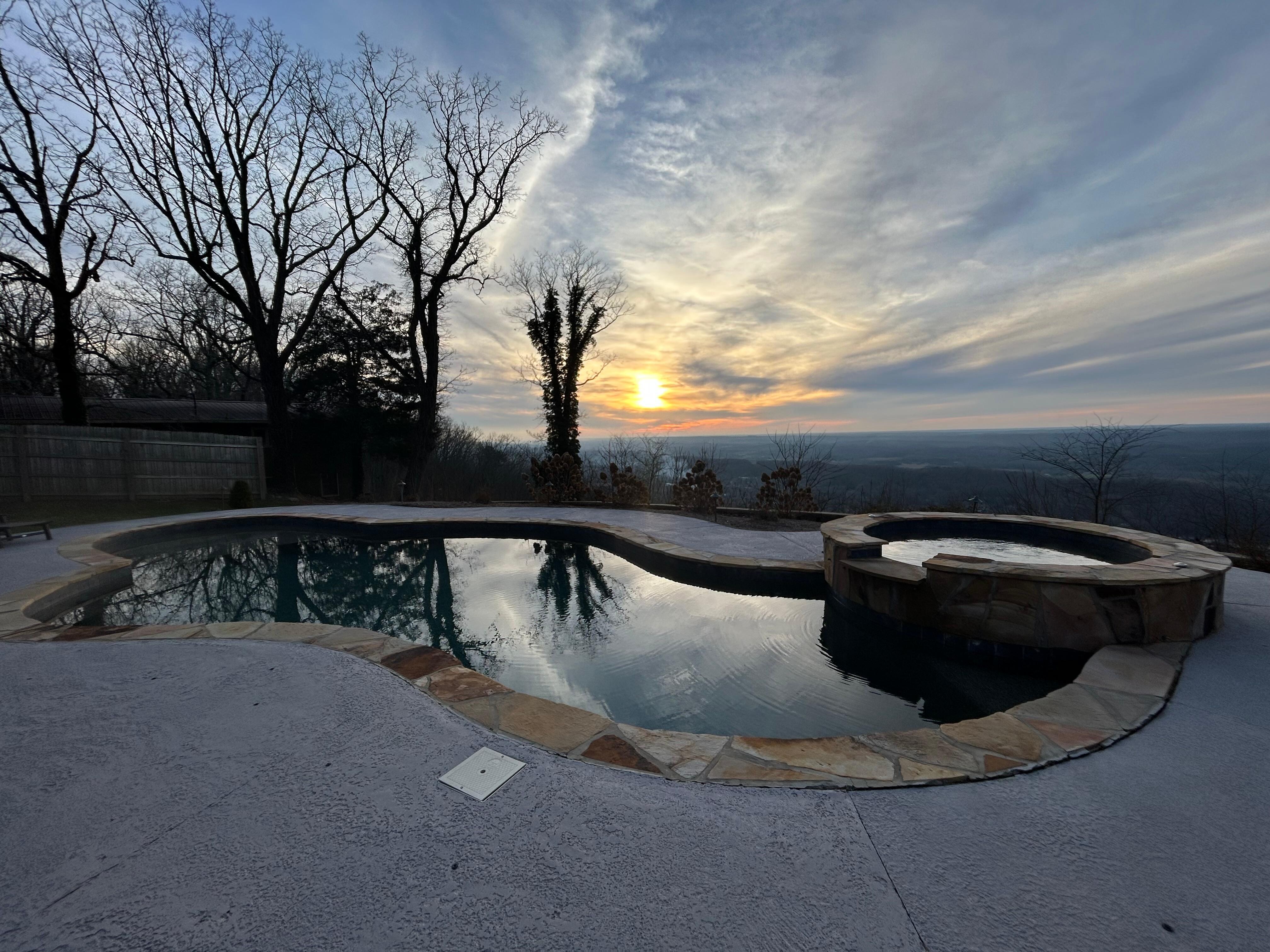 The amazing outdoor living space is so relaxing and peaceful. The minute you arrive at Tarbucks Hill, relaxation sets in. The cabin boasts a beautiful front porch complete with rocking chairs. It offers a pool and hot tub overlooking the brow. There are two outdoor fireplaces one on the covered back porch. There is a small playground for the kids to enjoy. You will find plenty of outdoor seating for relaxation with views and sunsets that will make you never want to leave.