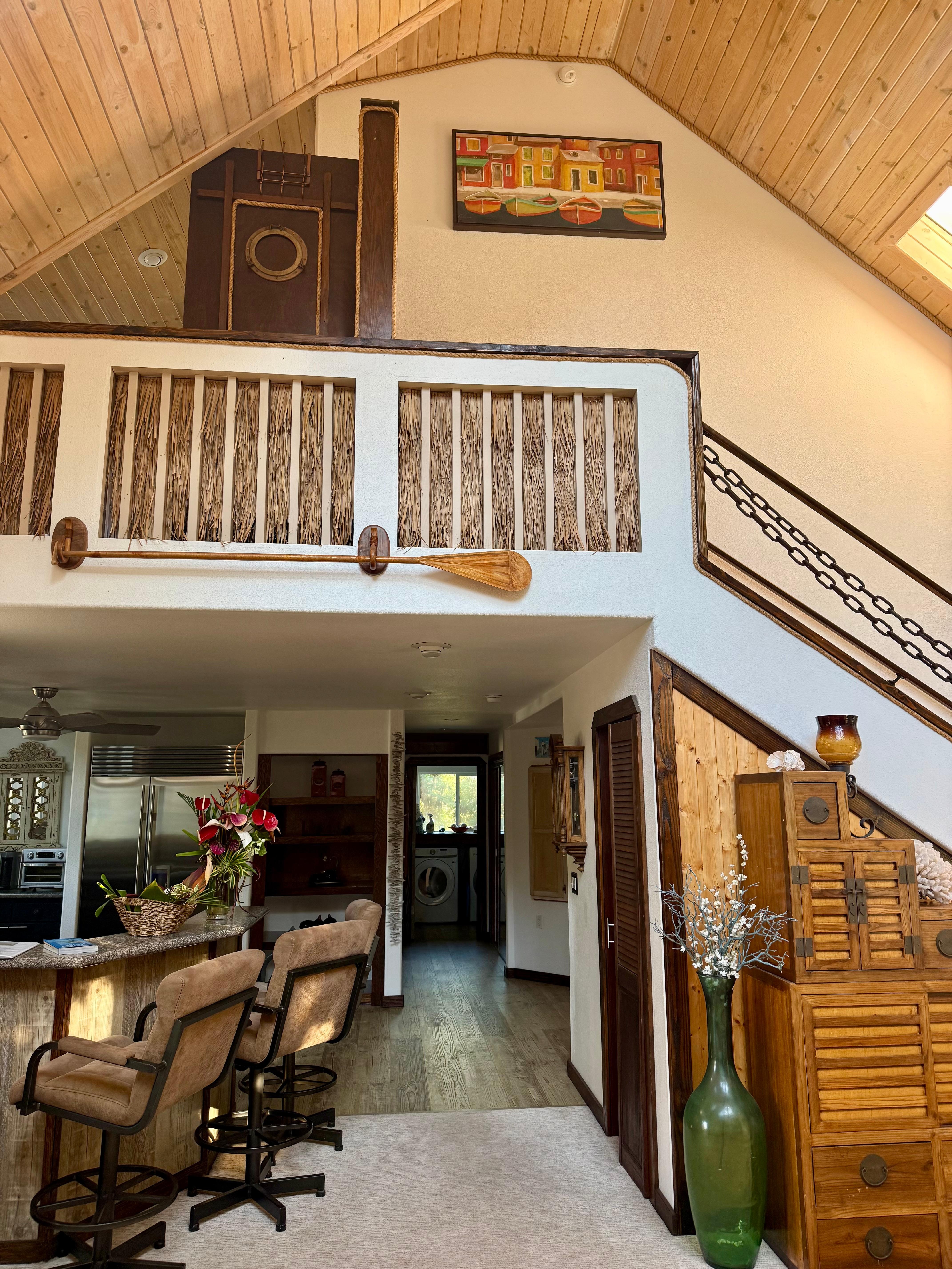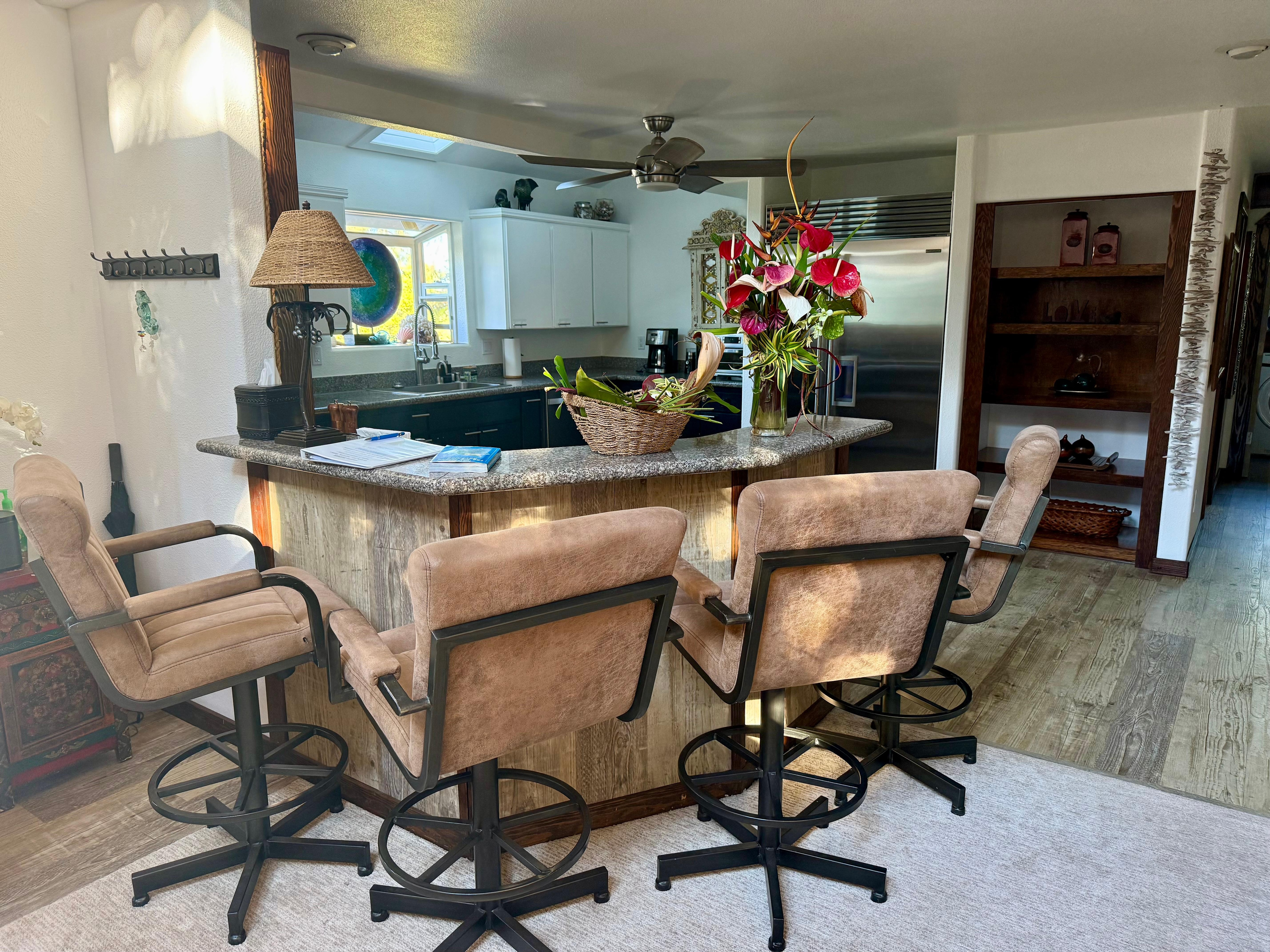 Enjoy the fresh air and cool breeze in this home’s many outdoor spaces. The entire property is surrounded by mature trees to bring an added level of privacy and create a truly peaceful retreat. Plus, there’s an abundance of fruits you can sample from the property’s trees, allowing you to get a true taste of island life. When you’re ready for dinner, grab some eats from the local market and dine al fresco with ocean views on the expansive deck. The views continue from the private hot tub where you can enjoy a relaxing soak before retiring inside for a restful night of sleep.