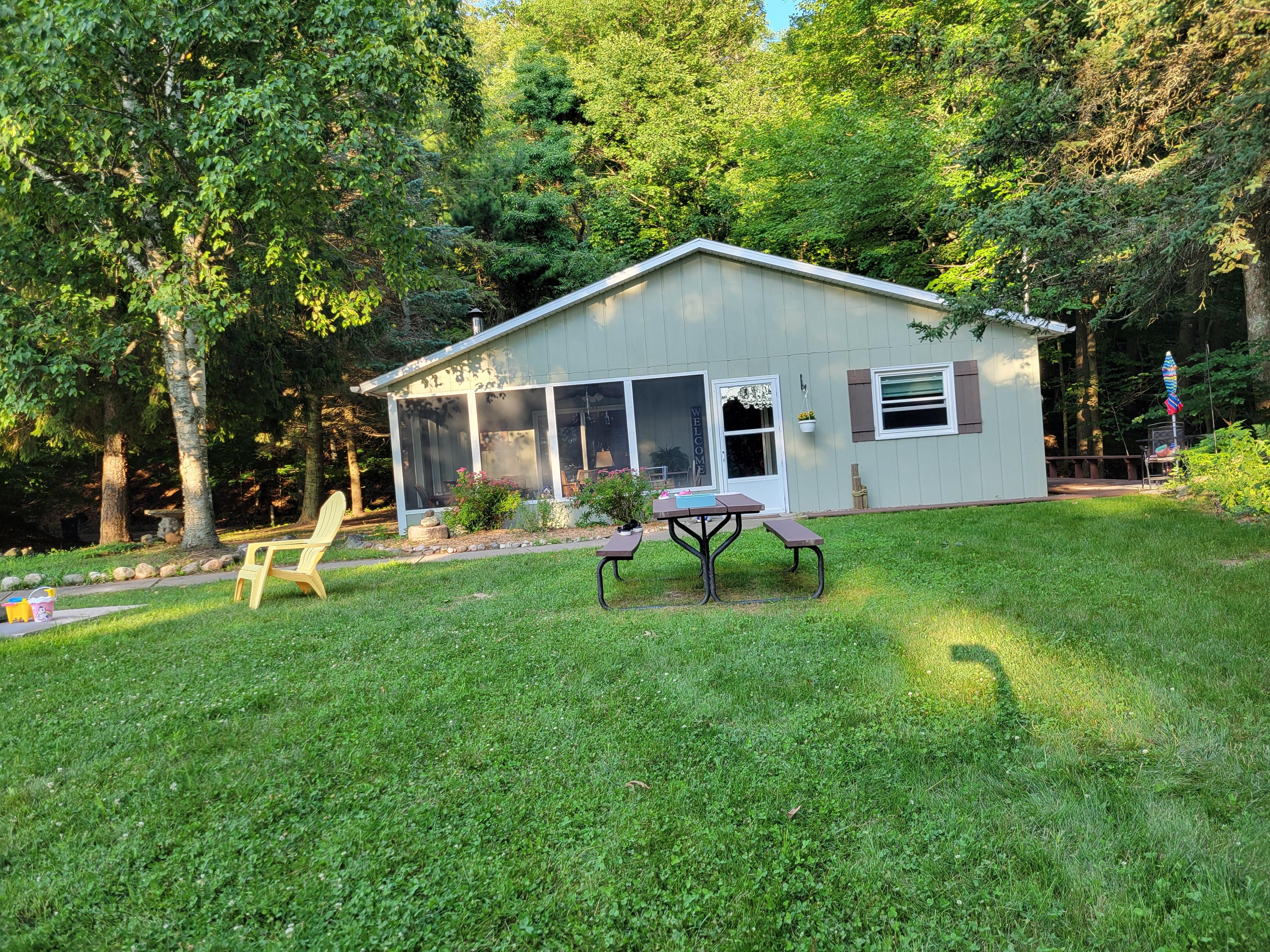 A large lawn separates the cottage from the path to the beach. There is no view of the lake or beach from the cottage. They are about 80 yards away.
