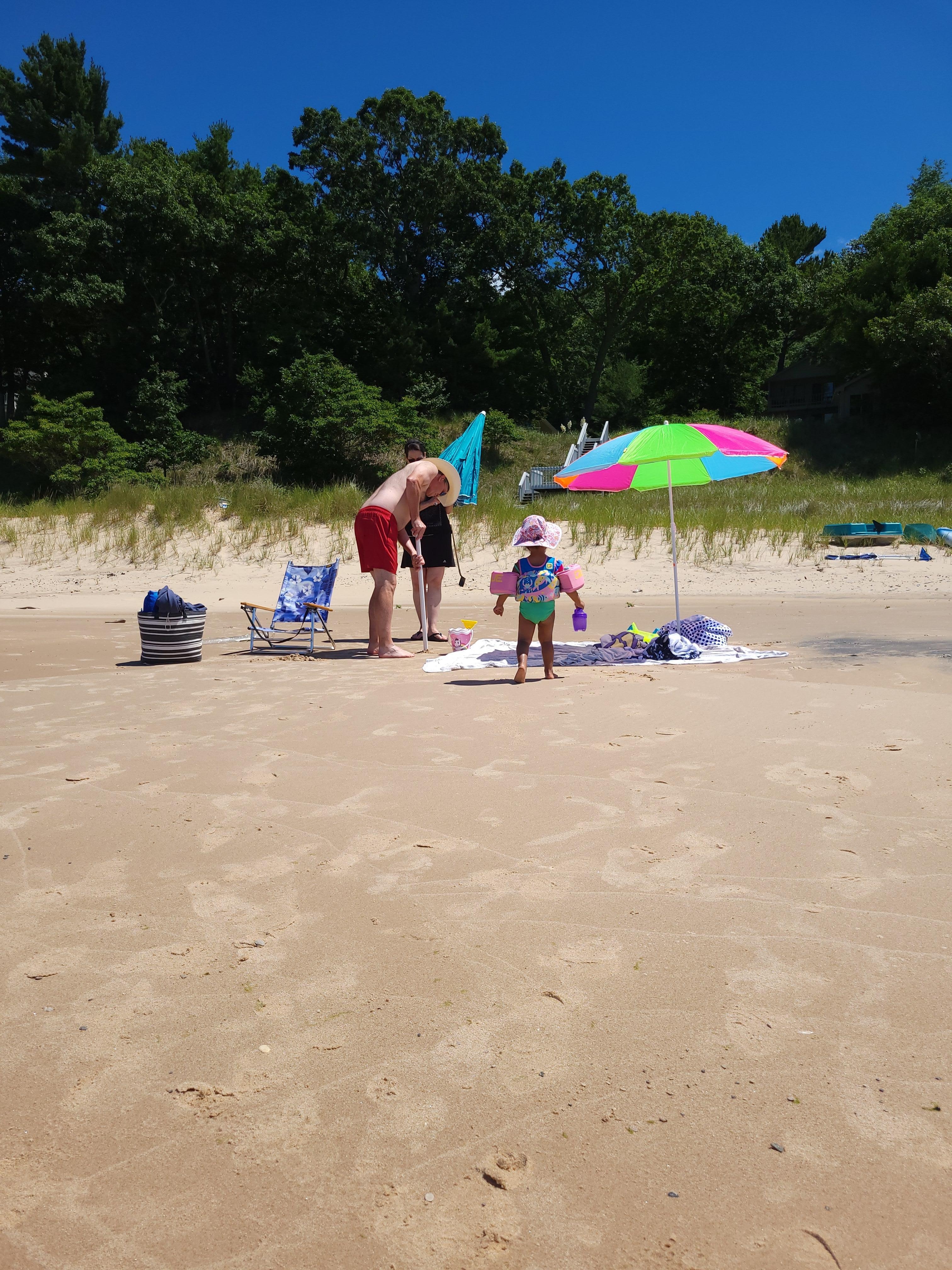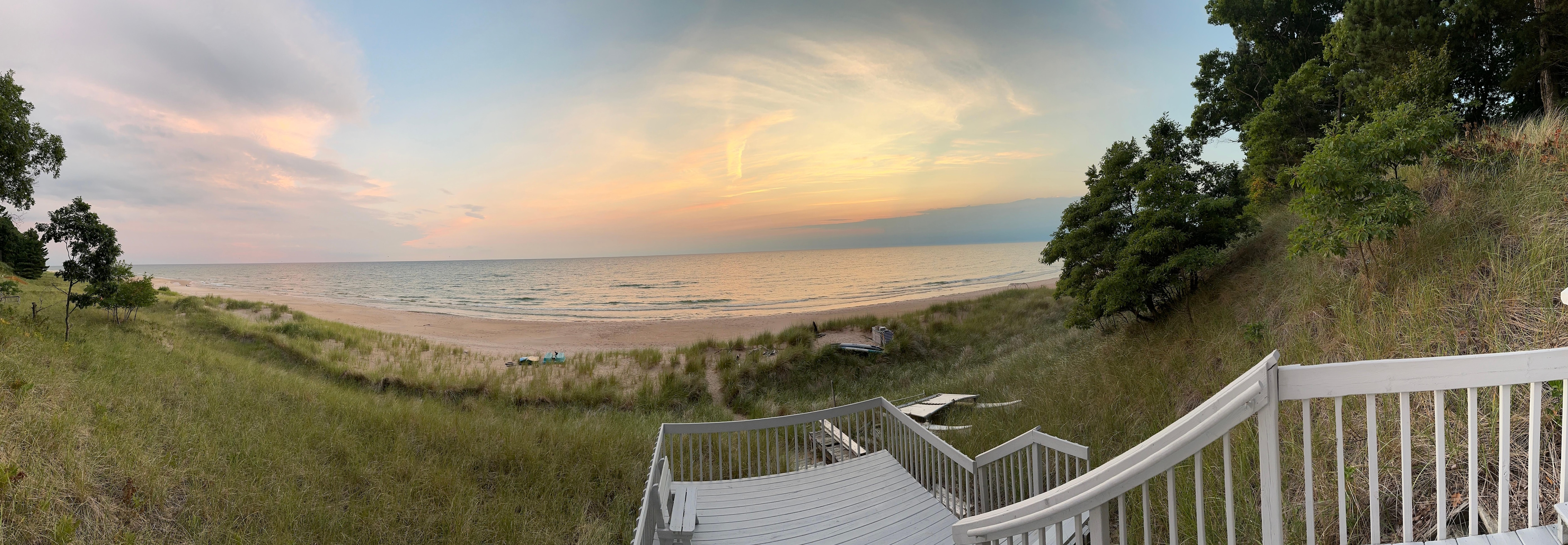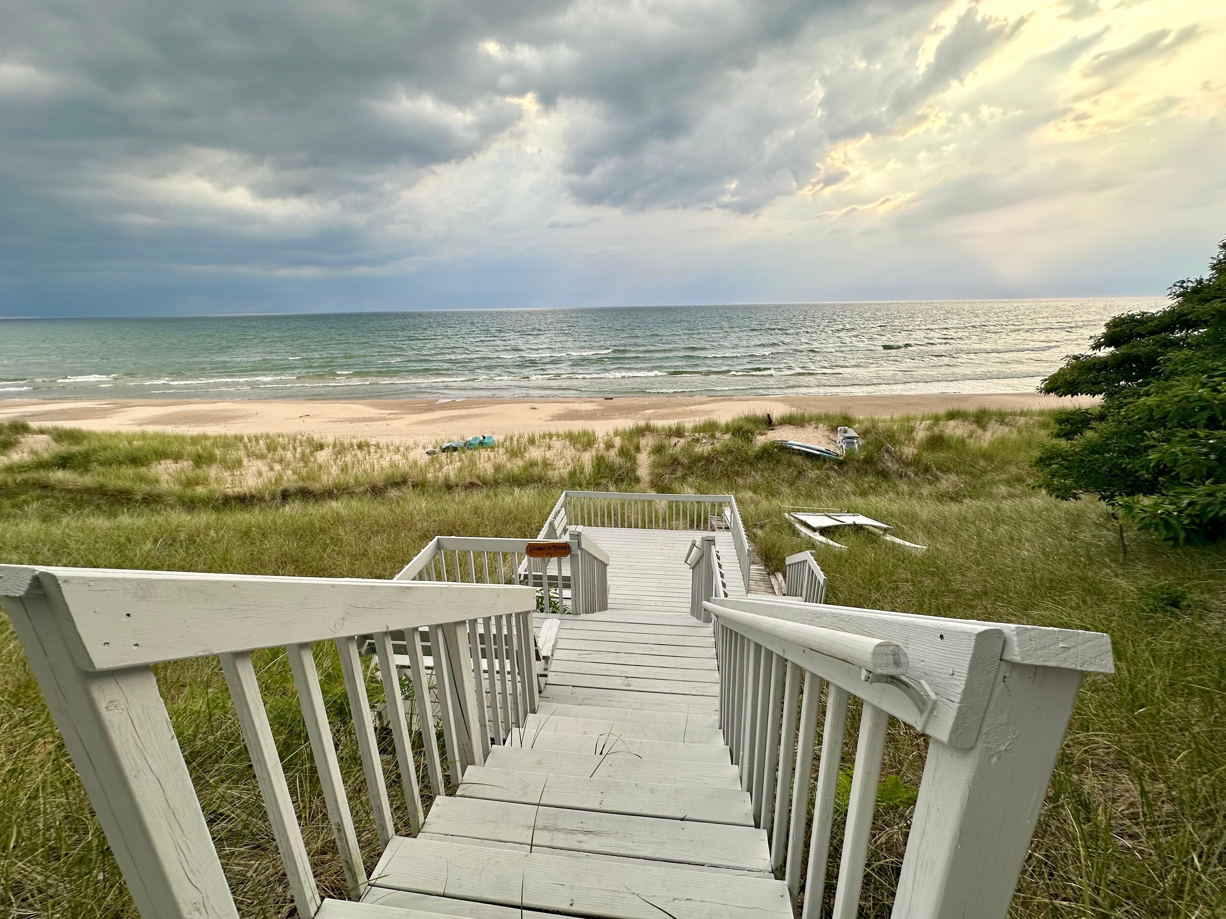 This cozy cottage will remind you of summers spent with grandparents, playing outside and on the beach all day, and board games at night. Two-hundred feet of beautiful, sandy Lake Michigan shoreline is shared with two other cottages. There is always room for everyone to have their own area. Lake Michigan is fickle, and the lake level goes up and down cyclically, but we always have a big beach. Currently it is huge!
