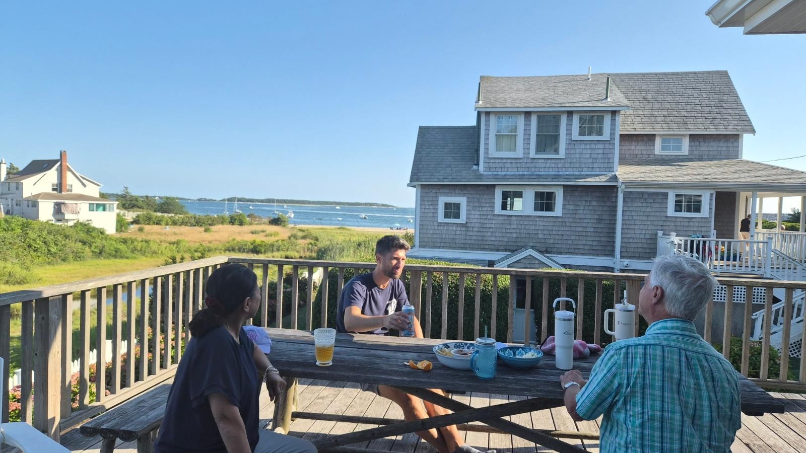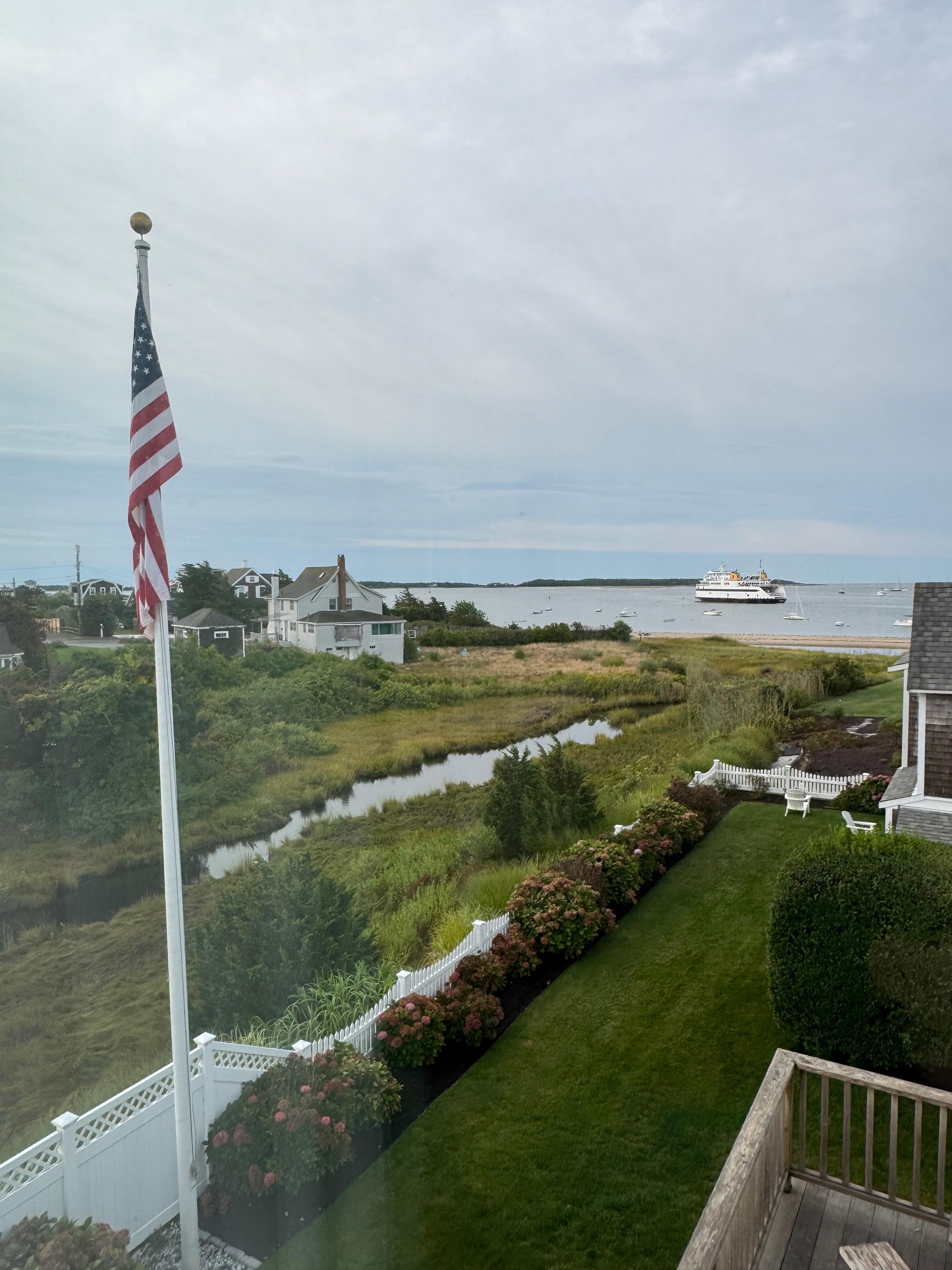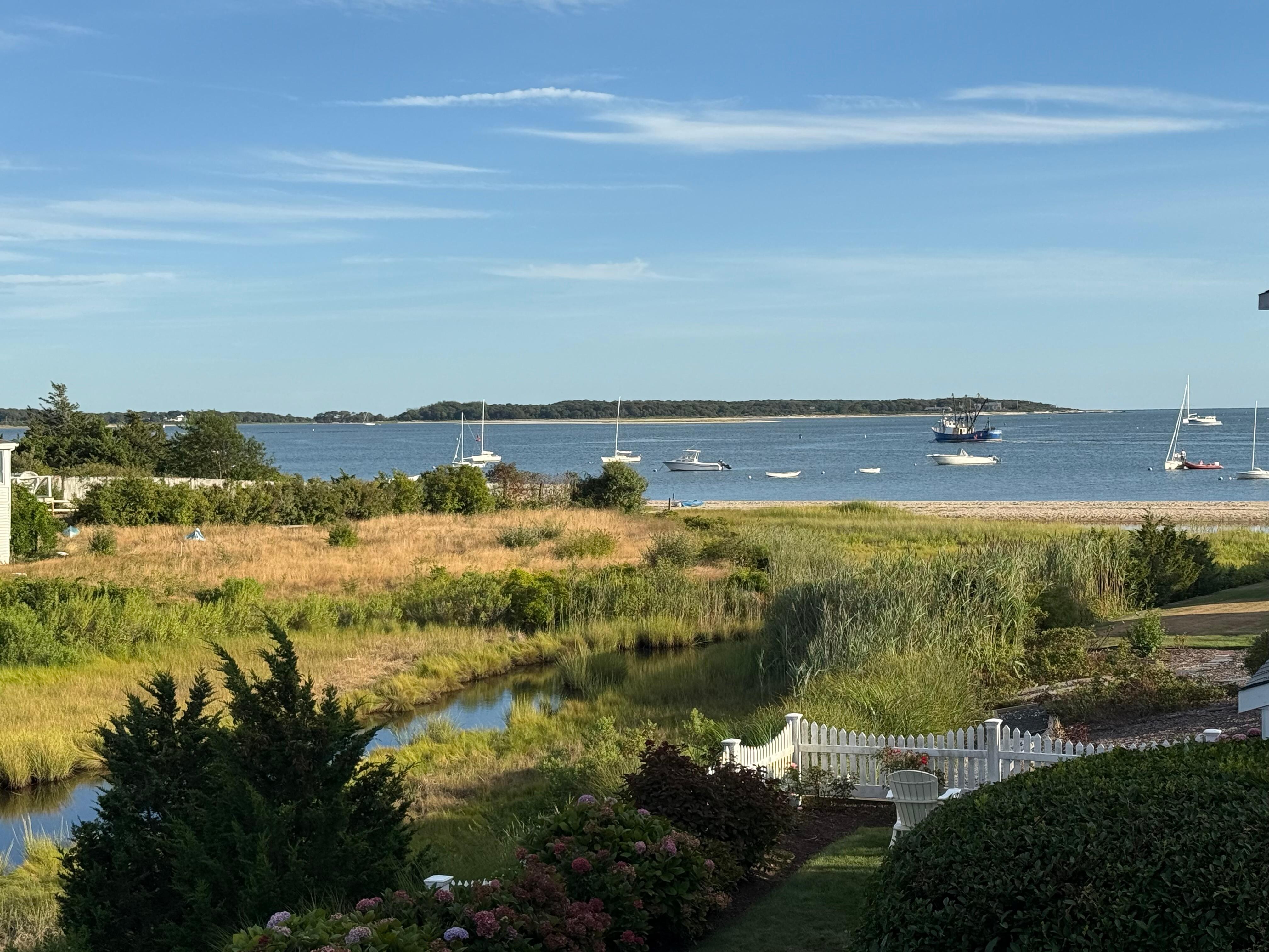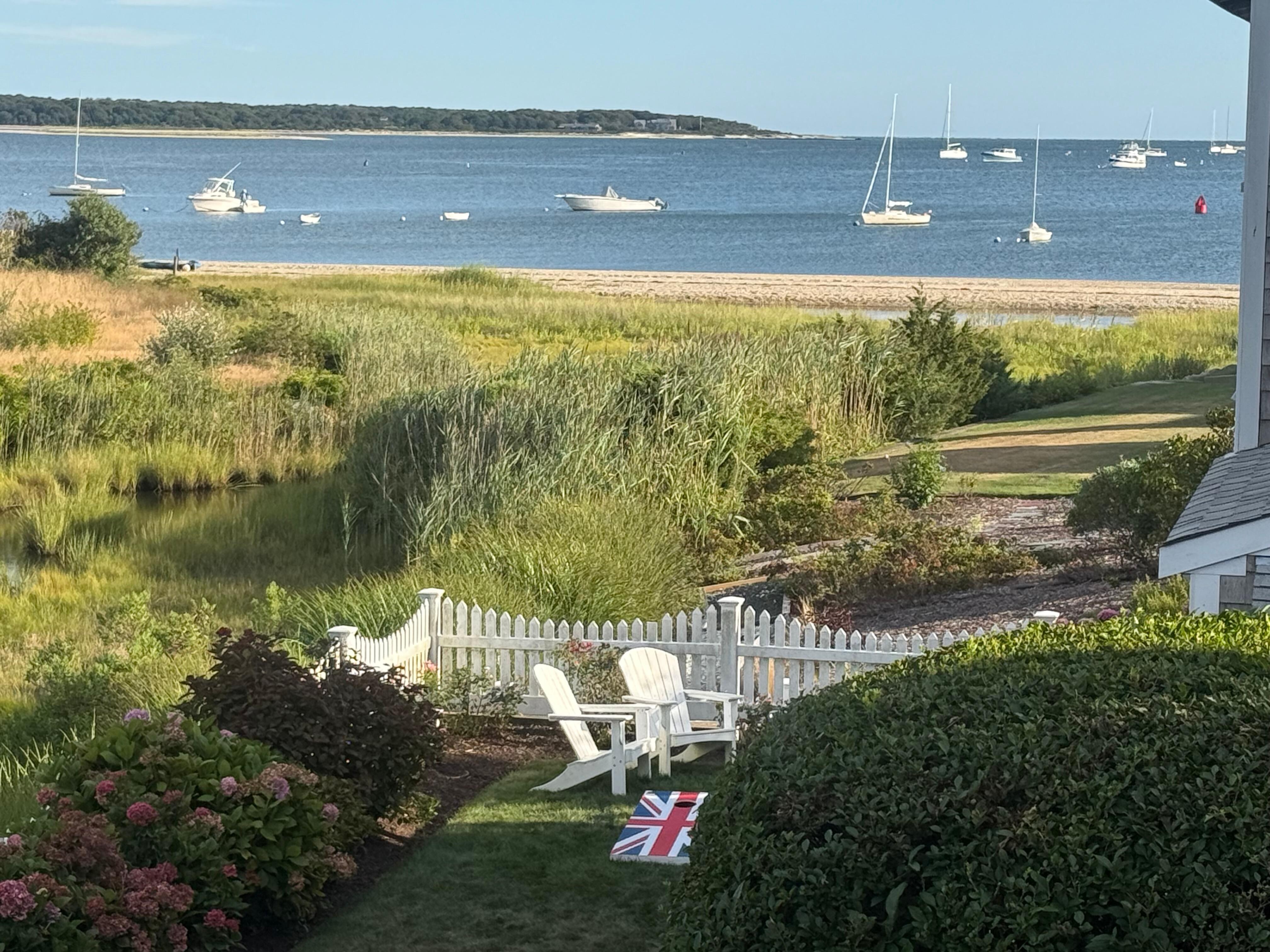 This luxurious four-story home has breathtaking views of the boats and ferries on Lewis Bay. The house is beautiful, well-furnished, very comfortable and sparkling clean. It sleeps 15 guests in six bedrooms plus a family room/seventh bedroom. Perfect for a family reunion, families of friends sharing a vacation, or a reunion of 15 friends. Everyone in real beds, with real mattresses, and great, cotton linens. No one has to sleep on a futon, sofa bed or bunk. Cribs are available for infants or young toddlers. The semi-private beach - with warm, shallow water, perfect for kids - is a few yards from the front door. Bayview Beach is around the corner. Renovated top to bottom, this house is a dream with modern amenities and the utmost in comfort. Wood floors throughout. Central A/C plus ceiling fans in every room. WIFI, cable TV, marble kitchen countertops, Keurig coffee brewer, marble/tile bathrooms, comfortable mattresses and good quality linens, original artwork, a sound system, a family/TV room (with two daybeds), large laundry room w/ big new W/D, outdoor gas grill, picnic tables, outdoor shower w/ dressing area, three decks and a patio, parking. The grounds are beautifully landscaped with hydrangeas and rose bushes. There is a small lawn where children can play. The house is walking distance to the Nantucket ferries, and about a mile's walk from downtown Hyannis.