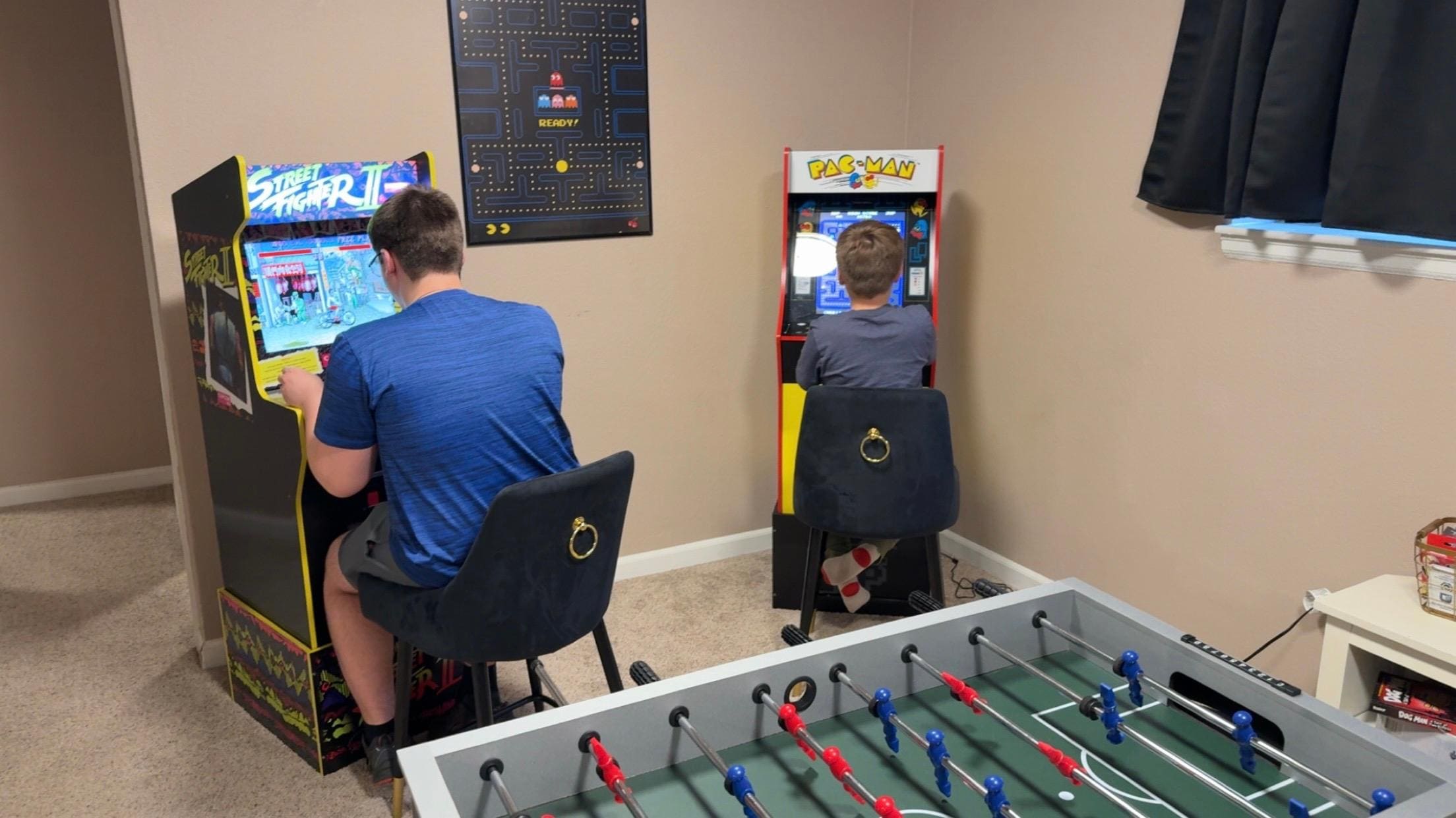 ▸ Entertaining game room with air hockey, arcade machine, and more
