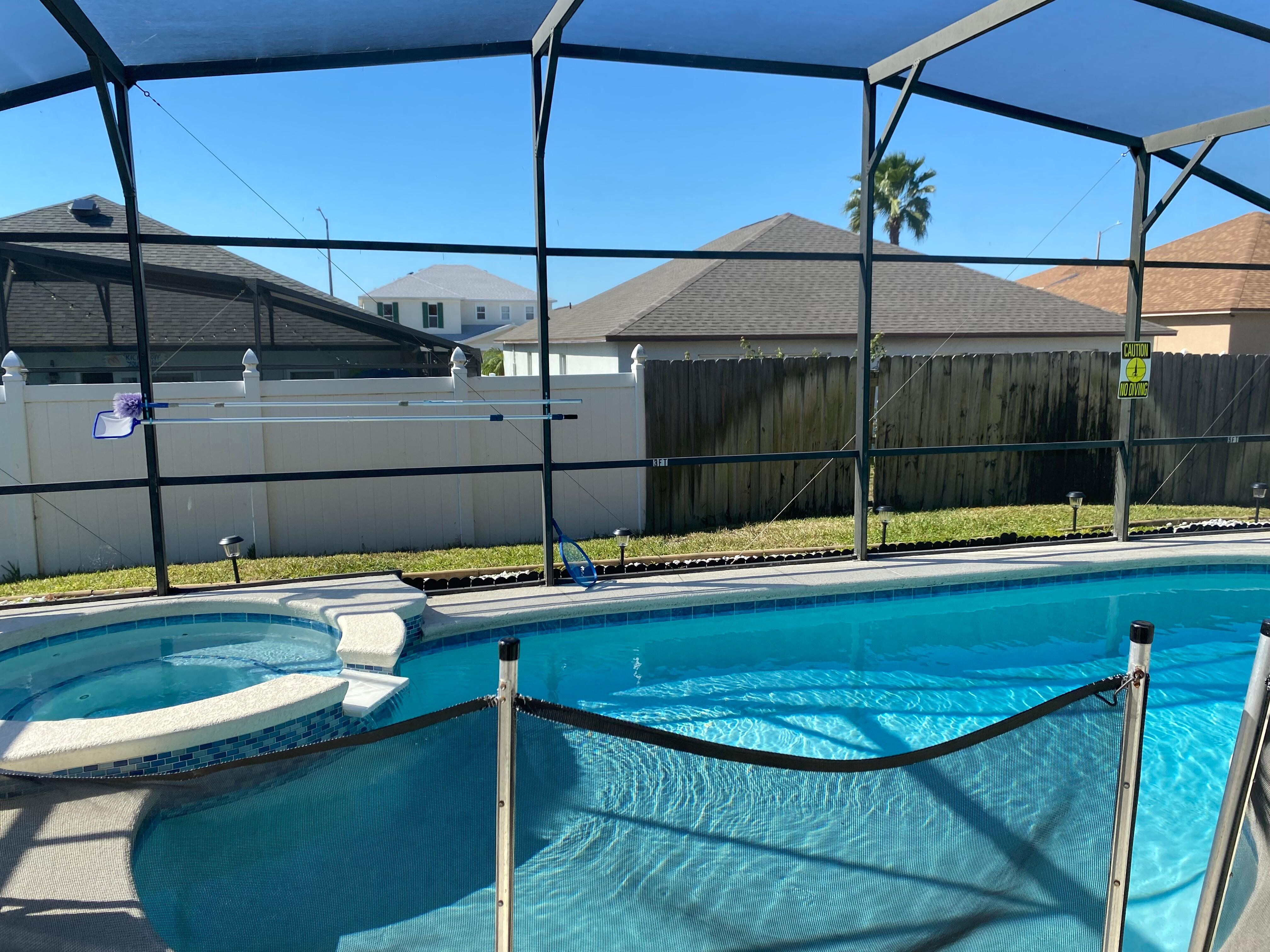Relax in the bubbling heated spa while watching your friends and family swim in the sparkling clear pool. Choose to have your meals indoors or eat poolside under the shade of the patio umbrella at the outdoor table with seating for four. Colorful outdoor plastic dinnerware is provided, as well as tropical themed flatware. Stretch out and relax in one of the two lounge chairs. The pool and deck area is surrounded by a screen enclosure. A child safety gate surrounds the pool area (pictured).