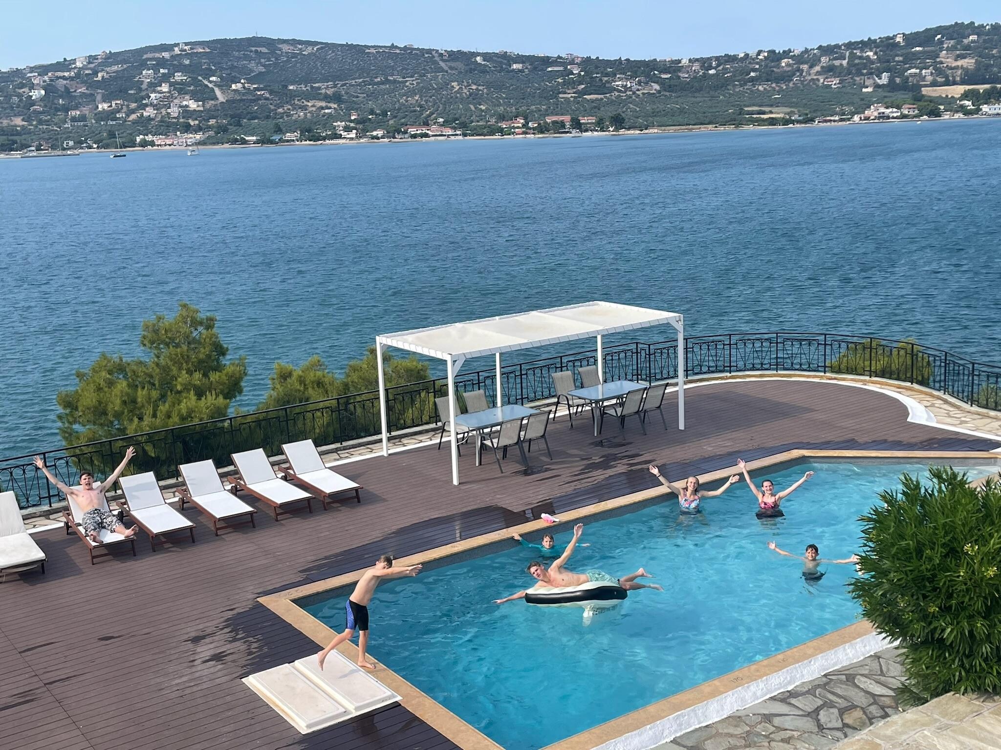The villa can accommodate up to 16 guests (total 550 sqm) and/or 8 guests (3 bedrooms ground floor and 1 attic bedroom with its own individual entrance, 240 sqm), of luxury and comfort. One of the most breathtaking characteristics of the villa is the private access to the sea (dives from the rocks and steps curved on the rocks for easiest swimming approach) and the swimming pool that captures guest's eye due to the endless blue that it faces.