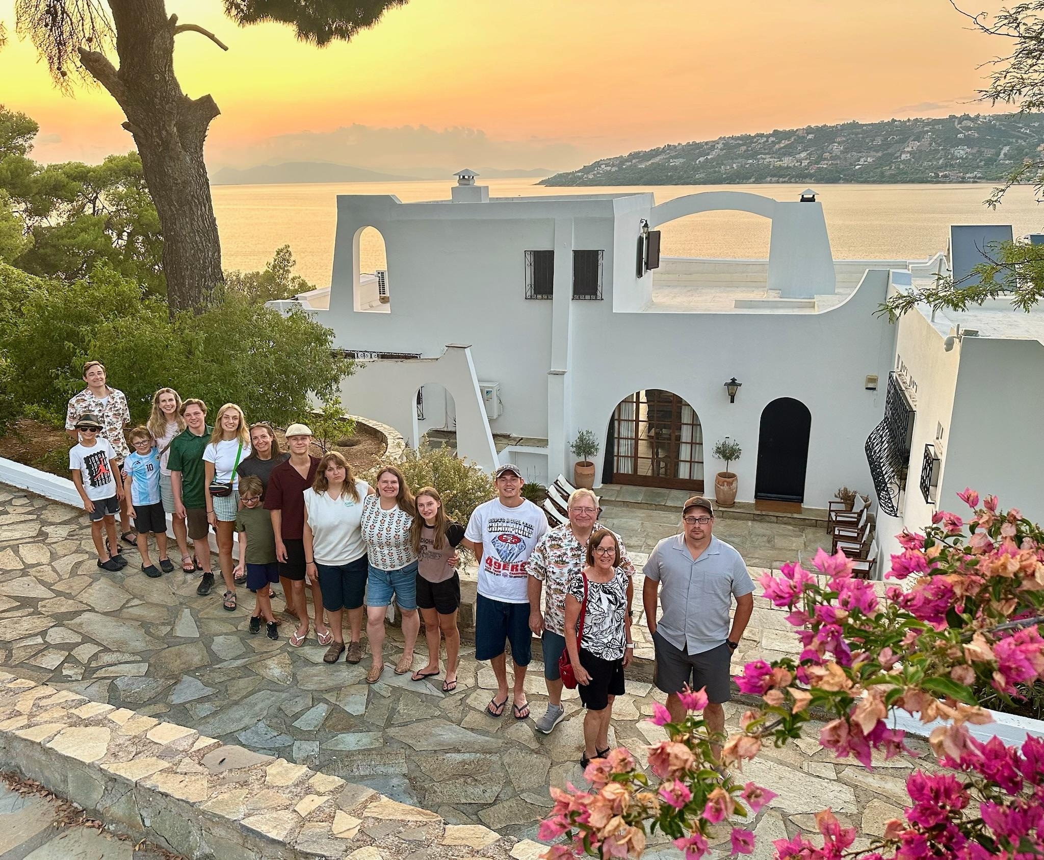It comprises of 5 bedrooms, all with renovated en suite bathrooms and a large family area which has 3 bedrooms, a private living room area and a luxury bathroom. All bedrooms have a King's size bed and are very spacious. The upper inside main dining room catering for up to 10 seated persons, fully equipped kitchen, a spacious living room area with fireplace and an extra bathroom for guests. The large veranda at the end of the living room and the ground floor veranda both have a panoramic view that can fascinate every guest, especially the moment when the sun sets into the sea. The bedroom with en suite bathroom in the attic can offer to guests a totally new experience of privacy and incredible view.