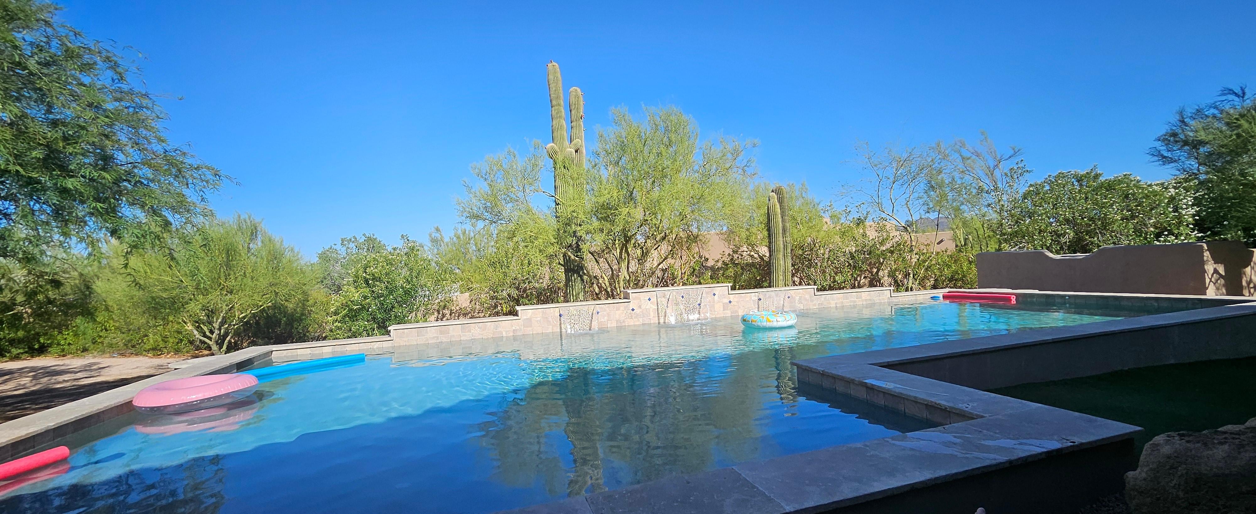 Cave Creek Desert Oasis, located five minutes from North Scottsdale, Arizona, boasts the same lavish amenities offered by our spa resort neighbors here in the desert—think huge rooms, multiple hot tubs, restaurant-worthy, "Climate Controlled" covered outdoor eating areas, one with a Japanese Teppanyaki grilling table, and available services like a personal chef, housekeeping, and a concierge to set up tours and expeditions—while also offering your group an opportunity to connect and rejuvenate in a comfortable, intimate setting in our amazing resort style heated pool, 2 large hot tubs, one extra large 2 person jetted tub in the primary suite, one of a kind back patio and front court yard, outside sunken fireplace all with views of the mountains and the colorful bursting sunsets the Scottsdale desert is so famous for!