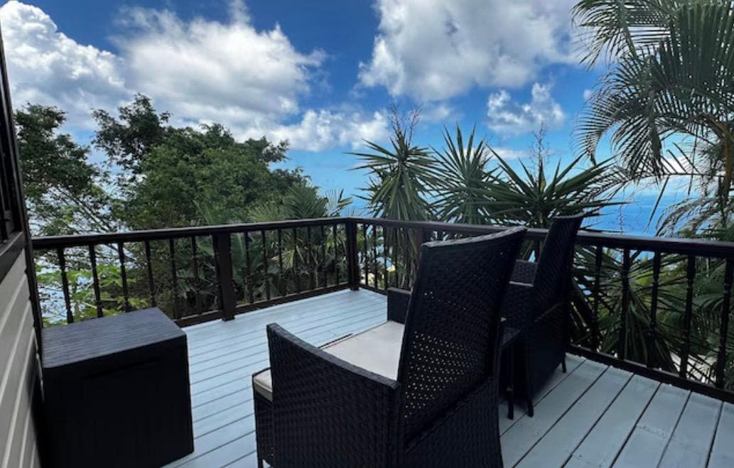 Outdoor deck with space for two to sit down and unwind, whilst looking out onto the garden and towards Jost Van Dyke island;