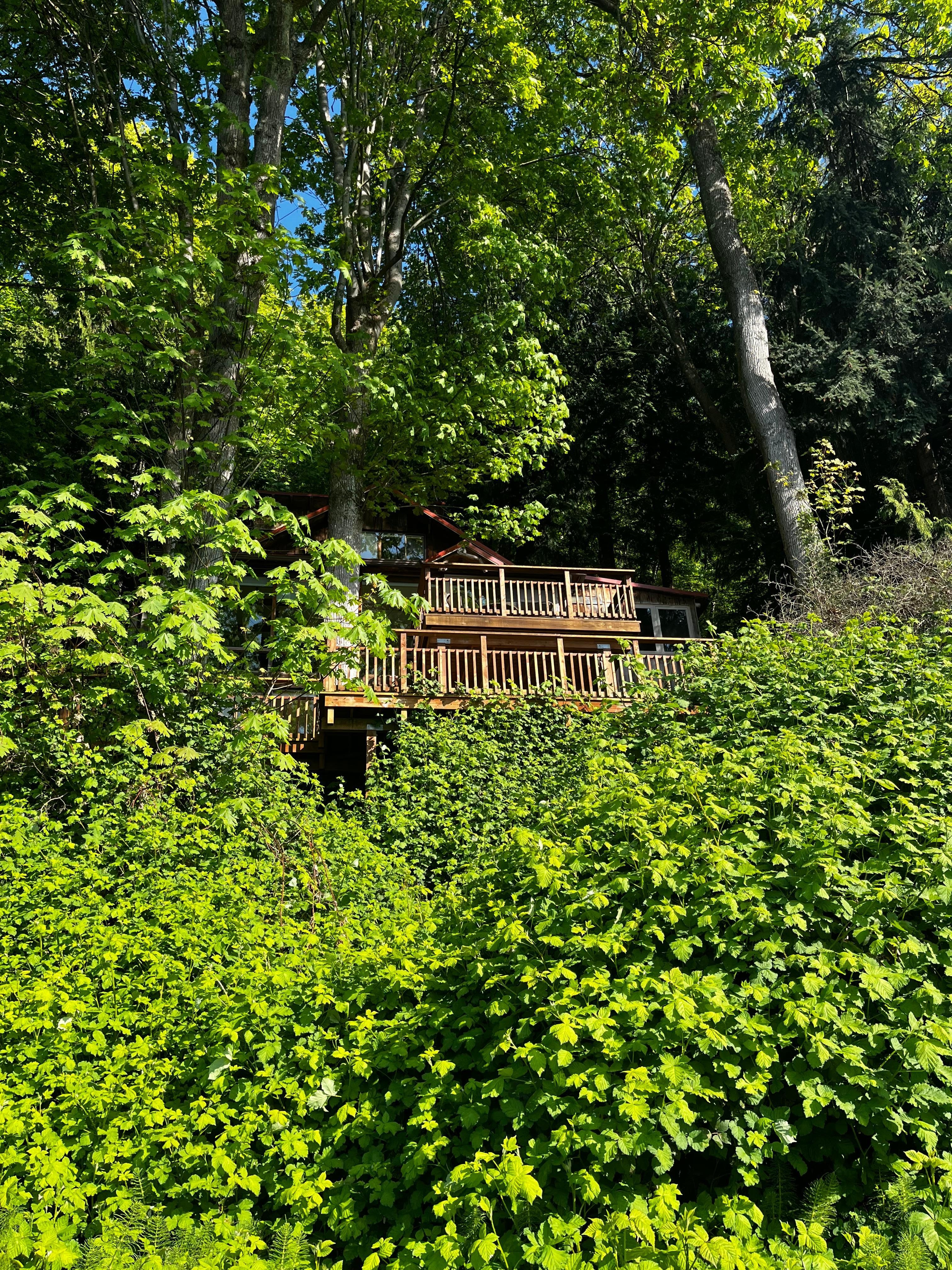 Full Lake and Ocean views from all 5 floors of this rustic hand built treasure, nestled in nature, this lake waterfront home feels like a tree house. Perched just above Picnic Point Lake, descend rope railing stairs to our bent tree entrance, continue further down stairs to patios and the lake waterfront clearing to relax. Our oasis is a hand built treasure, from the the front door tree archway, the rounded staircase or hobbit doors. A Hand made treasure with 3 decks/balconies or take a stroll to Picnic Point Park for Ocean access. Lots of stairs, and trains which run very often during the day and 2-4 times at night. Ear plugs if you are a light sleeper. Loft is best for early risers, as there are no curtains. Children are allowed, however at your own risk, this home is not set up for young children. Our Wabi Sabi style envelops the wilderness surrounding Picnic Point.