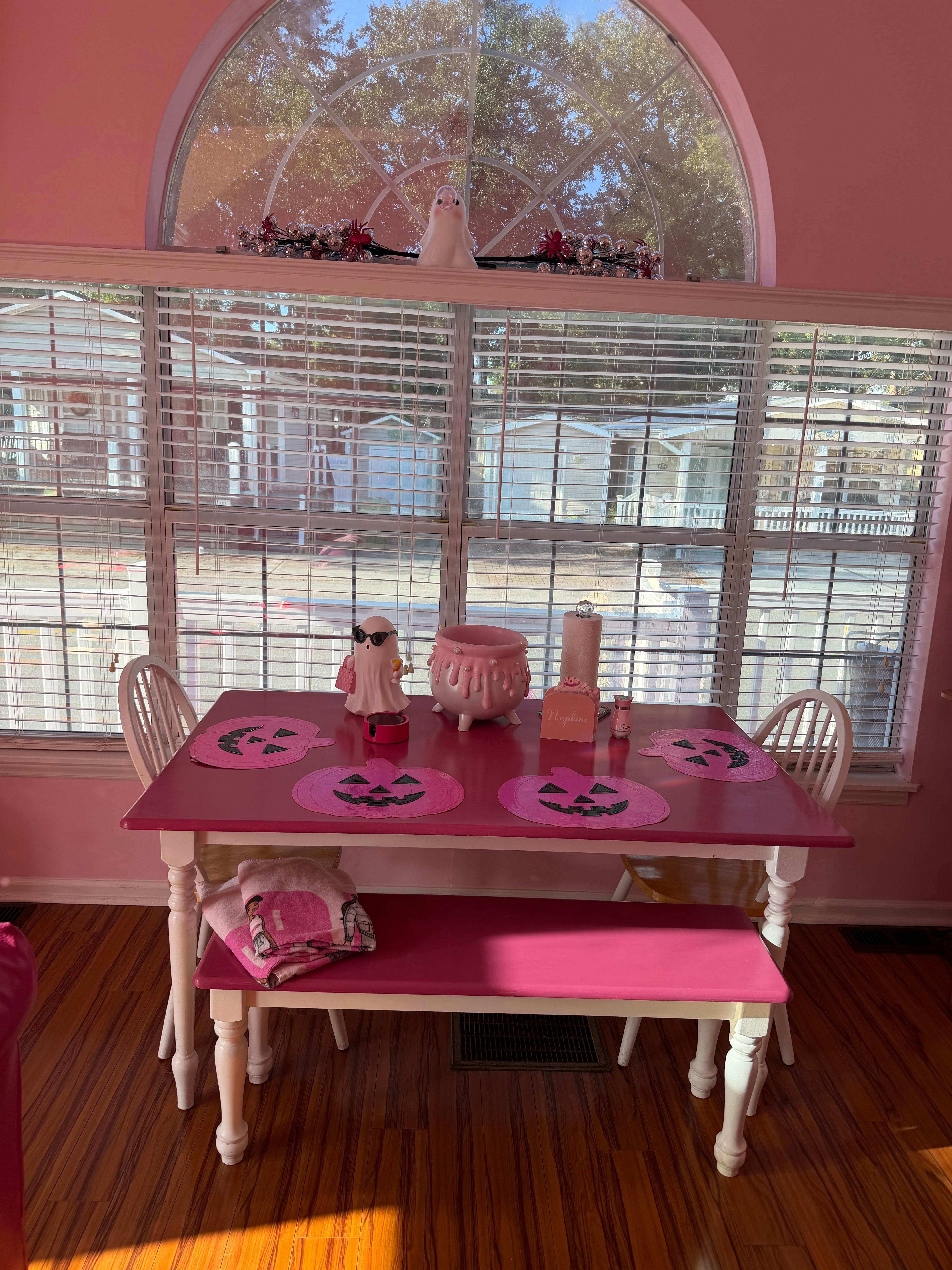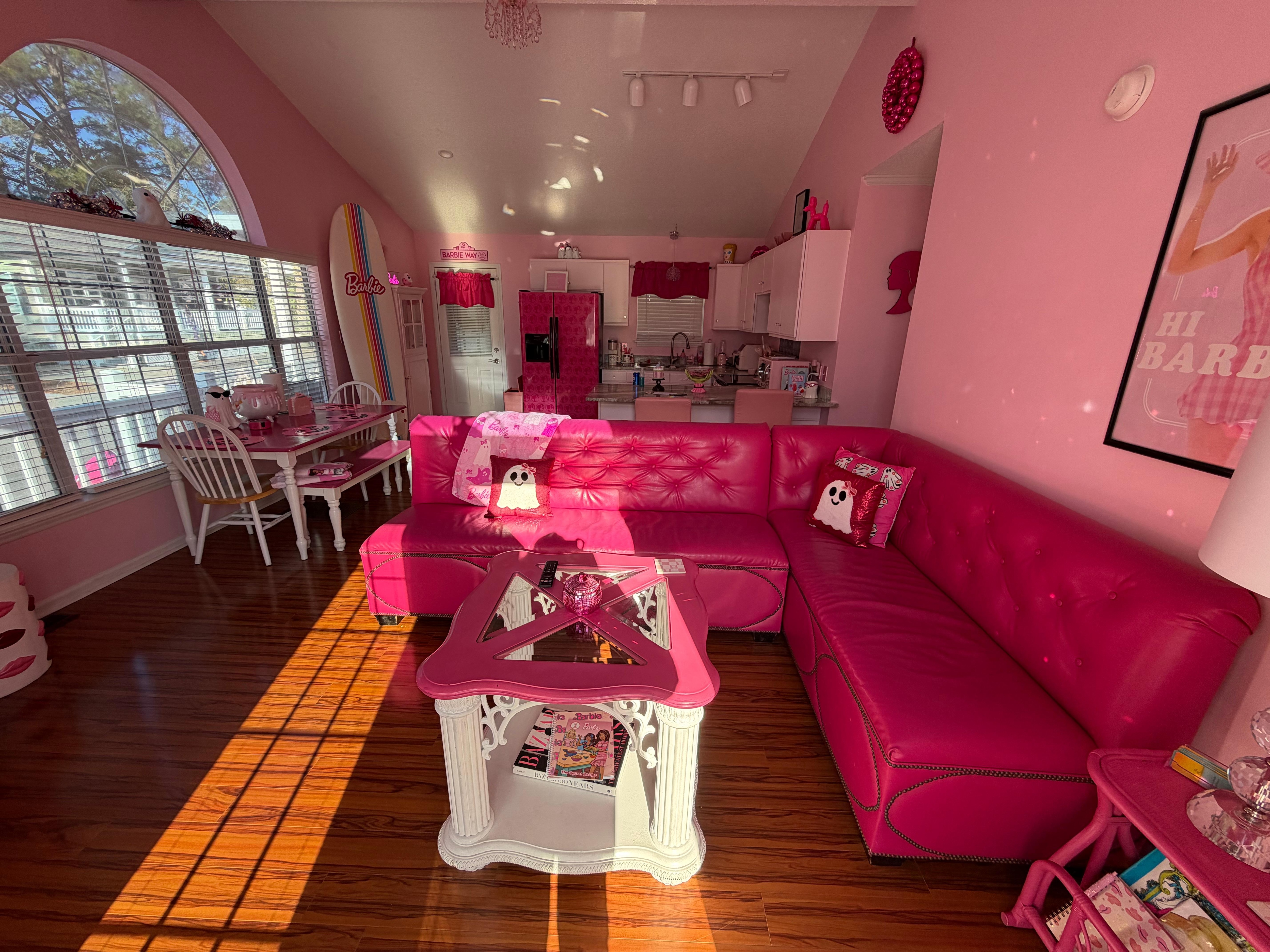 PINK, PINK, PINK! Everything is decorated in elegant pink. There is even a photo box inside to take pictures in. The kitchen is stocked with all new pink appliances: microwave, juicer, blender, Keurig coffee pot, utensils, pots and pans.