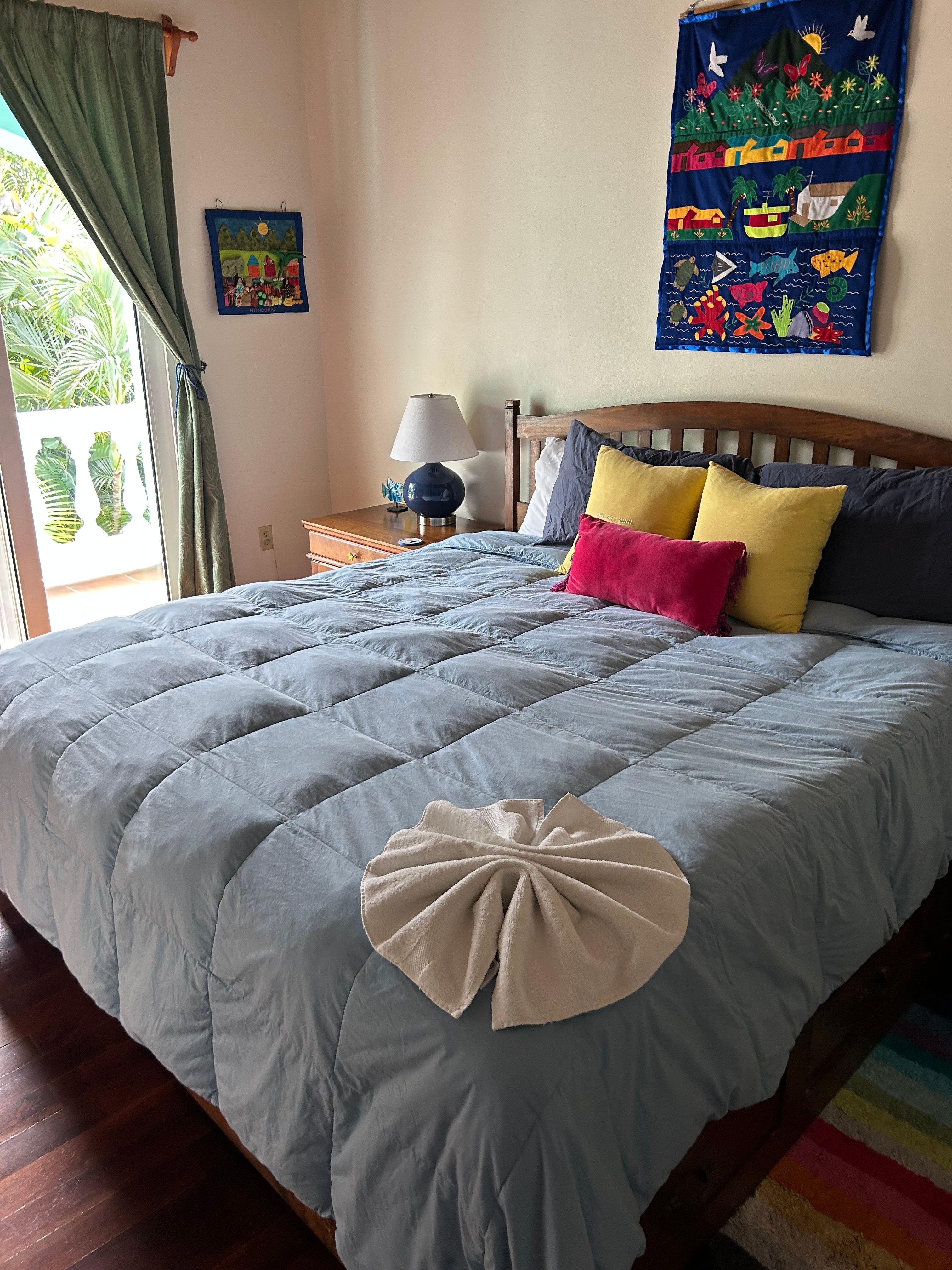 Three bedrooms upstairs all offer king-size beds and views of the surrounding areas. Nothing beats waking up to blue skies and turquoise seas every day!