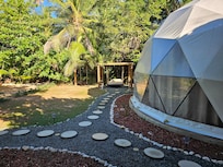 The pics of the property are deceiving. The Jacuzzi/hot tub didn't heat itself, had to constantly run back and forth to keep adding hot water to get it warm. Only 2 jets out of the whole warm tub worked. The bed swing is dilapidated and one of the 2 swings was laying on the ground broken. The door had no guts in it so when it rained water came in which caused me to slip on the rubber mat they had in front of the door taking a chunk of meat out of my foot on the edge of tile. Only way to keep it closed was the electronic lock on it which batteries need changing. There are mold spots across the ceiling of the dome inside. There were 2 plastic chairs we had available to sit in at the plastic card table and the one I sat in broke dumping me onto the tile. The solar lights do not work and were replaced with cheap stick in the ground ones that gave off very little. The lights on the swing bed haven't worked in a very long time. Battery powered. There was no wood for the fire pit. Had to scrounge through the woods. The faucet on outdoor kitchen sink is just about to completely fall off. Shower wand only has cold water, main shower is hot. There were no wash cloths or beach towels so bring them. No hair dryer, bring one. Hammock was filled with spider nests and eggs. The best for last...Don't expect any peace and quiet!!! You are BOMBARDED with practically deafening farm noise just through the foliage...starting at 4 am, roosters, dogs, sheep, cows etc..i have pics and vid...