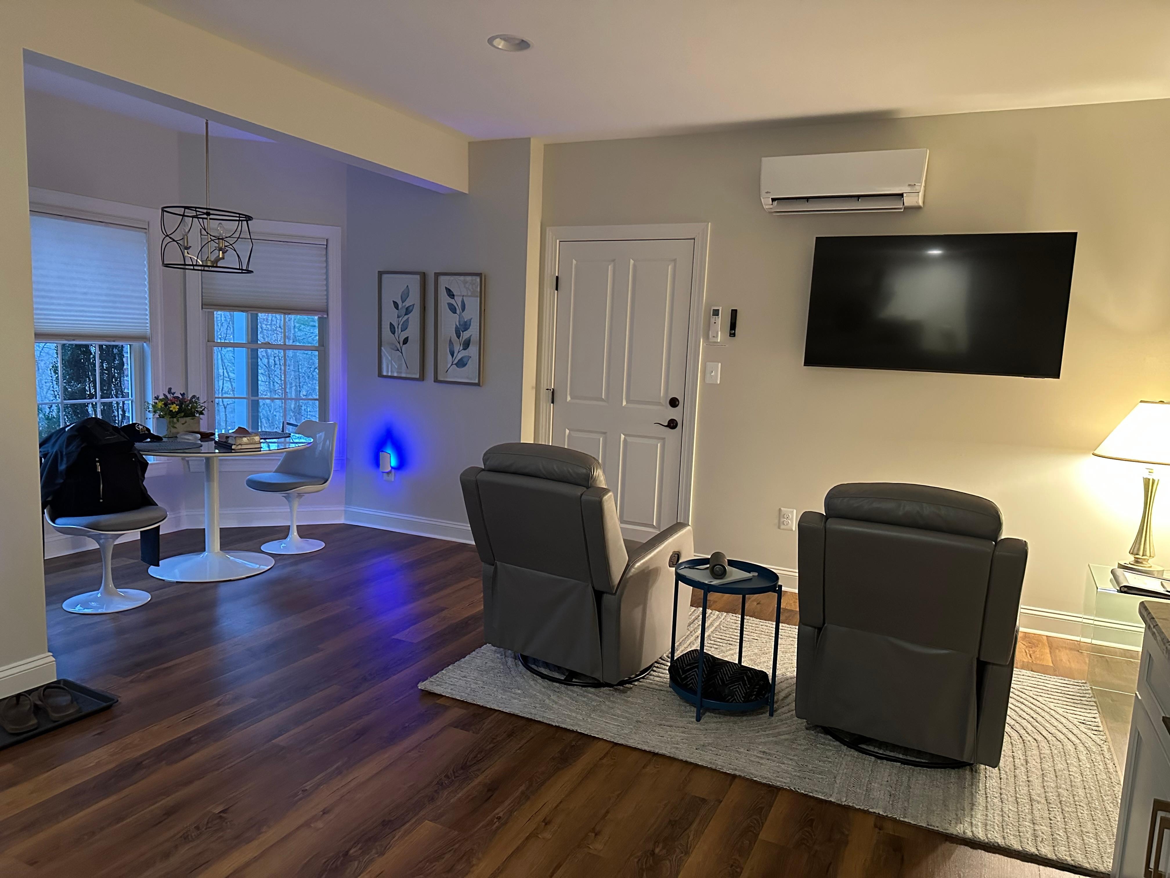 Located in a quiet rural cul-de-sac in Harford County's farming community, this gem sits above a 7-acre lake amongst beautiful, wooded scenery. Grande View 1 is a newly built and furnished apartment with queen bedroom, full bath, kitchen & laundry as well as the ability to control heat and air. Lake access is a short walk through one of our three wooded trails from the house. Full 365-degree access to the lake for fishing, kayaking and birdwatching is available.