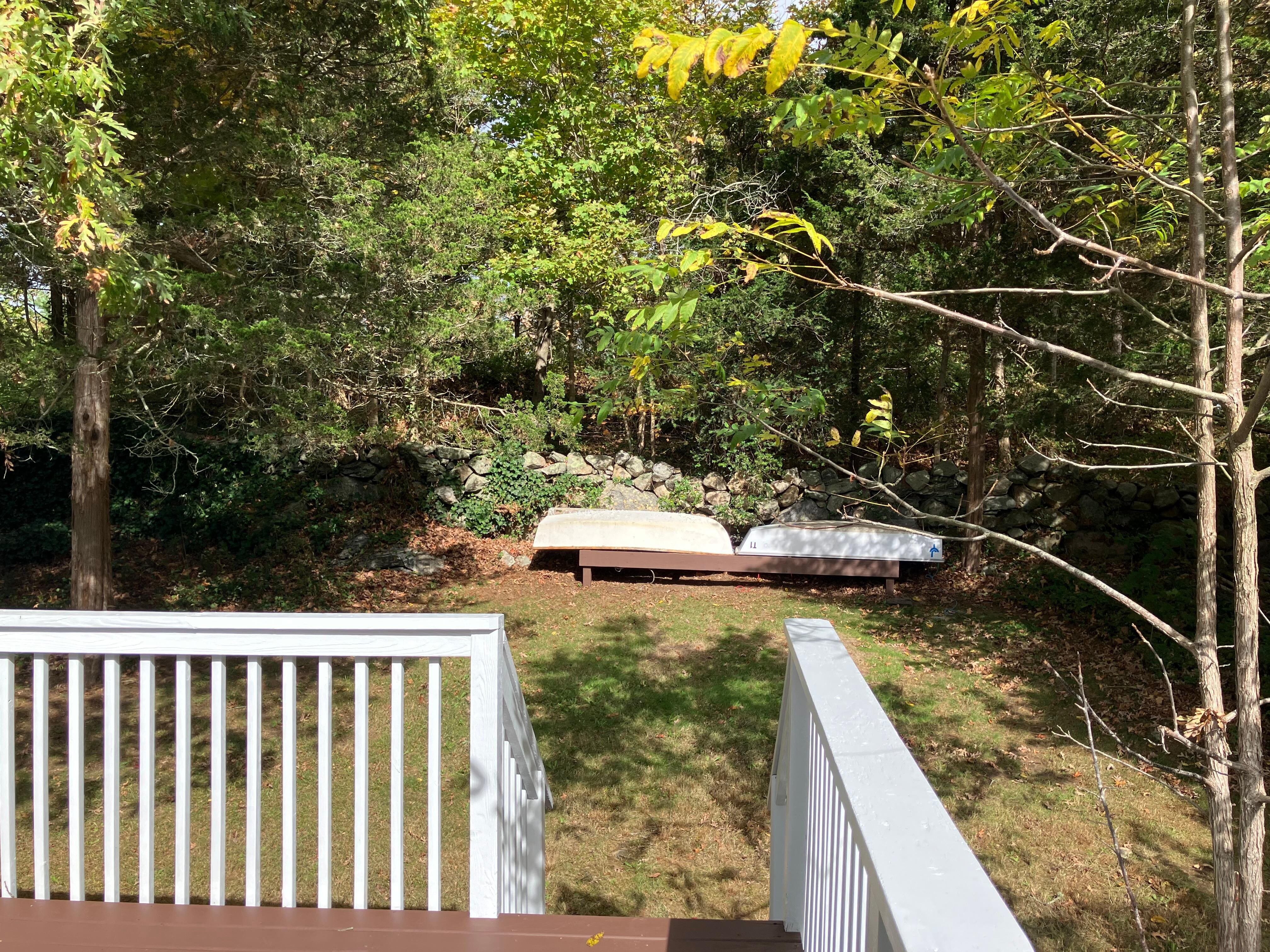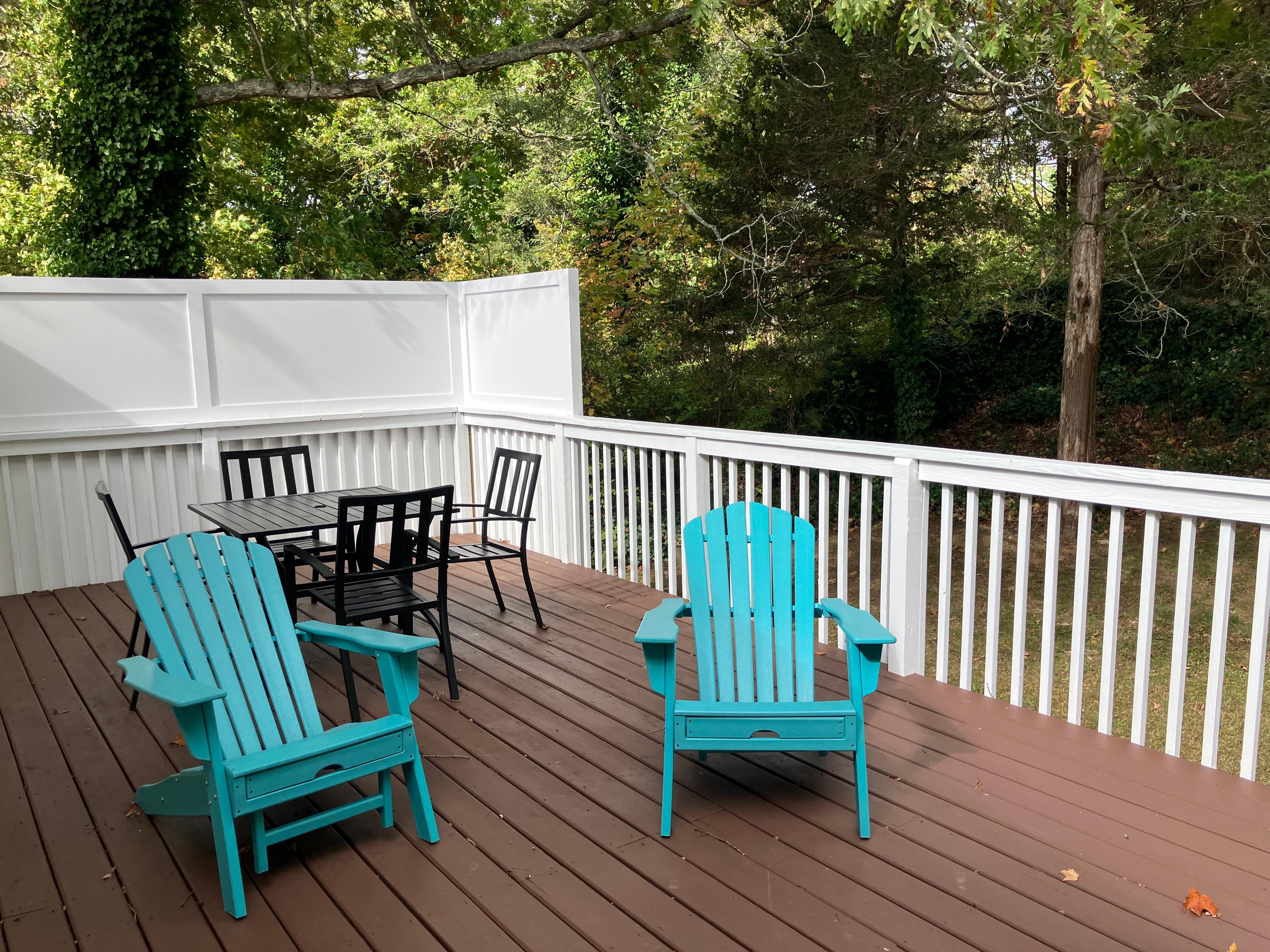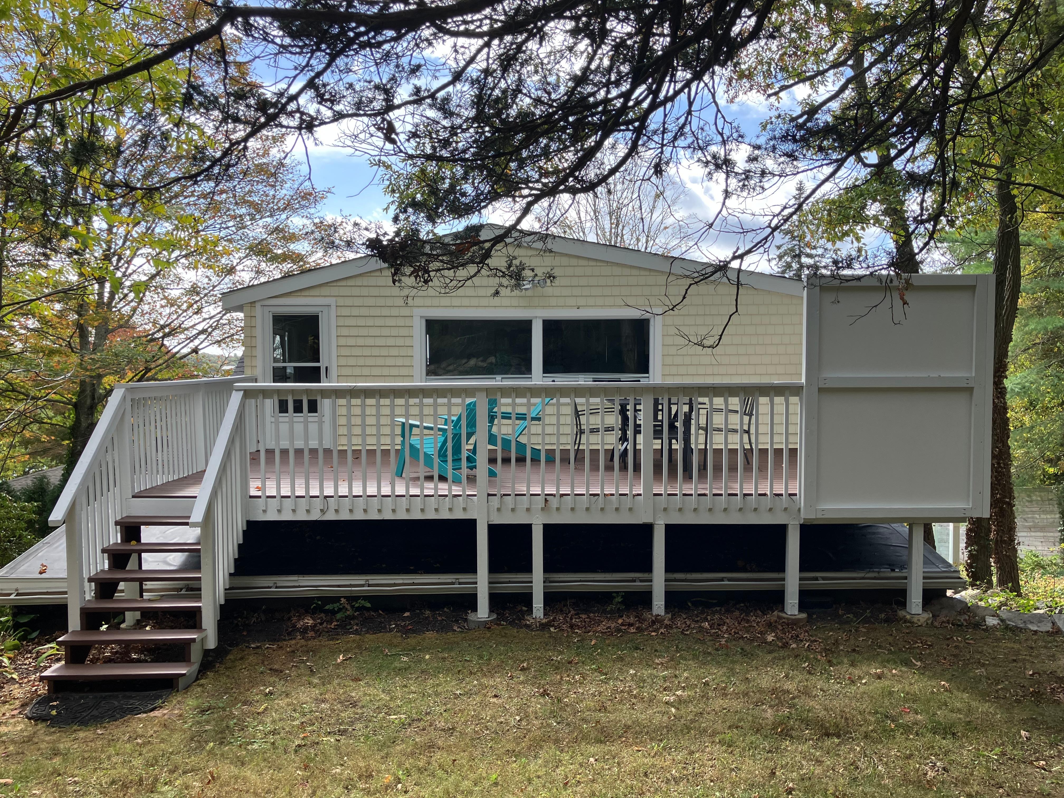 Off the back is a large deck with both Adirondack chairs and a dining table, and offers partial views to the river.
