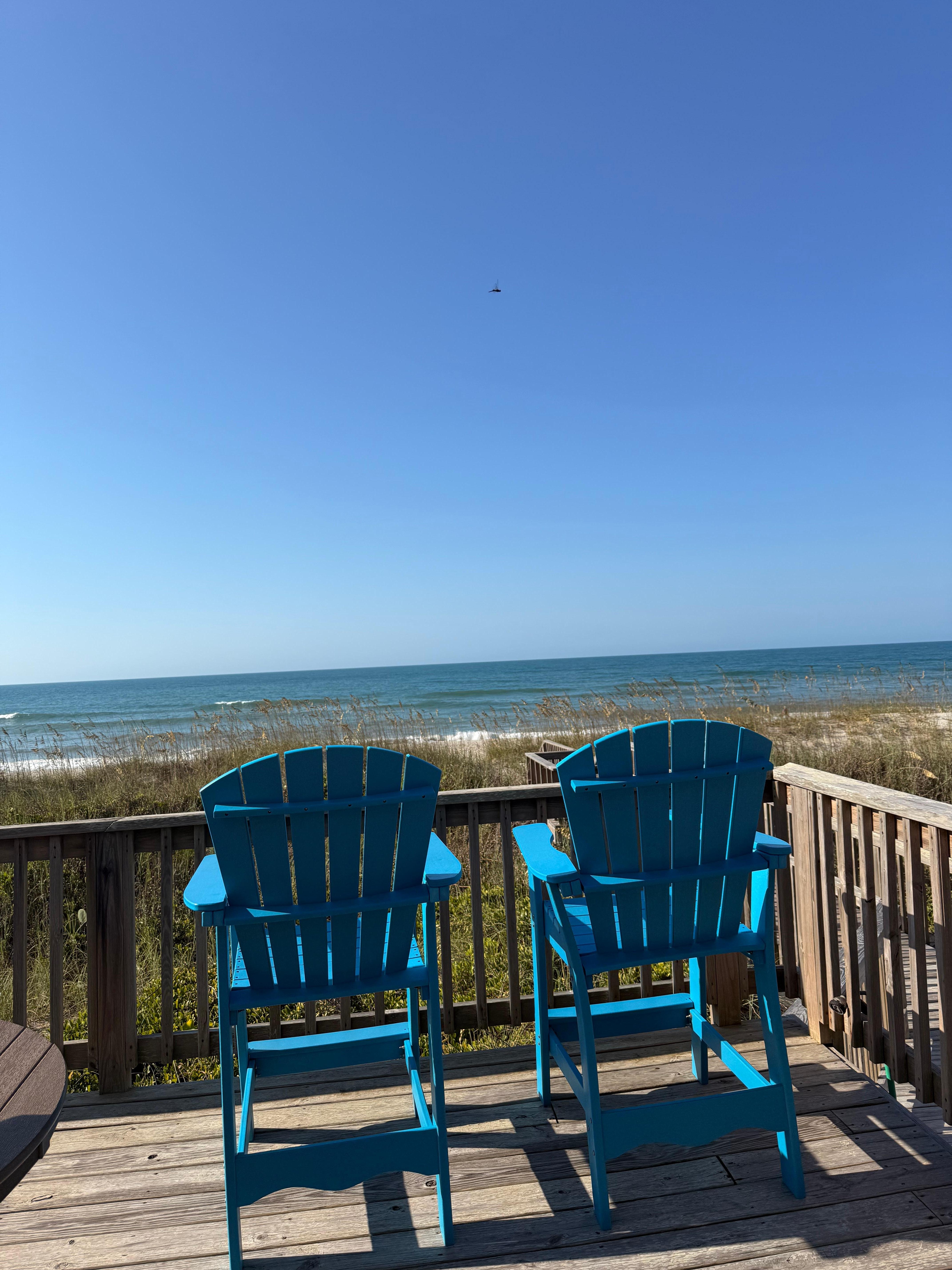 Welcome to "Best Life". See our 100+ five star reviews on VRBO over 10 years. Most of our bookings are return guests - that tells you everything you need to know. This is a very clean, well maintained and fully furnished OCEAN FRONT home - not a condo - in beautiful Emerald Isle, NC. It has a full-on ocean view from the deck, bedrooms and the living room, not partial views and not over the street or rooftops. It is the private half of a duplex. The other side of the duplex is not a rental; it is someone's rarely used second home, so you will not have any crazy or noisy neighbors, parties or big groups next door. The kitchen and baths were completely renovated in 2023; see photos! You''re likely to see dolphins frolicking in the ocean. Unlike staying in a condo complex, you'll have privacy and no worries about noise, sharing the deck or annoying neighbors. No dogs. Perfect for families with children. The house is close to a lifeguard station on the beach.