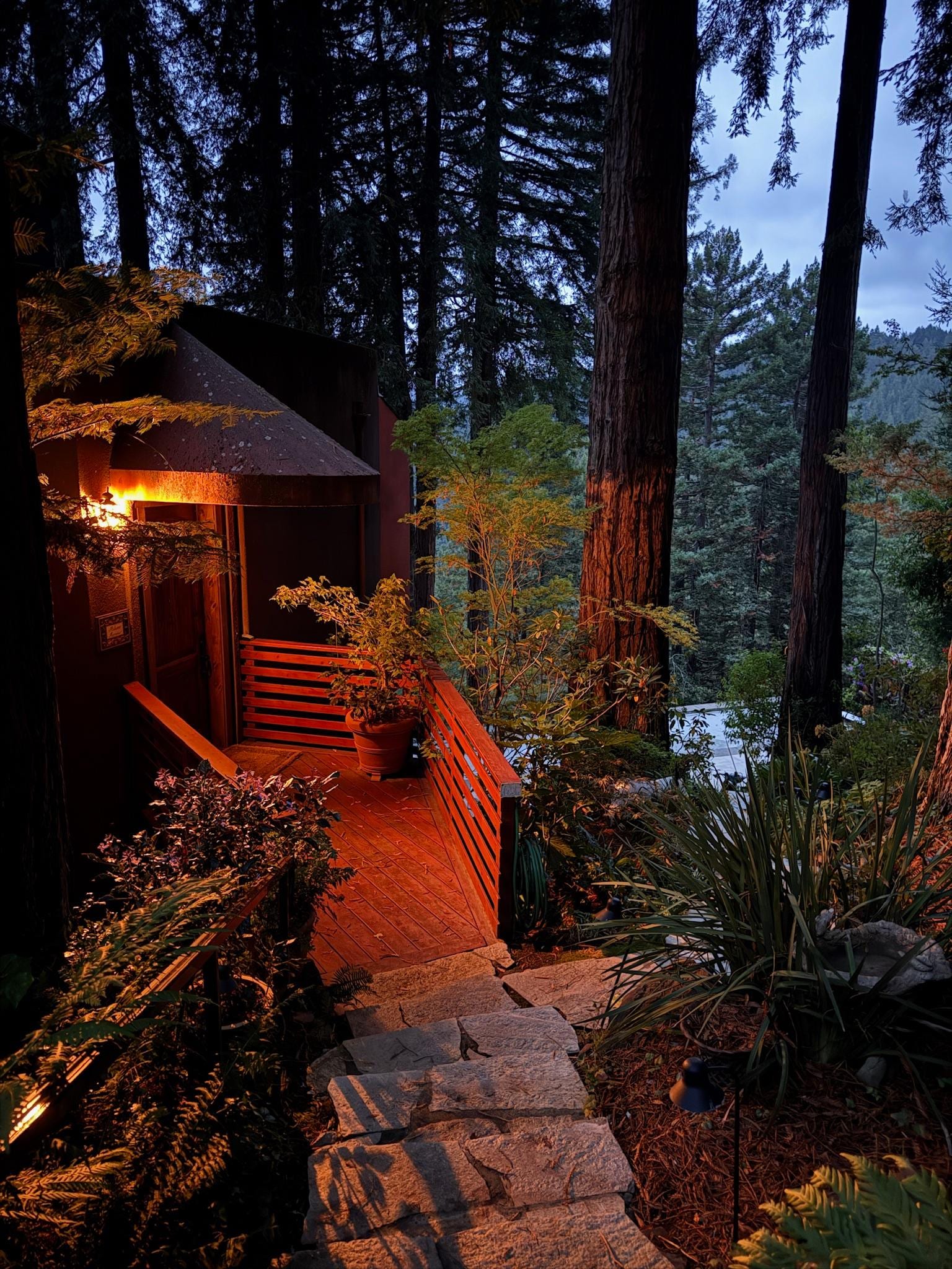Once you have driven up Summit Avenue (the last part of the drive up to Palazzo Marzino is very steep) you will agree, This is totally it! From the undeniably awesome views of the Russian River valley to the lifetime's adventures worth of globally sourced art, this modern-day castle in wine country is epic. Once inside the iron gate, decorated with a set of cat & dog friends (the property owners are more than passionate about saving animals) Palazzo’s entry is down a set of garden stairs. The entry stairs lead you to a huge wooden front door. The key to the front door is housed in a lock box to the right of the doorway (code to emailed separately). If you have arrived via a Tesla, there is a charger inside the garage.