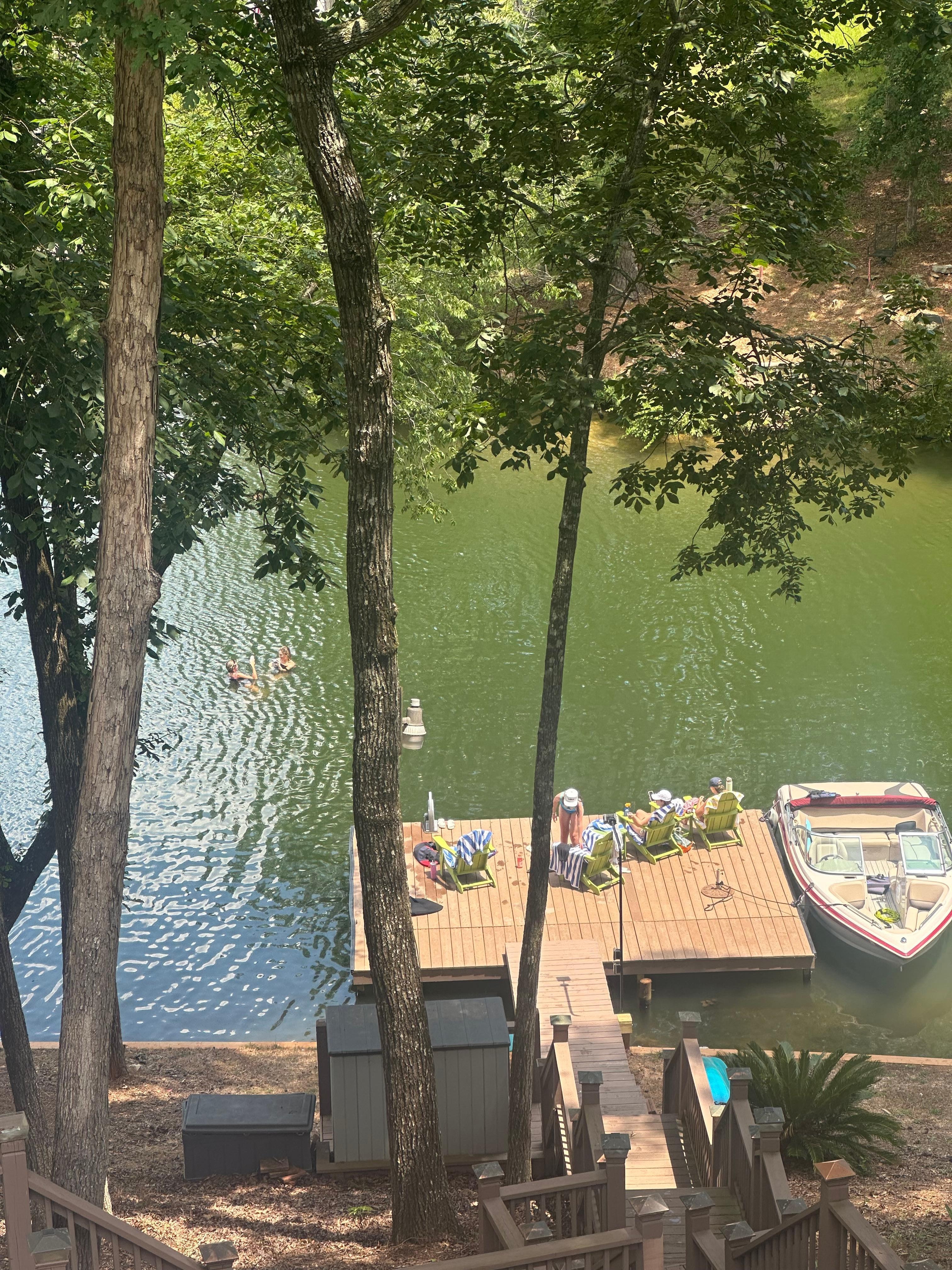 Outdoors, the deck and walkway have 4 chaise lounges for enjoying the view and sun. At the dock you can relax on our Adirondack chairs and watch the herons, ospreys, hawks, ducks and turtles. Or trying your luck fishing for the carp, bass and crappie that make the lake home. Feel free to swim in the lake at the dock using the swim ladder. The shed has floatation devices and life jackets, an electric pump and fishing gear and rods. The lake is ~11 feet deep at the end of our dock. Please don't swim near the boat lift to avoid injury. At the front of the house, the porch offers plenty of seating and ceiling fans where you can relax and watch the hummingbirds. You'll also have access to the two car garage next to the front porch where you'll find the propane and charcoal grills.