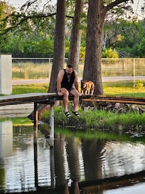 House overlooks fishing pond and private Guadalupe River frontage for kayaking , swimming and tubing. Water in river is shallow enough for small children on property line with deeper pools down stream for fishing.