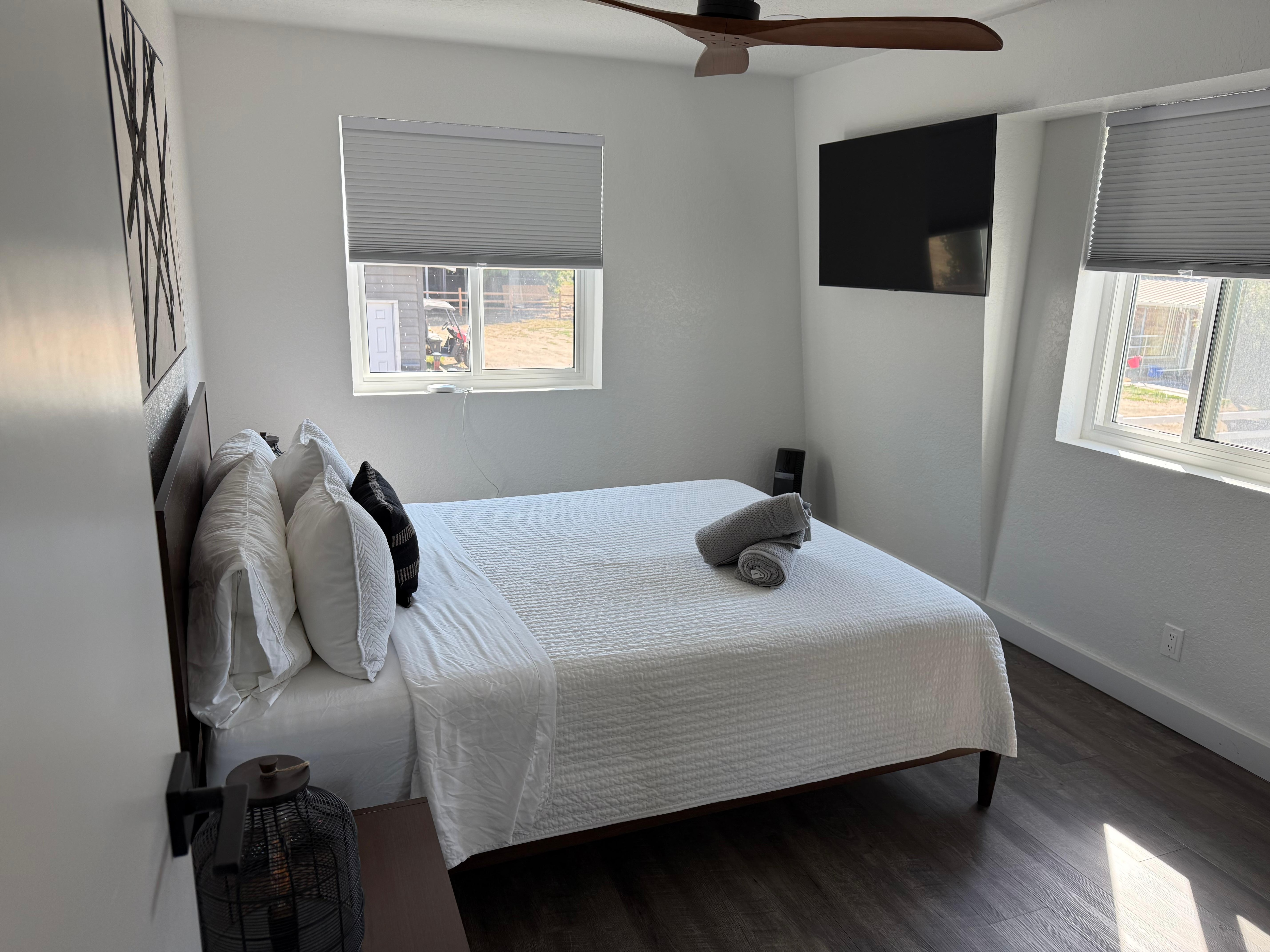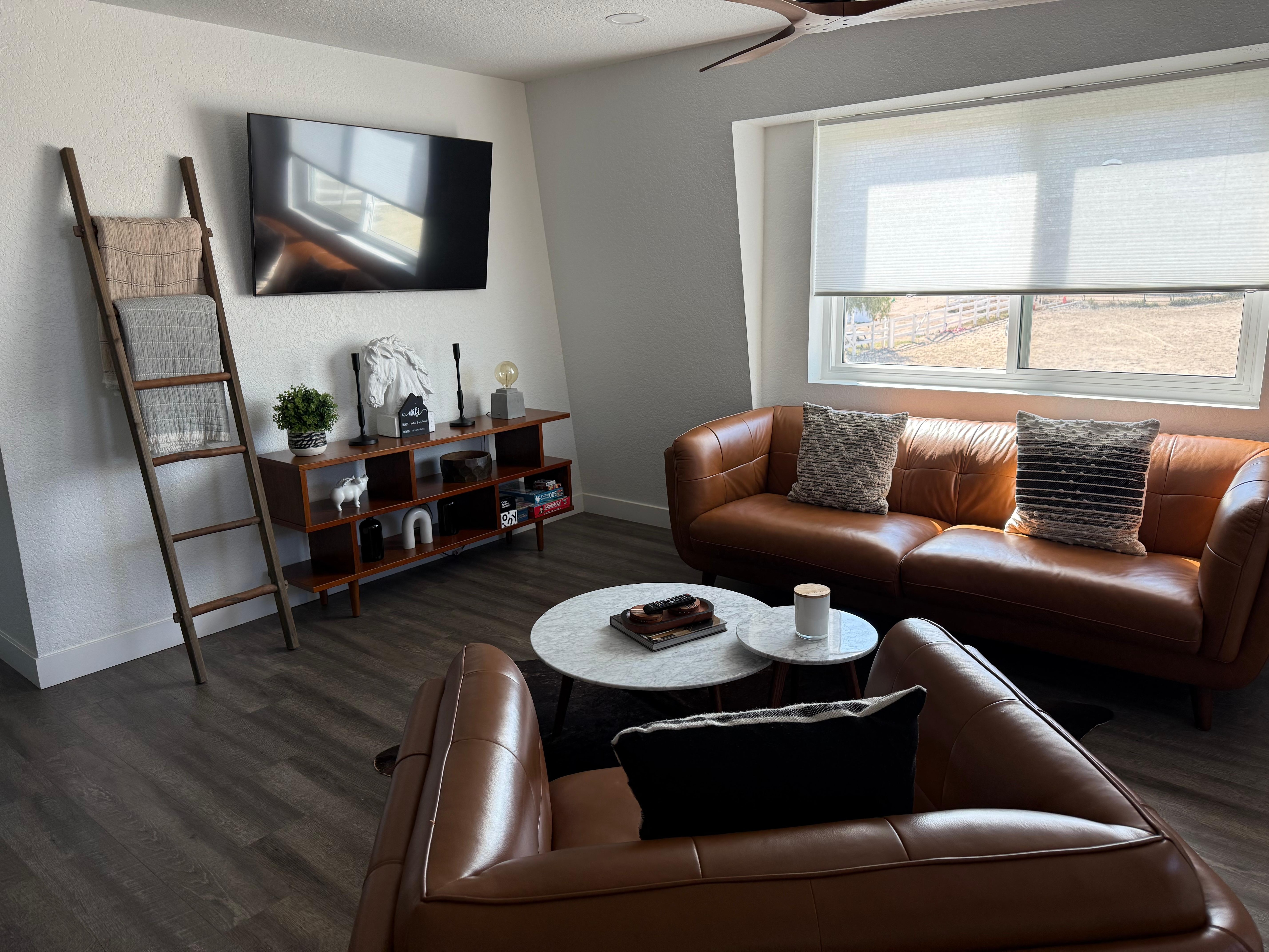 Enjoy a newly remodeled, second-story unit with two bedrooms, one bathroom, and views of the large horse arena. This stylish unit overlooks a the entire ranch property and is located in Temecula wine country and the quaint old town communities of Temecula and Murrieta. Relax and enjoy the scenic mountain views and sunsets from this welcoming, cozy Dutch barn unit with a private patio deck. Although it's just three minutes from the 15 freeway, it feels like you're right in the middle of Montana.