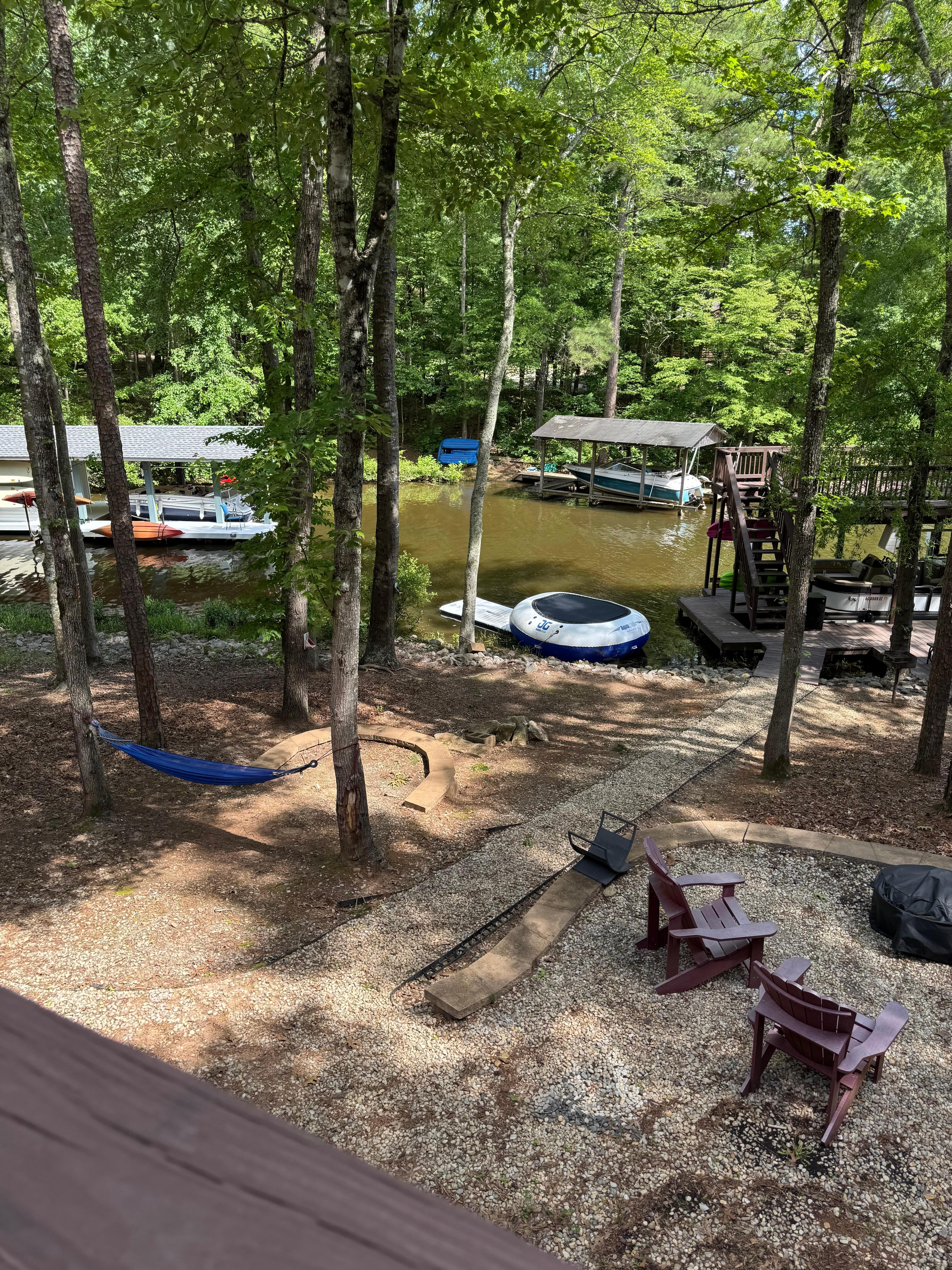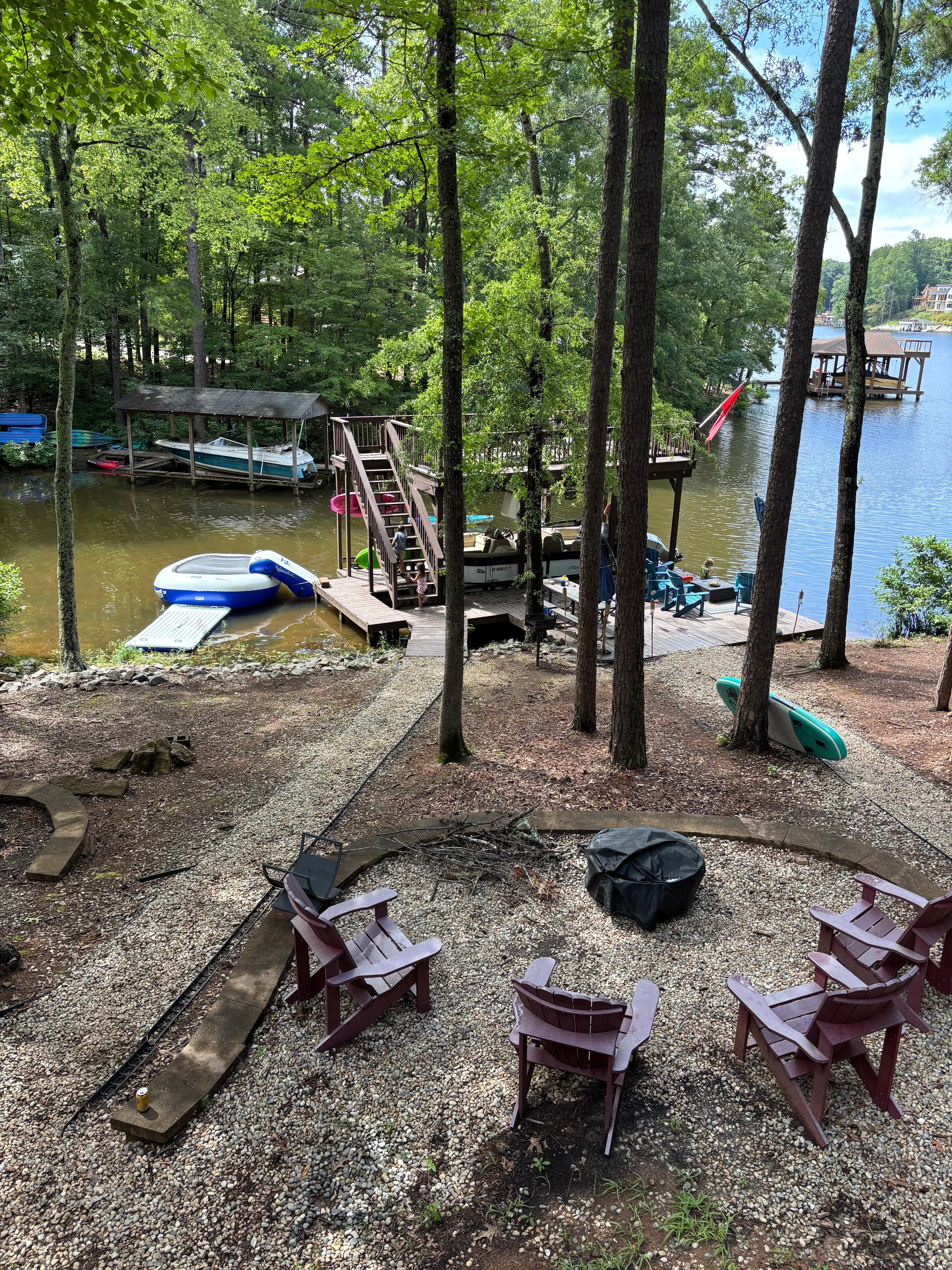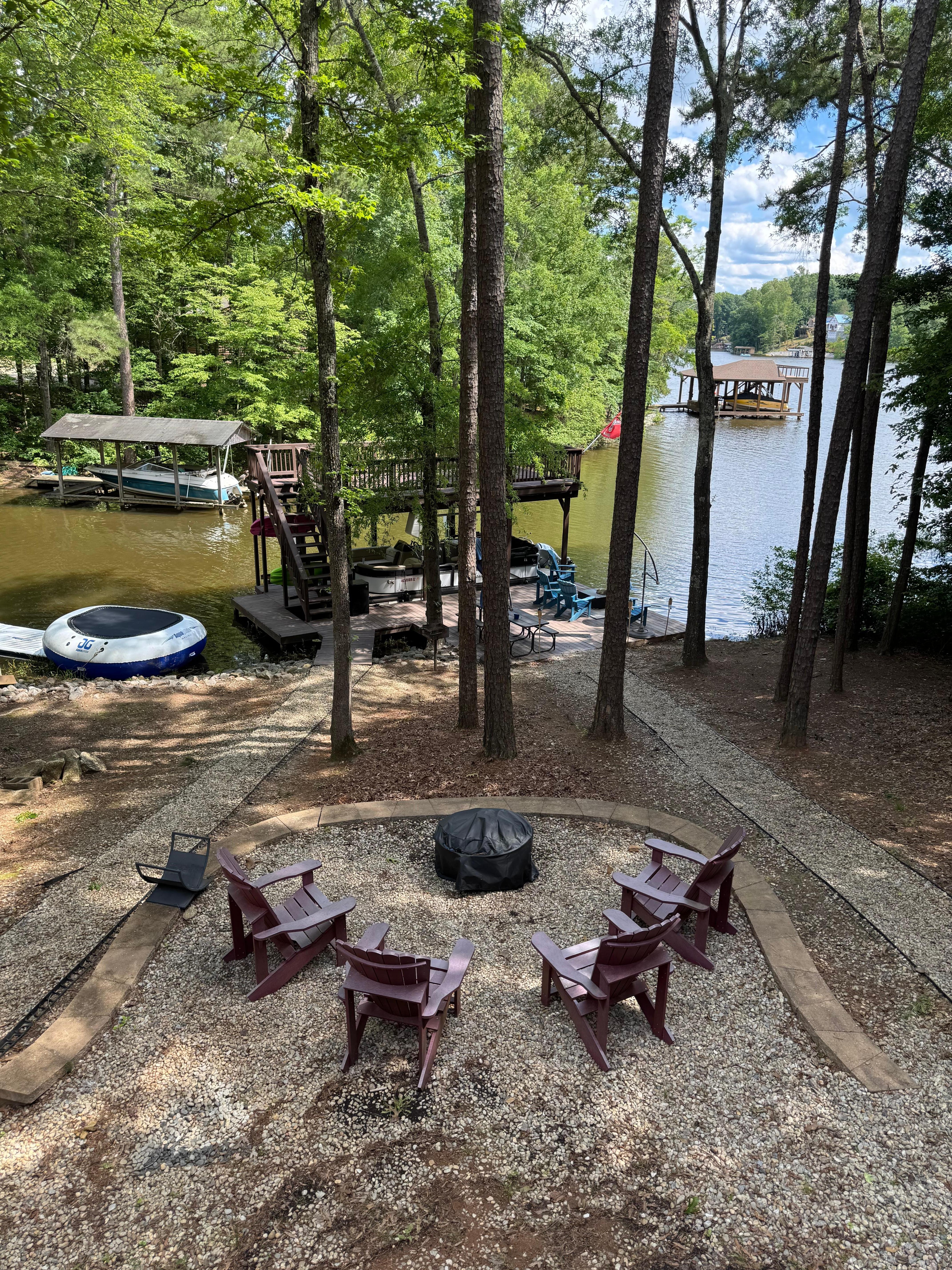 AMENITIES offers the opportunity to keep warm on those chilly nights with our electric fireplace or better yet, grab some smores and sit out by our large fire pit! Want to eat some lunch by the water while the kids play on our inflatable lake island, floating water mat or water trampoline? There is a charcoal grill and picnic area right by the dock! If you're not a water person, play a round of cornhole, enjoy the tire swing, or utilize the 4-burner gas grill while watching the little ones use the toddler slide and single swing! Forgot life jackets or water shoes? Look no further!