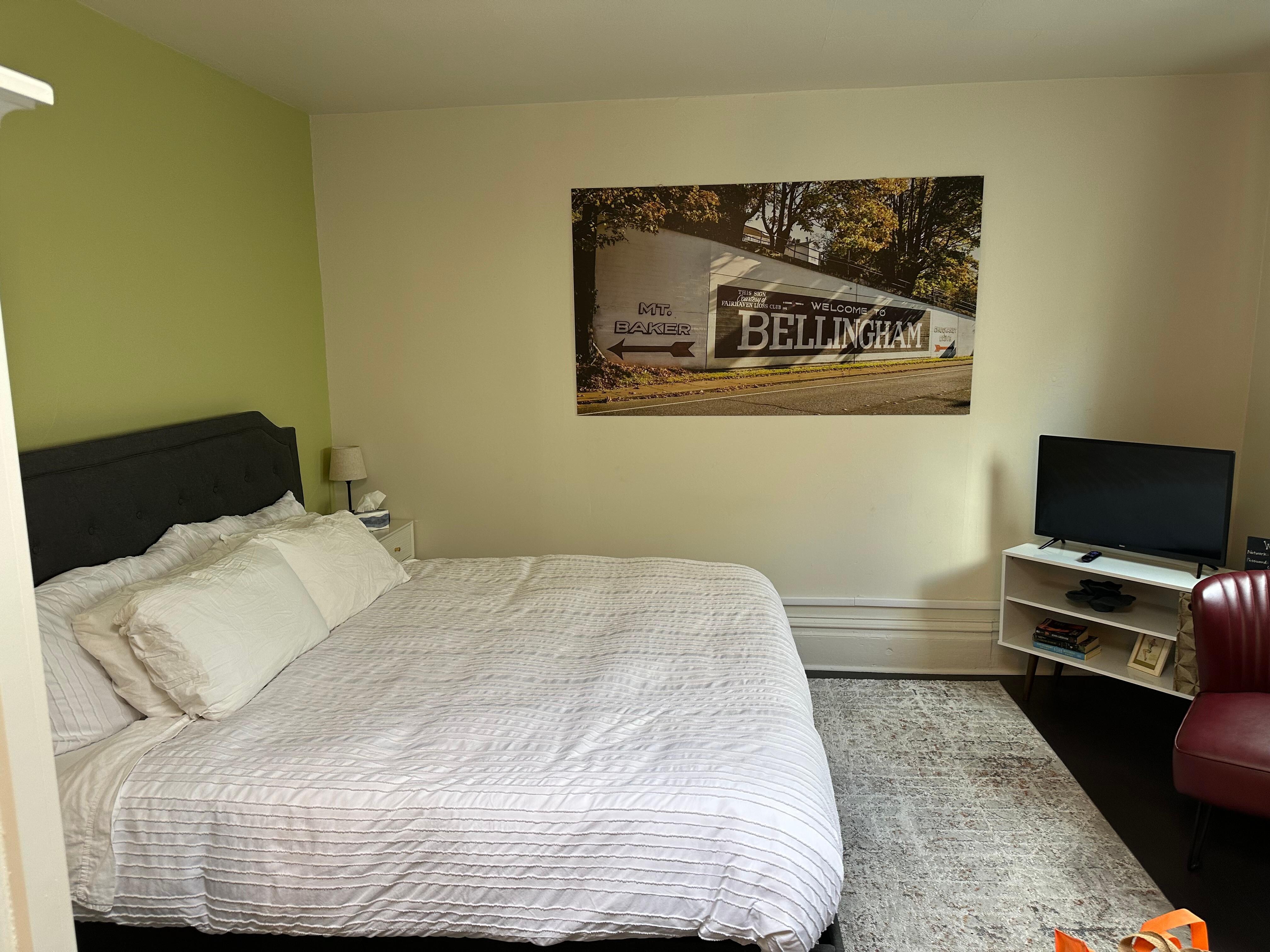 Welcome to the District Studio in the historic Fountain District in Bellingham. This is a newly renovated space located on the second floor of a charming building above Diamond Jim’s (breakfast restaurant). You will step into a retro vibe with clean, modern amenities, new appliances and free access to a washer and dryer. This space sleeps 3 comfortably with a king size bed and a new full-size sleeper sofa. The space is in close proximity to downtown, waterfront, restaurants and breweries.
