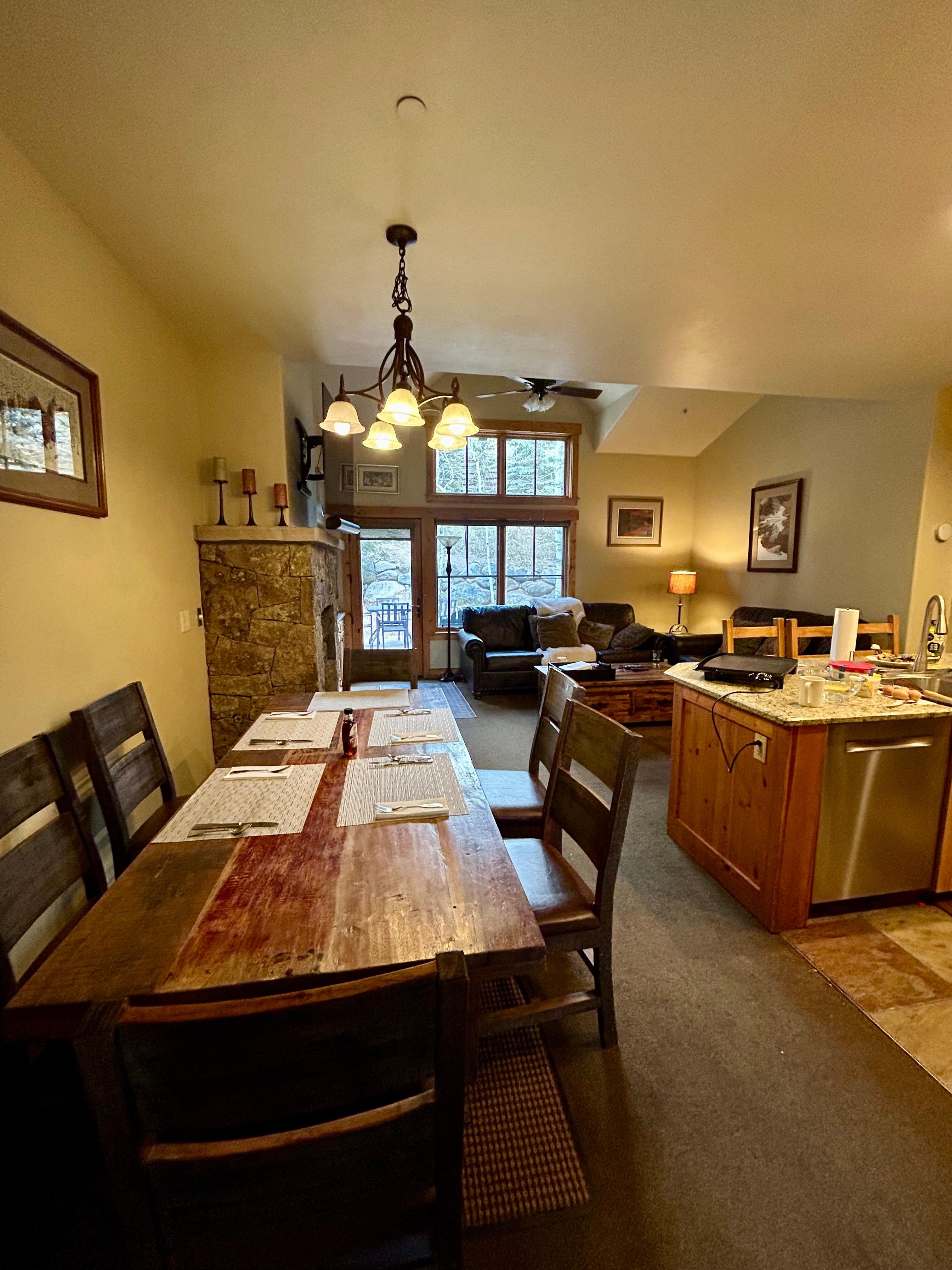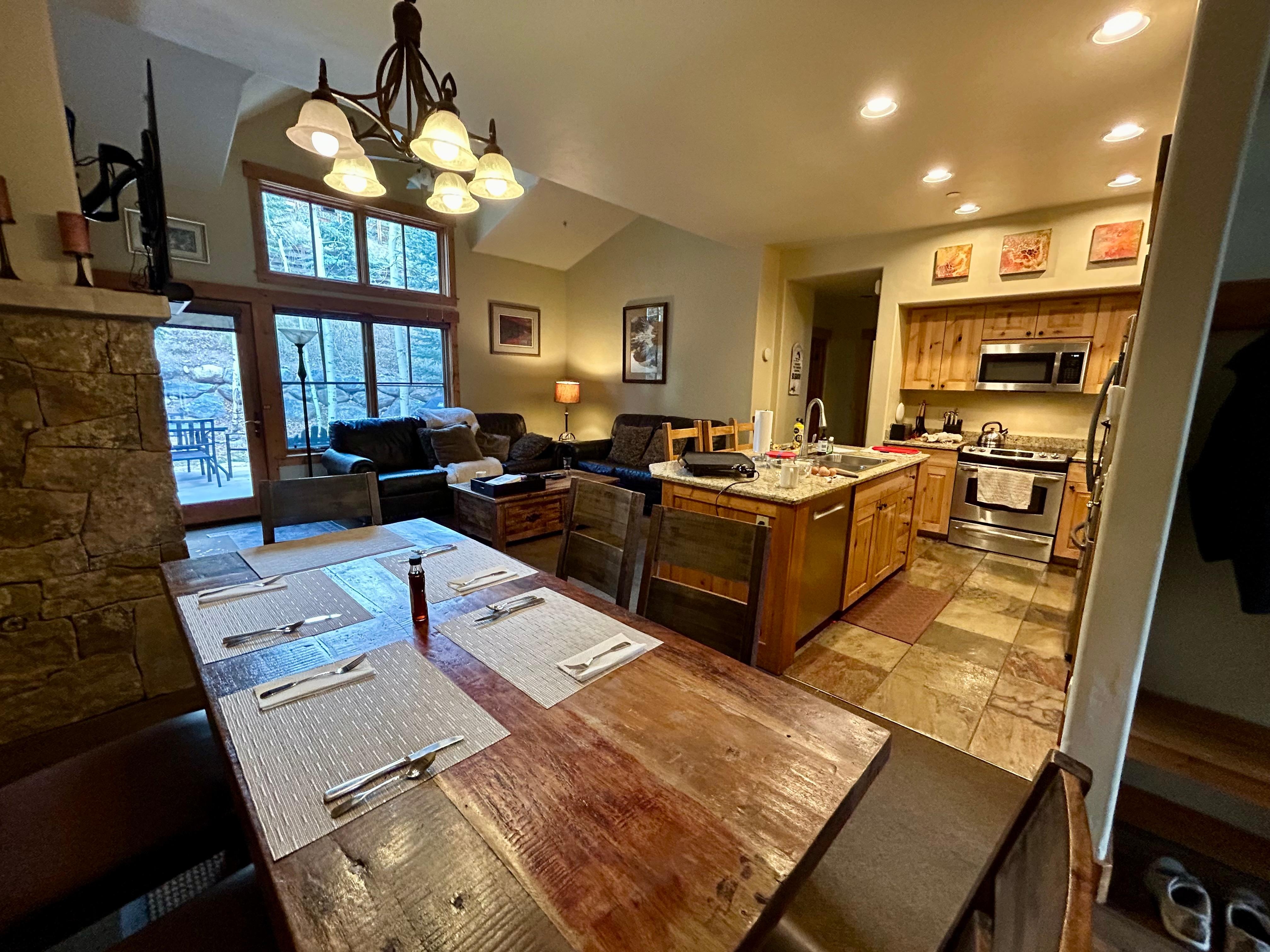 Step into the inviting living area, where vaulted ceilings soar overhead, creating a warm and welcoming atmosphere for all who enter. Gather around the stone gas fireplace and Smart TV, where evenings are filled with warmth and entertainment, setting the perfect ambiance for reconnecting with friends and loved ones amidst the mountain's embrace.