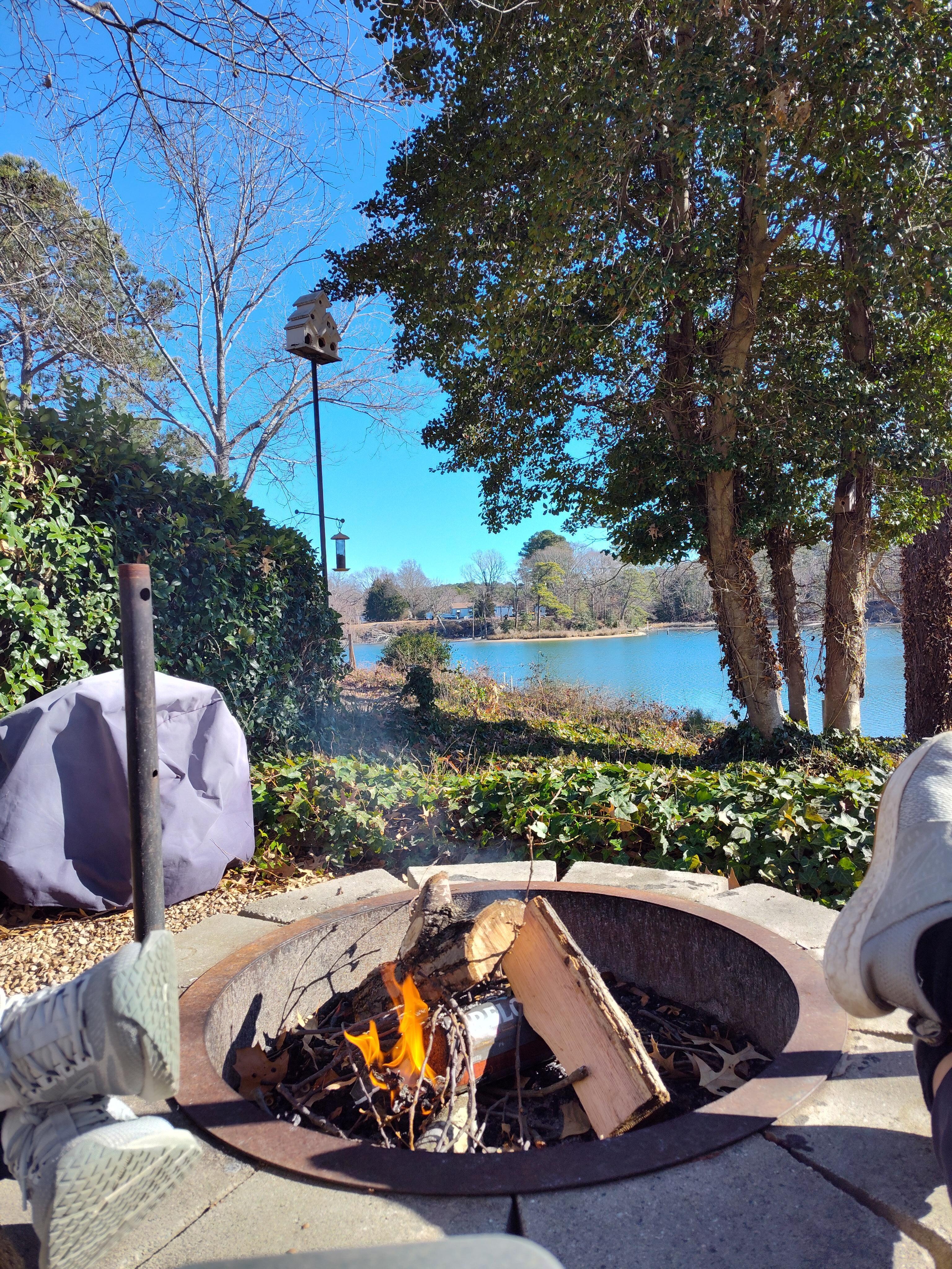 --Patio: Private patio facing the river, with an outdoor dining area, seating area and fire pit.