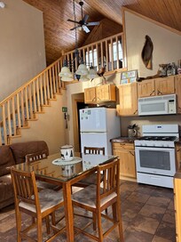 Hunters Hideaway is the last property at the end of a dead end gravel road, secluded from the busy every day things of town. There will be nobody driving by and no neighbors to see. This property is truly a backwoods rustic retreat. The cabin is located on 5.5 acres of mostly wooded land with a small backyard and large turnaround driveway. Hunters Hideaway is a simple cabin with 2 bedrooms; each with a full size bed, closet & dresser on the main floor. Also on the main floor is the full kitchen, living area with gas fireplace, ample seating, and TV/DVD/Roku(smart TV) (sorry, no cable or dish). We do have Wifi, no password necessary. Also on the main floor is a full bath with tub/shower and separate washer & dryer in the mud room. Off of the living area is a patio window leading to a patio with built in fire pit and a gas grill. In the living area is the stairs leading to an open loft containing two full beds and a bathroom with shower. Outside there is a covered front porch, shed with 3 separate dog kennels each with barrel and bedding. The kennels are covered and on a slab and properly cleaned between every renter. (Please request to have pets in the cabin)