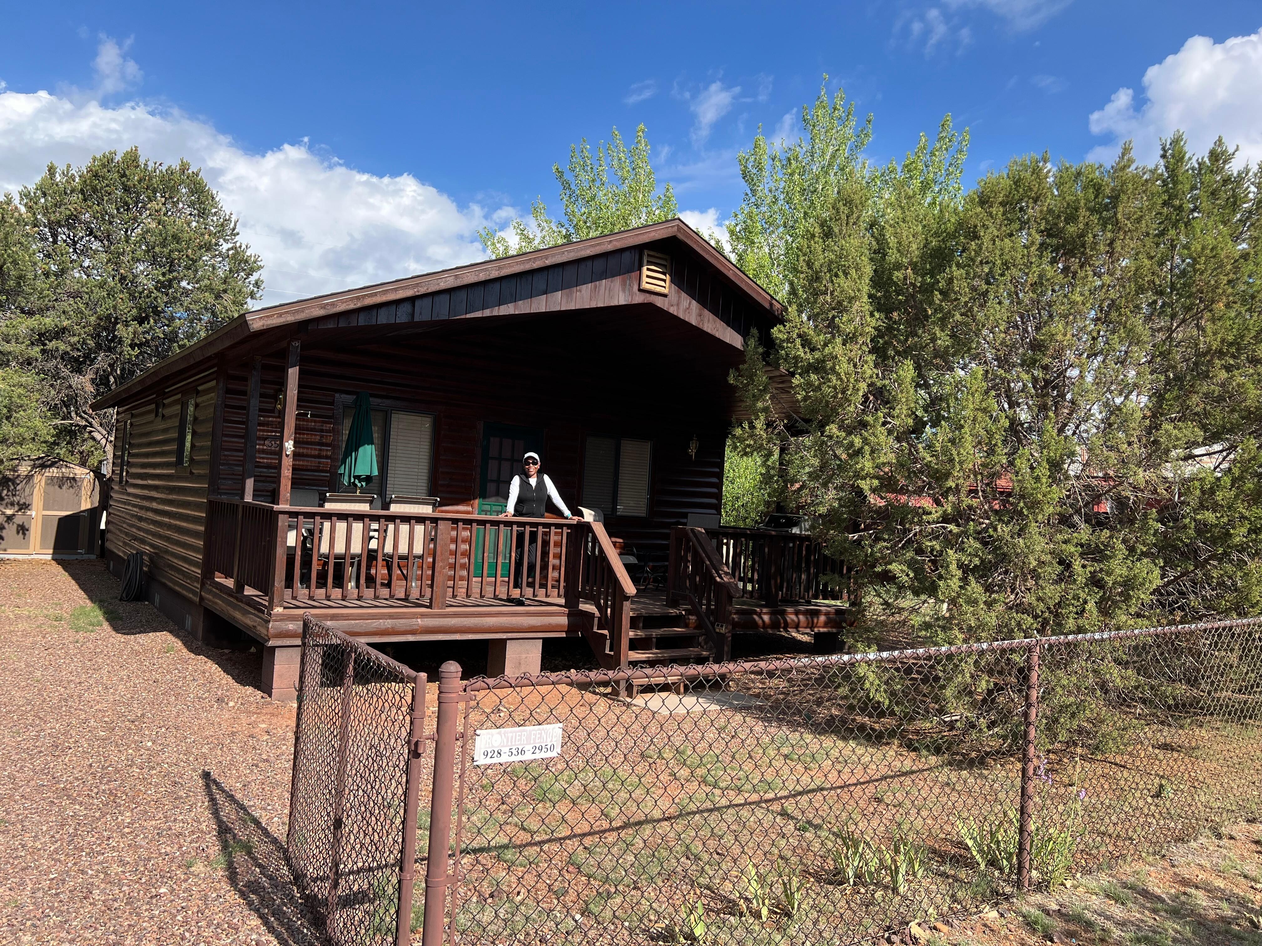This cabin is a wonderful escape from the hot desert summer to the cool mountain pines at 6,600 elevation. The covered deck provides morning sun and cool afternoon shade. Inside the eat-in kitchen has all the necessities for cooking and dining. A cozy living is set with a sectional sofa and chairs, gas fireplace, cable TV and DVP (with disks to view.) The bedrooms both have ceiling fans, dressers and closets, with Queen bed in 1st and bunk bed in 2nd. The full bath has a tub/shower combination. A stack washer dryer is available. The yard is fenced to keep unwanted critters out and pets in. Thdecl is outfitted with chairs and a dining table. Enjoy the night skys to view the abundant stars. You are walking distance to June's Cafe or the Red Onion restaurant. You are going to love it here.