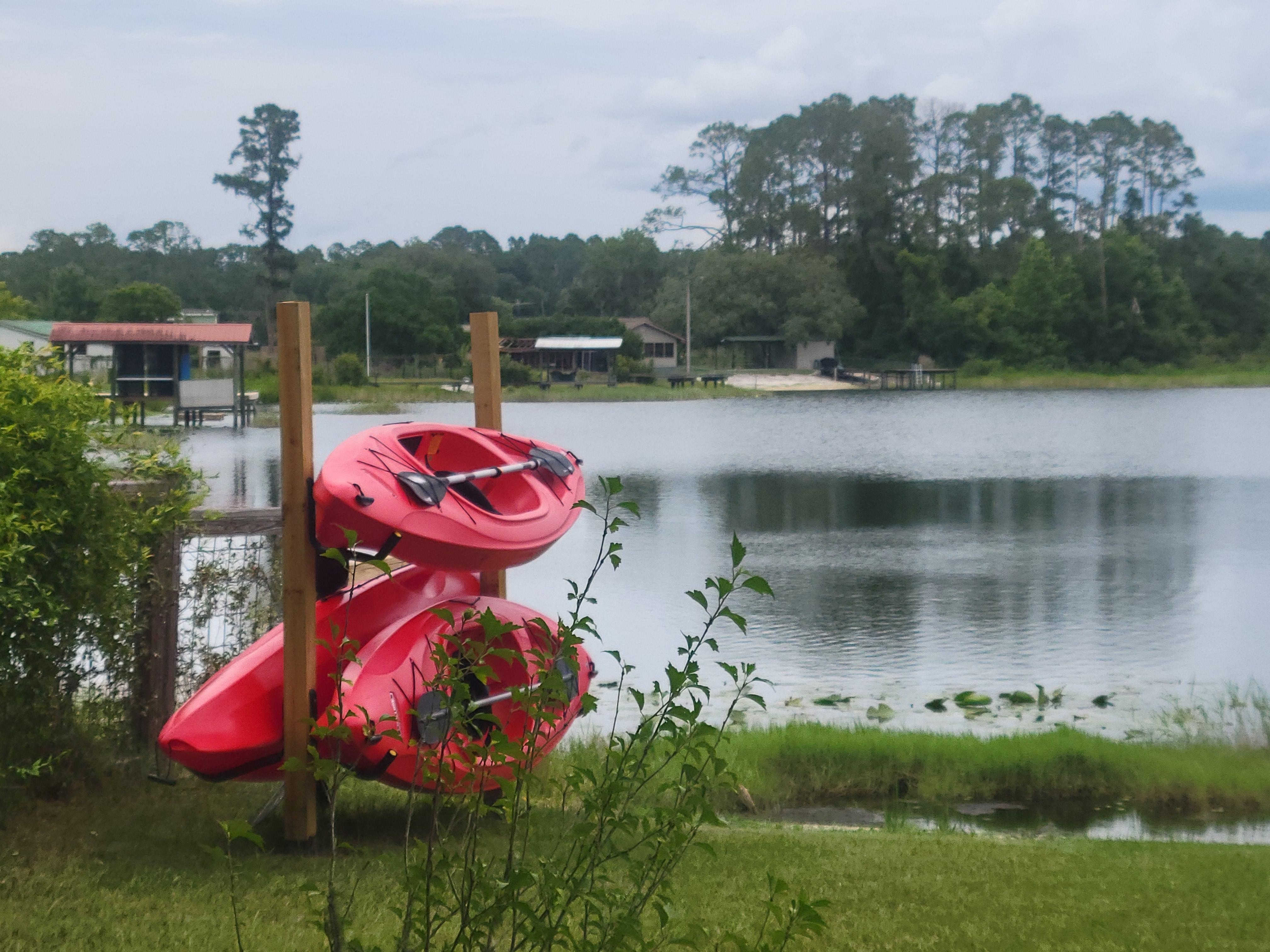 Outdoor living: Gas grill (propane included). Patio table/chairs. Two decks. Dock. Partially fenced yard. Tree fort. Kayaks.