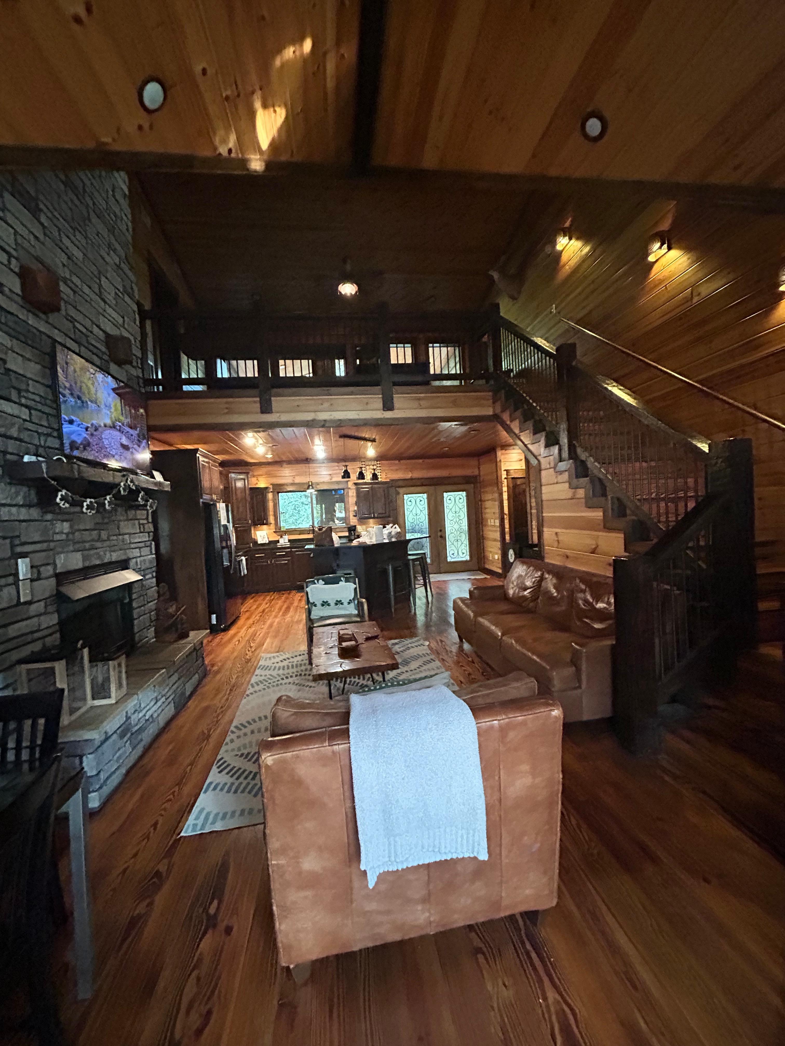 Walking up to the cabin you will take in the gorgeous wrapping deck with comfy spaces to enjoy your morning coffee or afternoon quiet time. When you enter the front of the cabin, you are welcomed by warm wood and open spaces, incredible light, and comfortable places to settle in and relax. The great room has spectacular floor-to-ceiling windows which bring the outside in, as you enjoy views of nature and the mature pine forest that surrounds. Get cozy watching a movie on the 55" mounted TV or just enjoy watching the gas-lit fireplace flicker below as you start to unwind.