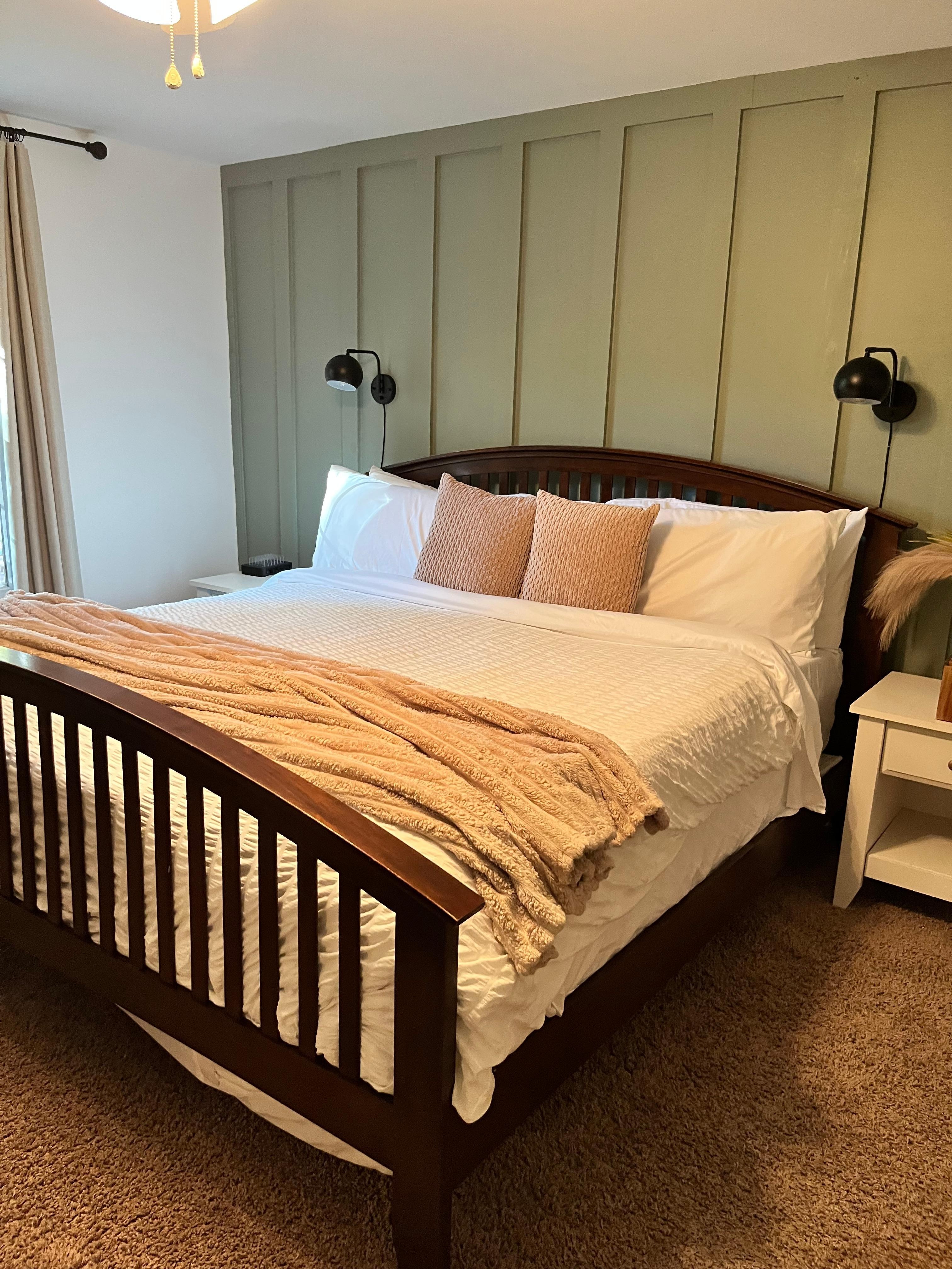 There is one bedroom with a king bed and attached full bathroom as well as an additional half bathroom in the game space.